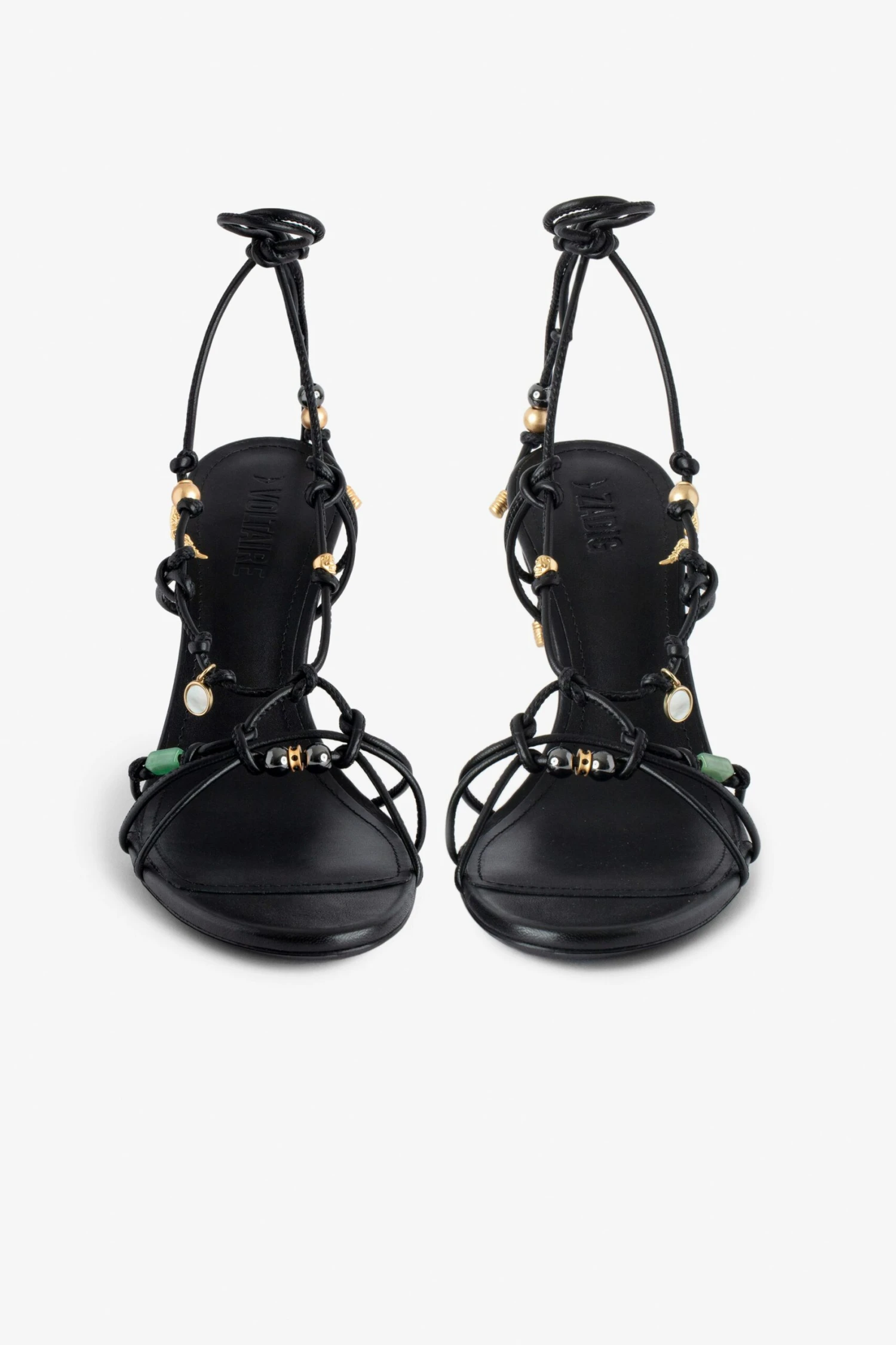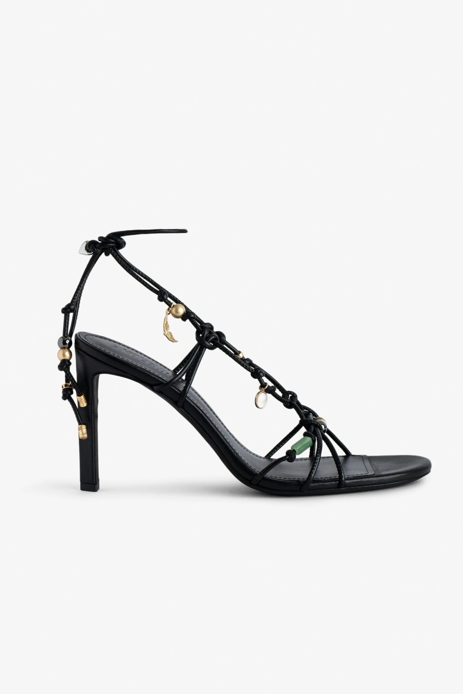 Women’s black smooth leather heeled sandals with tied straps and charms.