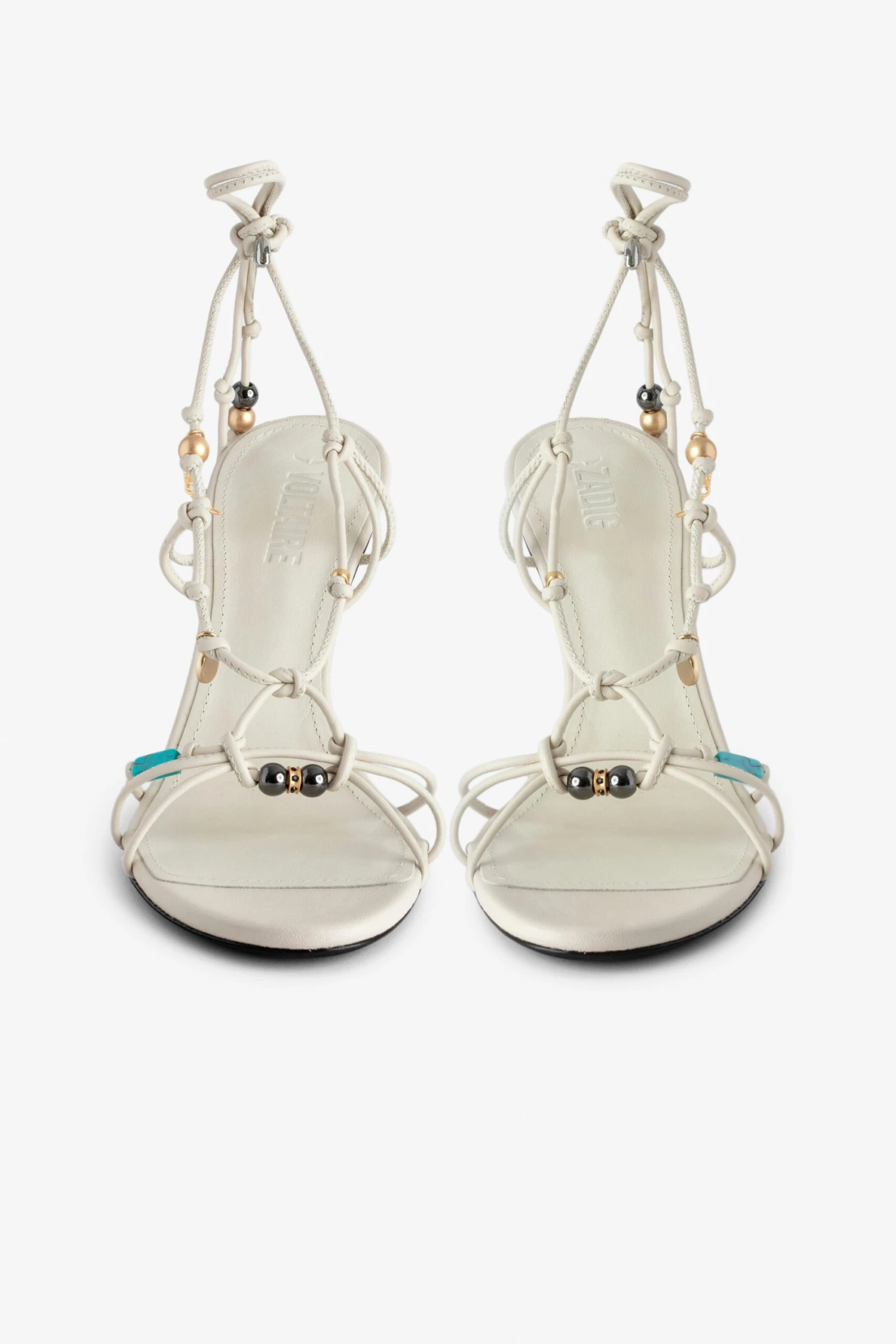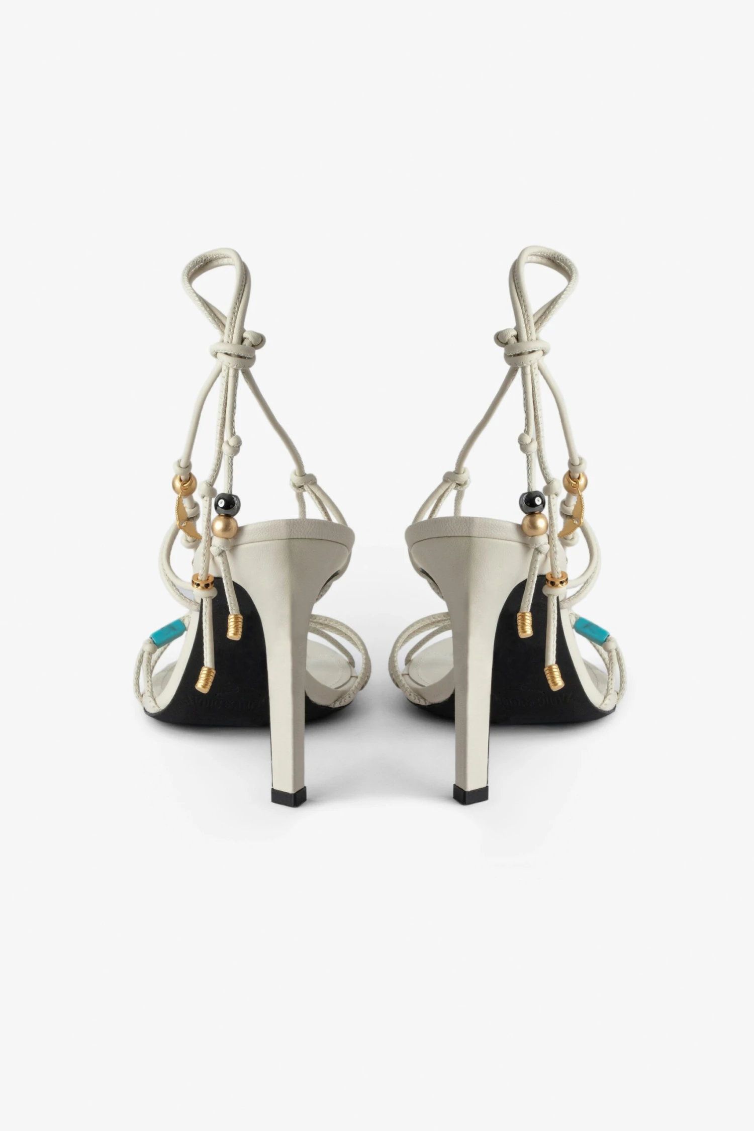 Women’s white smooth leather heeled sandals with tied straps and charms.