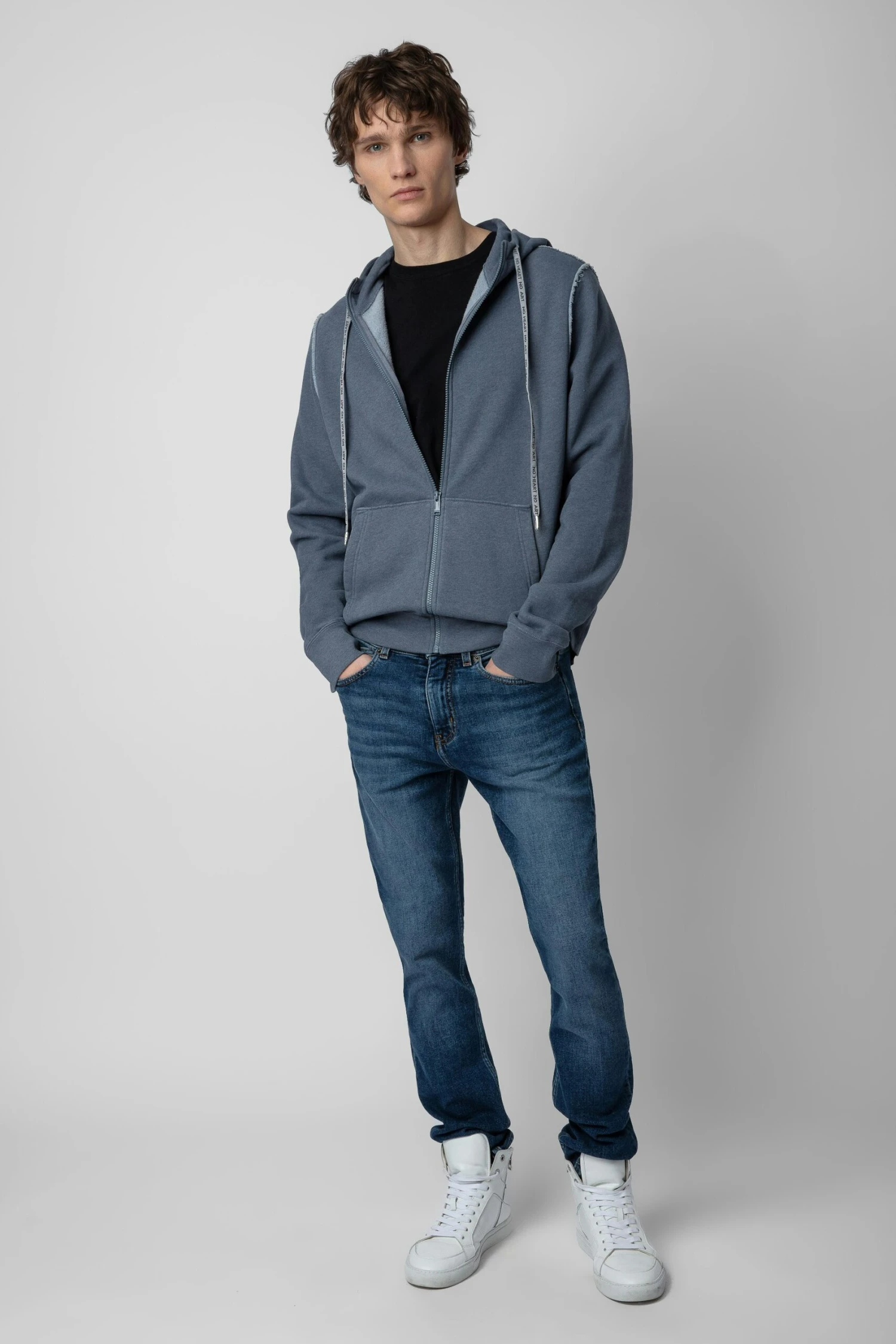 Men’s blue cotton zip-up fleece sweatshirt with motifs and tags on the back.