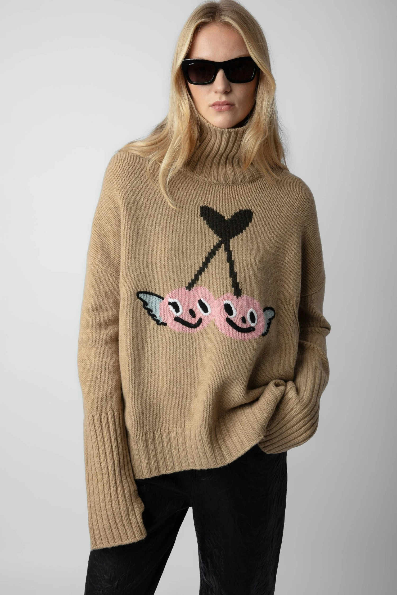 Customized details designed by Humberto Cruz, an artist and illustrator from San Diego. Influenced by pop culture, fashion and colors, he describes his work as spontaneous and quirky. – Women’s Nut brown merino wool sweater – Mock neckline – Long sleeves, side vents, ribbed trim and thumbholes – Intarsia jacquard cherry motifs and pointelle ZV signature Model is 180 cm / 5′ 10″ and is wearing a size S*Contains 100% RWS certified woolThe Responsible Wool Standard (RWS) guarantees animal welfare and respect for pastures. It also ensures end-to-end traceability of the wool through the supply chain