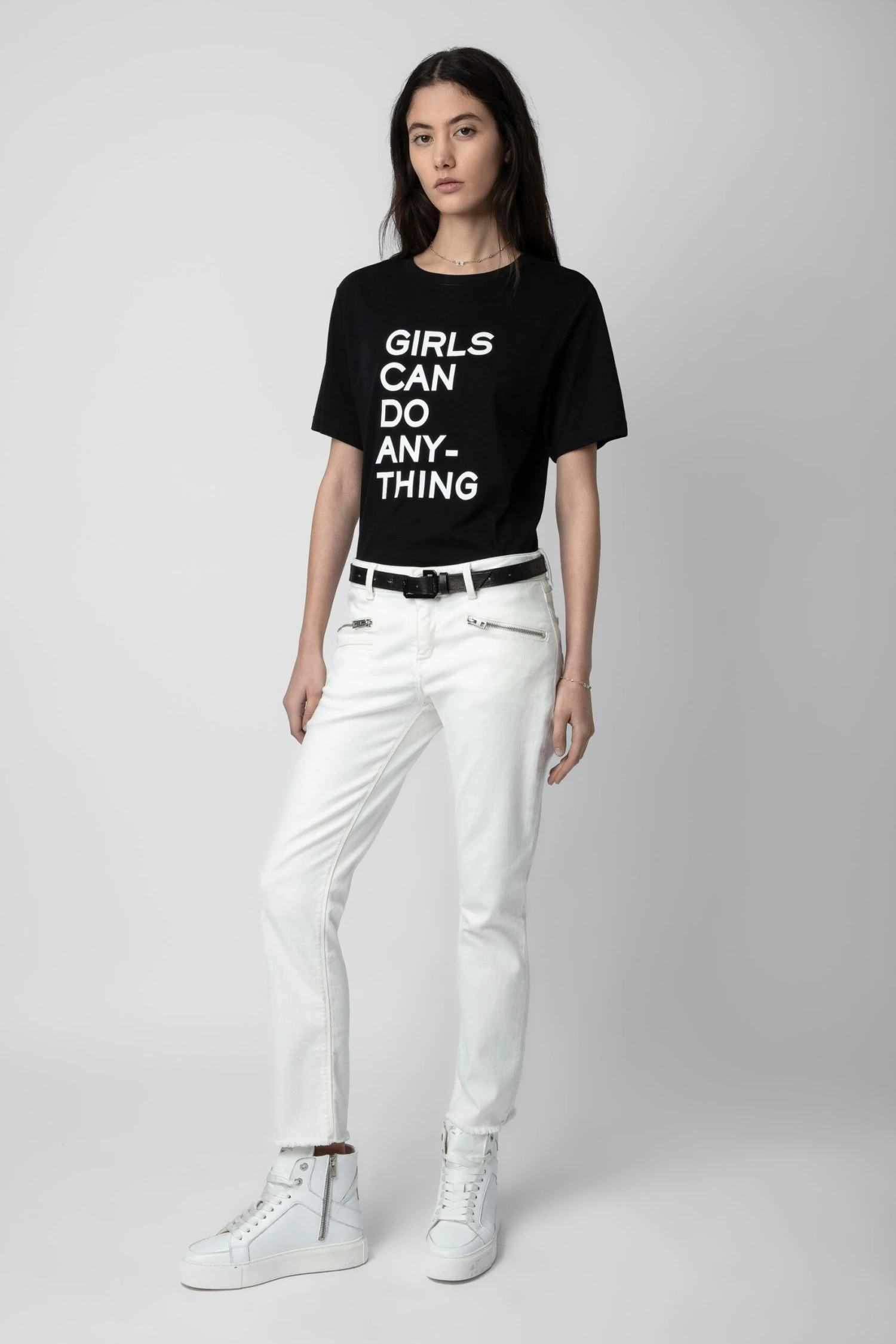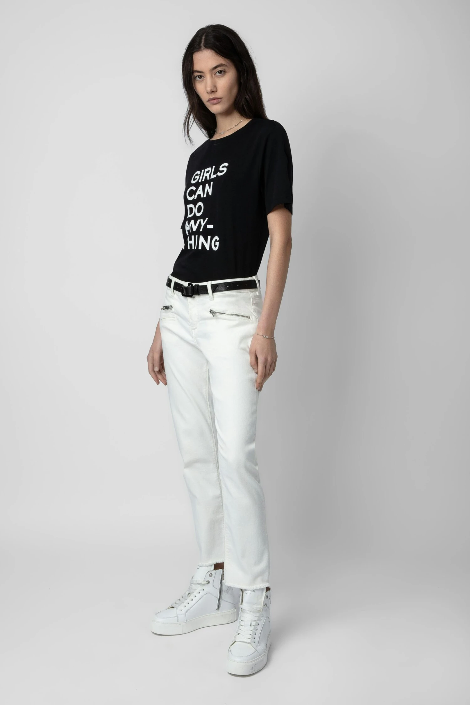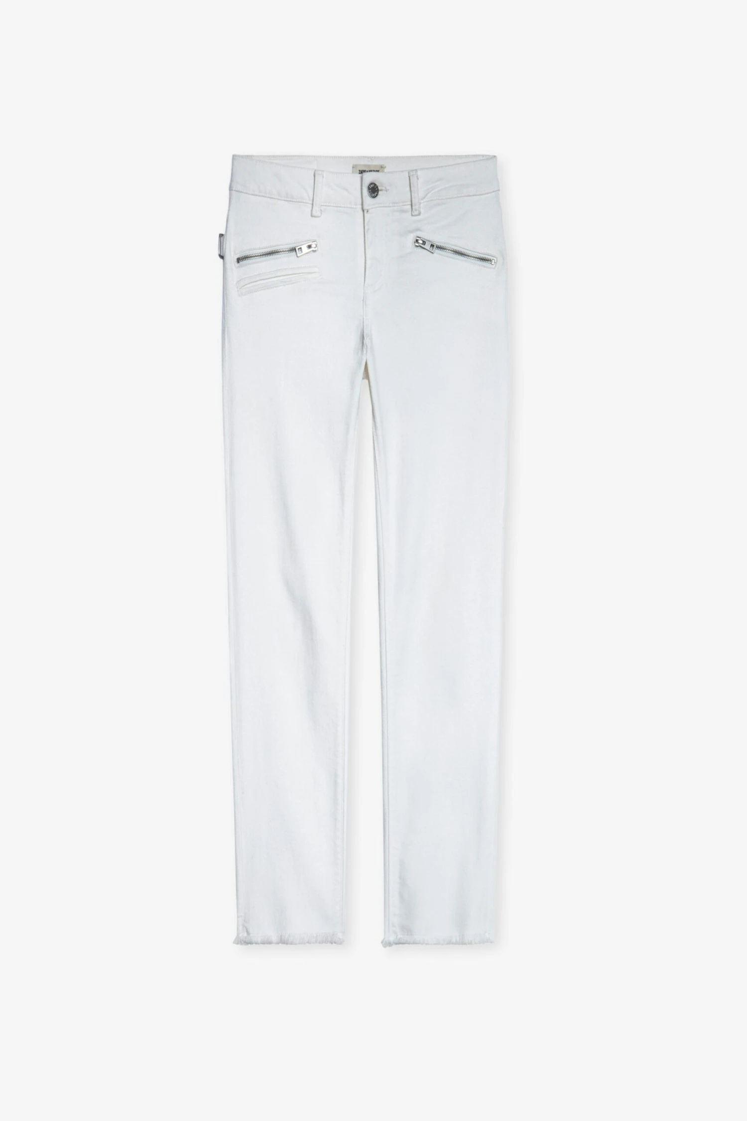 – Women’s ecru cotton slim-fit jeans – Shorter ankle length – Raw hems – Zipped front pockets – 1 welt pocket – Belt loops – Metal half-moon on the sides – ZADIG&VOLTAIRE leather label on the back