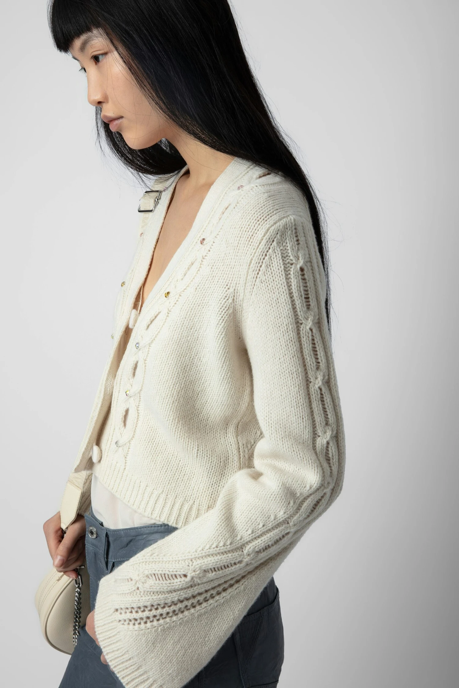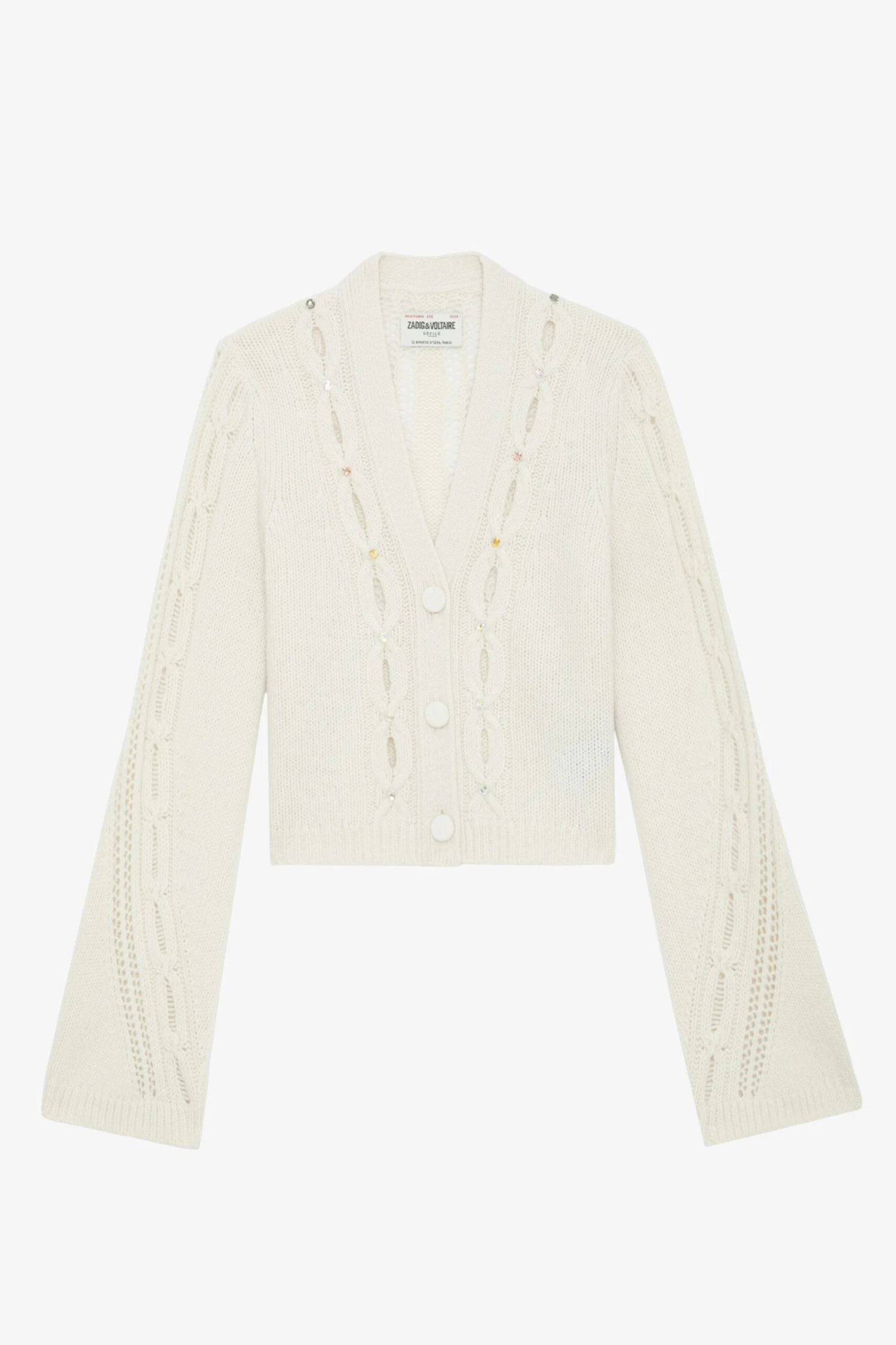 Ecru long-sleeved merino knit cropped cardigan with openwork details, cable stitching and diamanté.