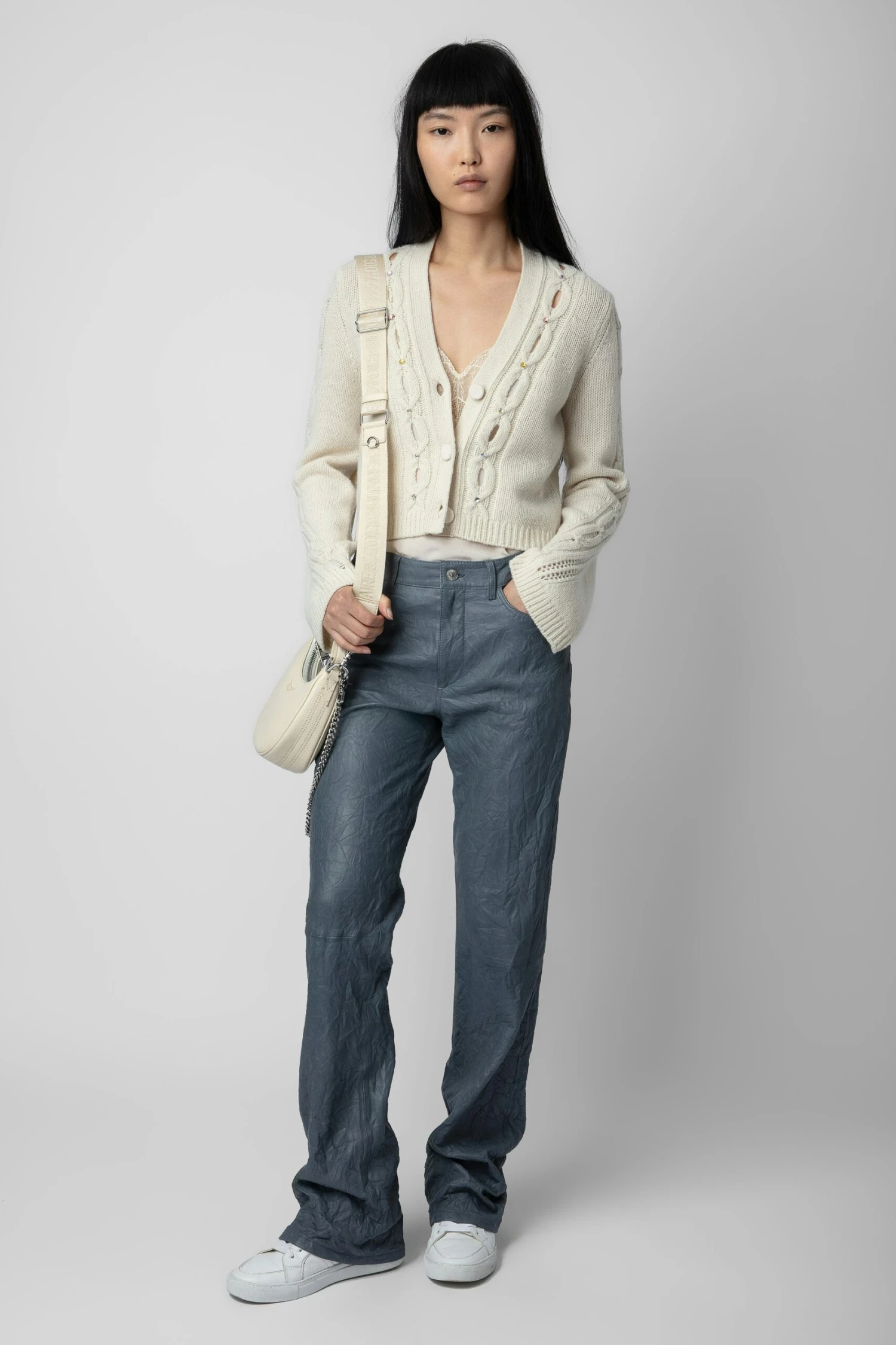 – Women’s ecru merino wool cropped cardigan – Openwork details, cable stitching and silver and gold diamanté – V neckline and button closure – Long sleeves and ribbed trim Model is 177 cm / 5′ 9″ and is wearing a size S*Contains 100% RWS certified woolThe Responsible Wool Standard (RWS) guarantees animal welfare and respect for pastures. It also ensures end-to-end traceability of the wool through the supply chain