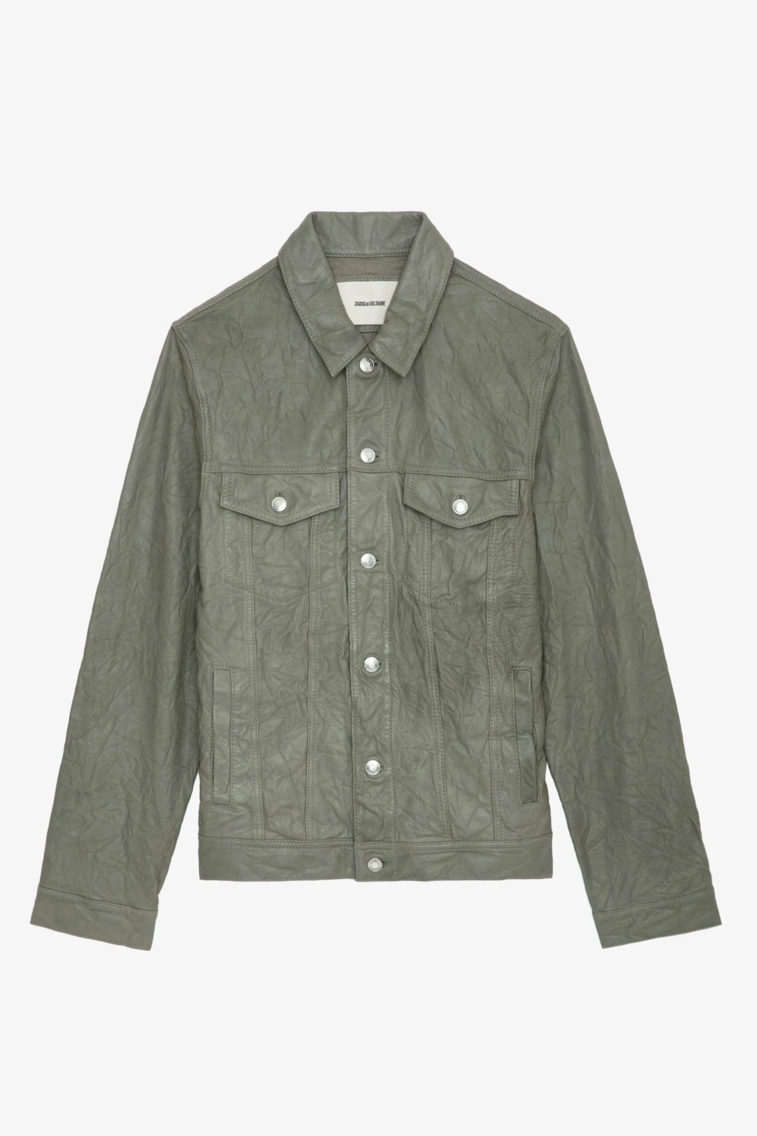 – Men’s crinkled leather jacket – Shirt collar – 2 flat button pockets on chest – Long sleeves with rounded cuffs – Snap buttons down frontModel is 188 cm / 6′ 2″ and is wearing a size M