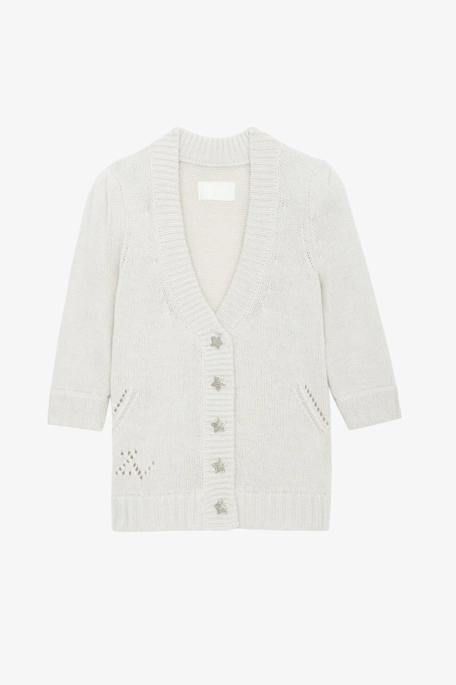 – Women’s ecru knit cardigan – V neckline and button fastening with rhinestone encrusted stars – Gathered shoulders and pointelle ZV signature – 3u002F4-length sleeves and ribbed trim Model is 170 cm / 5′ 6″ and is wearing a size S*Contains 50% of recycled cashmereGRS certification guarantees the presence and quantity of recycled material in the product. It ensures a social, environmental and chemical responsible management, as well as an end-to-end traceability of the recycled material through the supply chain.