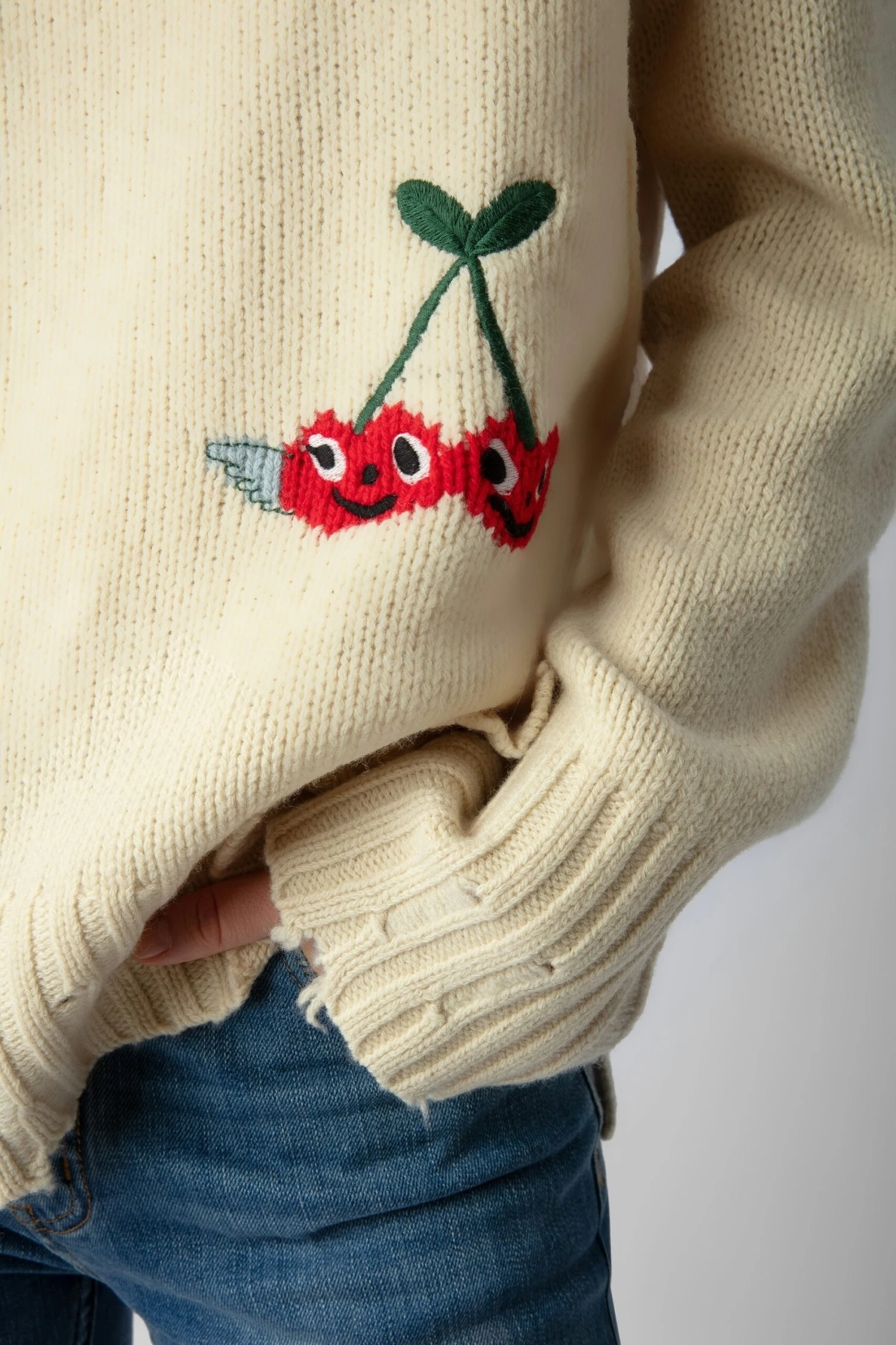 Ecru distressed-effect merino wool sweater with mock neck and customized detailed designed by Humberto Cruz.