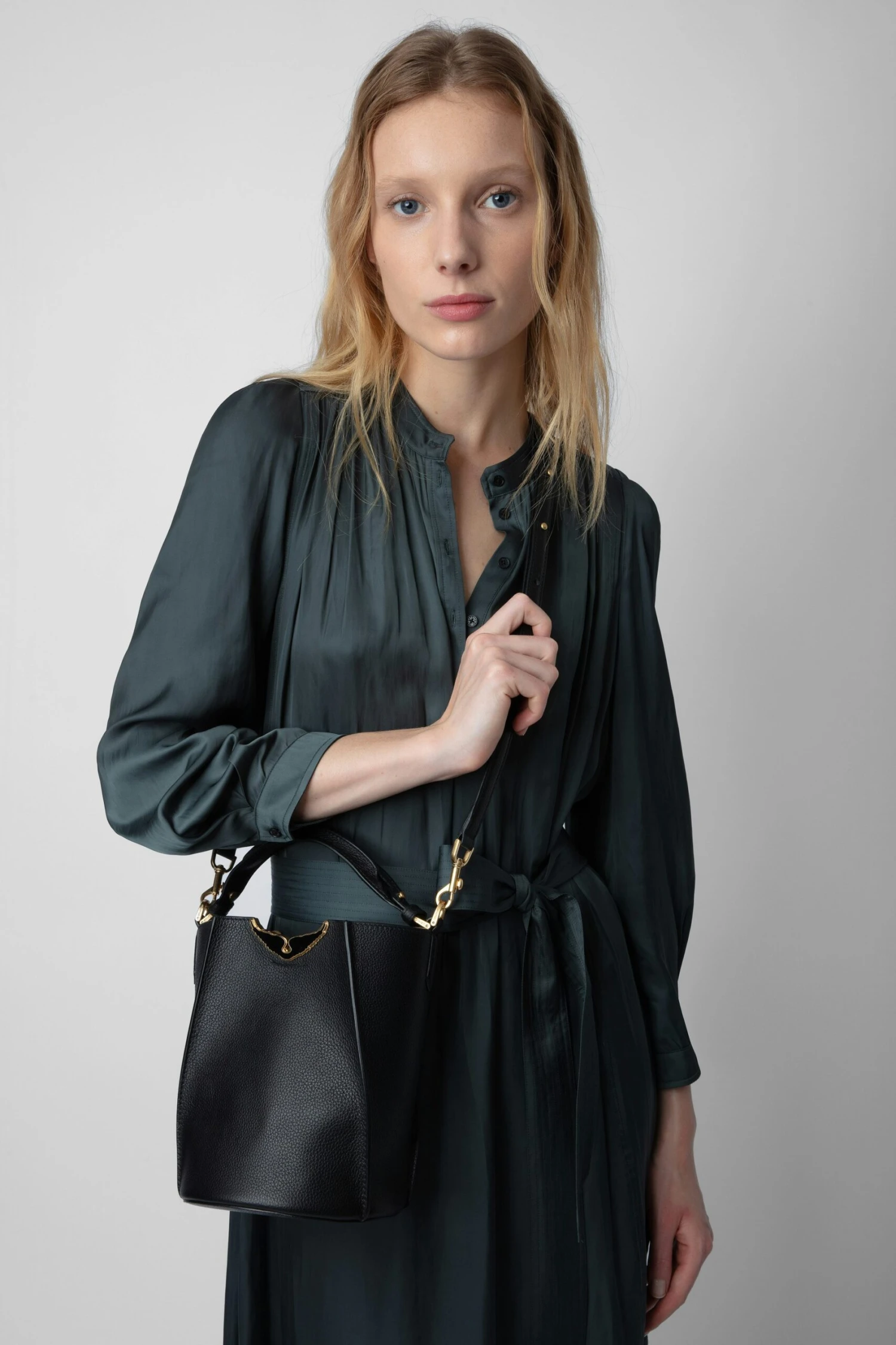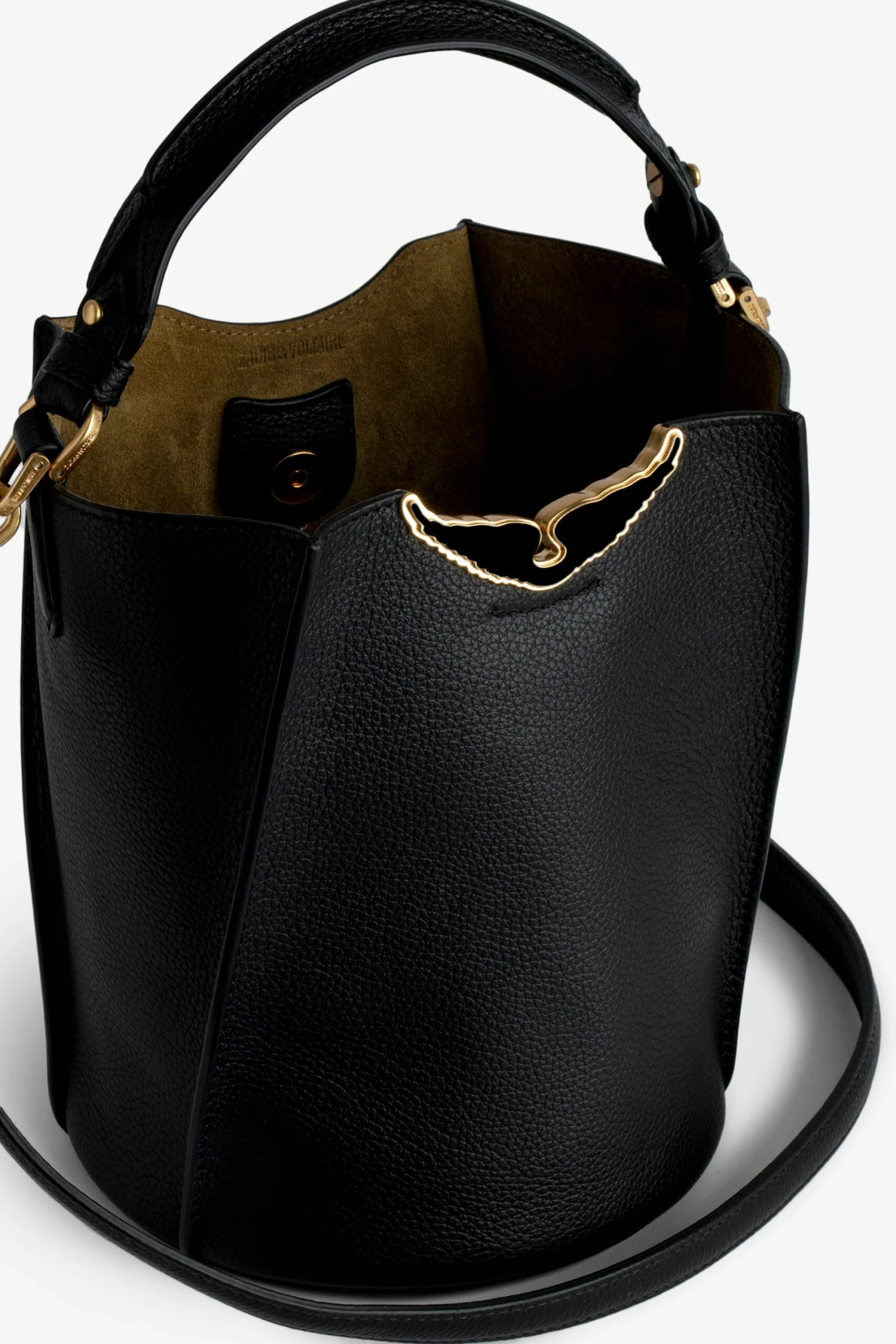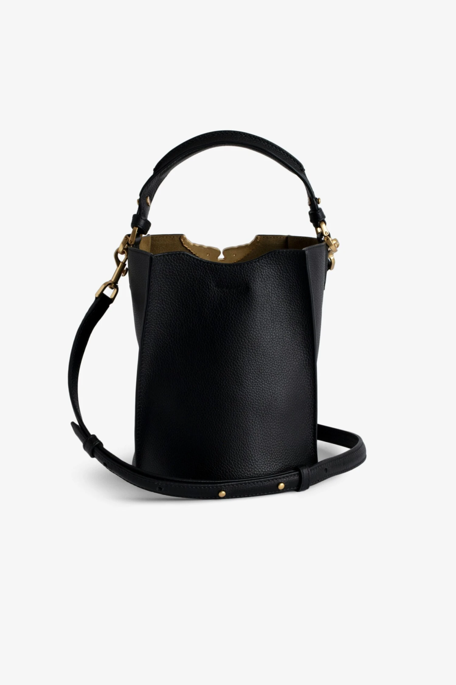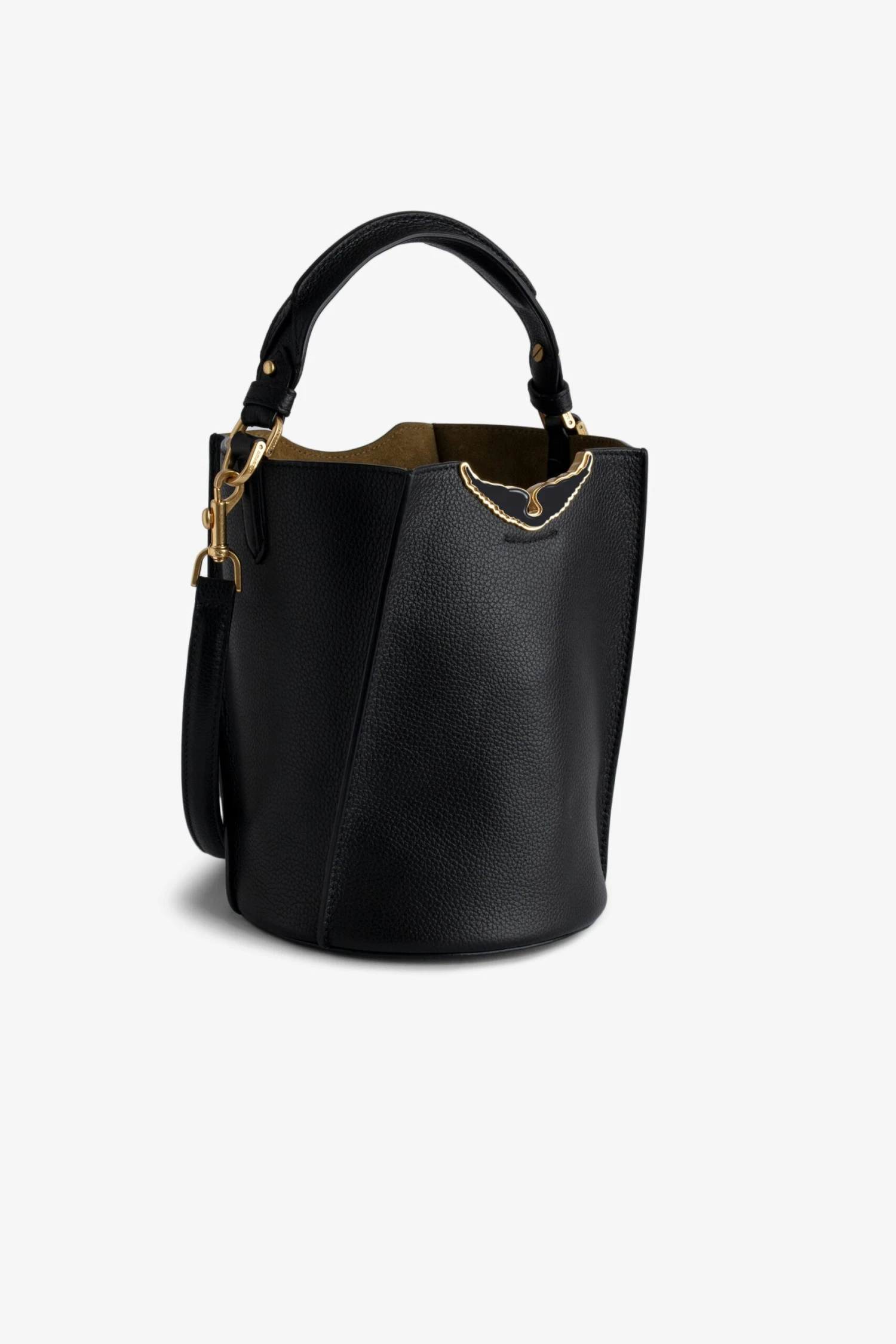 Black grained leather bucket bag with handle and shoulder strap, lacquered wings signature.