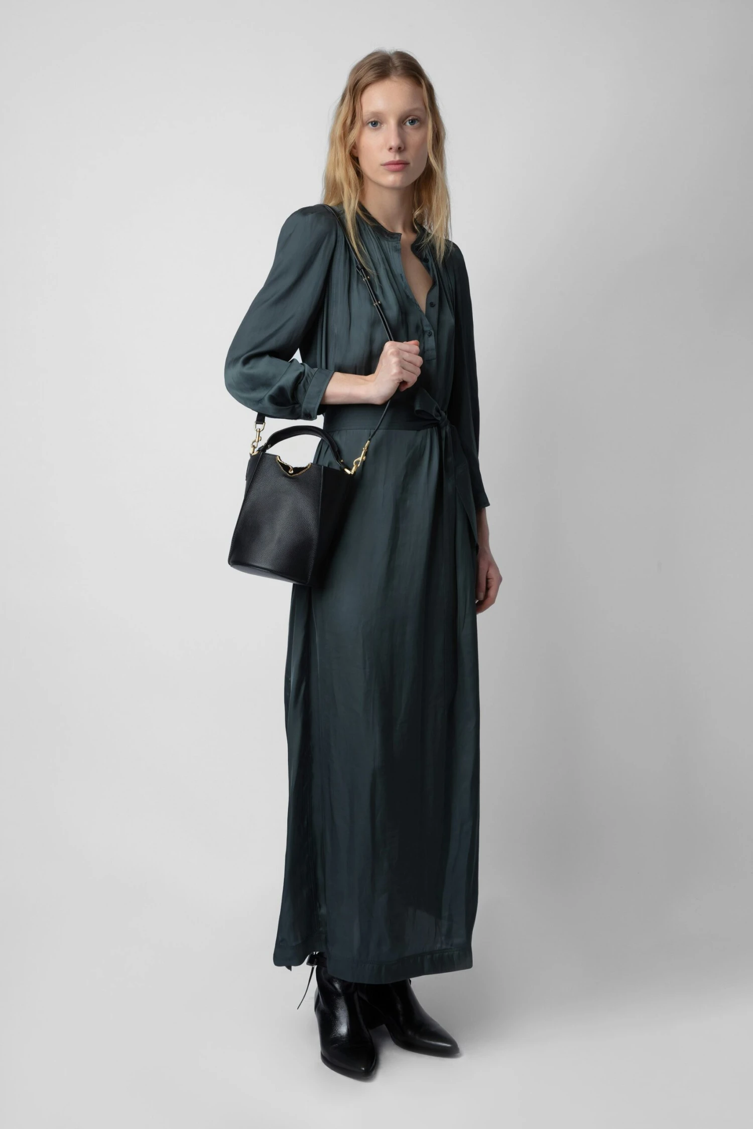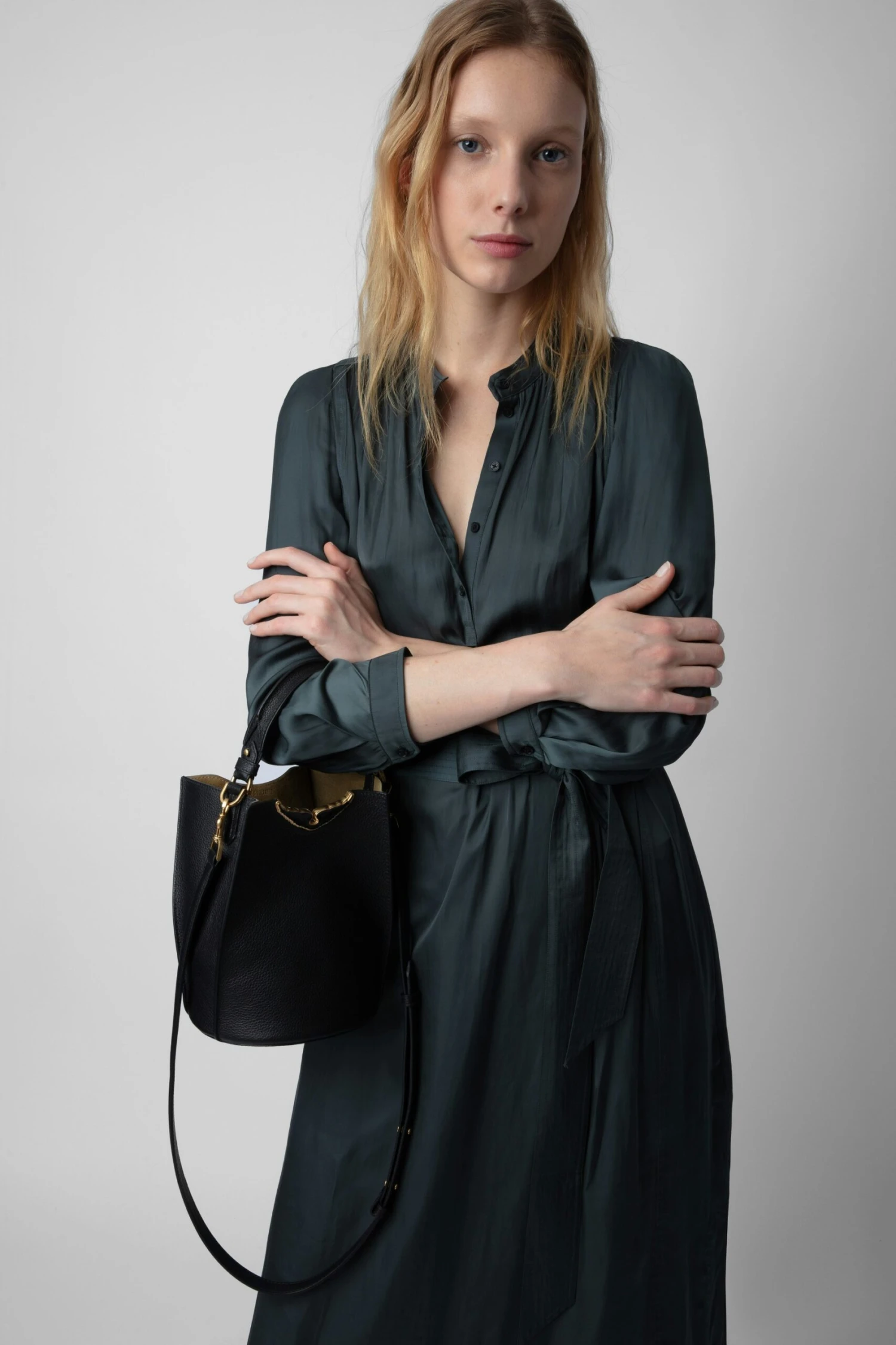 – Women’s Borderline Bucket black grained leather bucket bag – Brown suede inner – Leather handle and adjustable, removable leather shoulder strap – Lacquered black gold metal wings – Carabiner hook inside bag – Carry by hand, over the shoulder or across the body The Leather Working Group/LWG is a membership organization comprised of brands, suppliers, leather manufacturers and other stakeholders within the leather manufacturing industry. The group has developed an auditing program which certifies leather manufacturing facilities based on their environmental compliance and performance capabilities