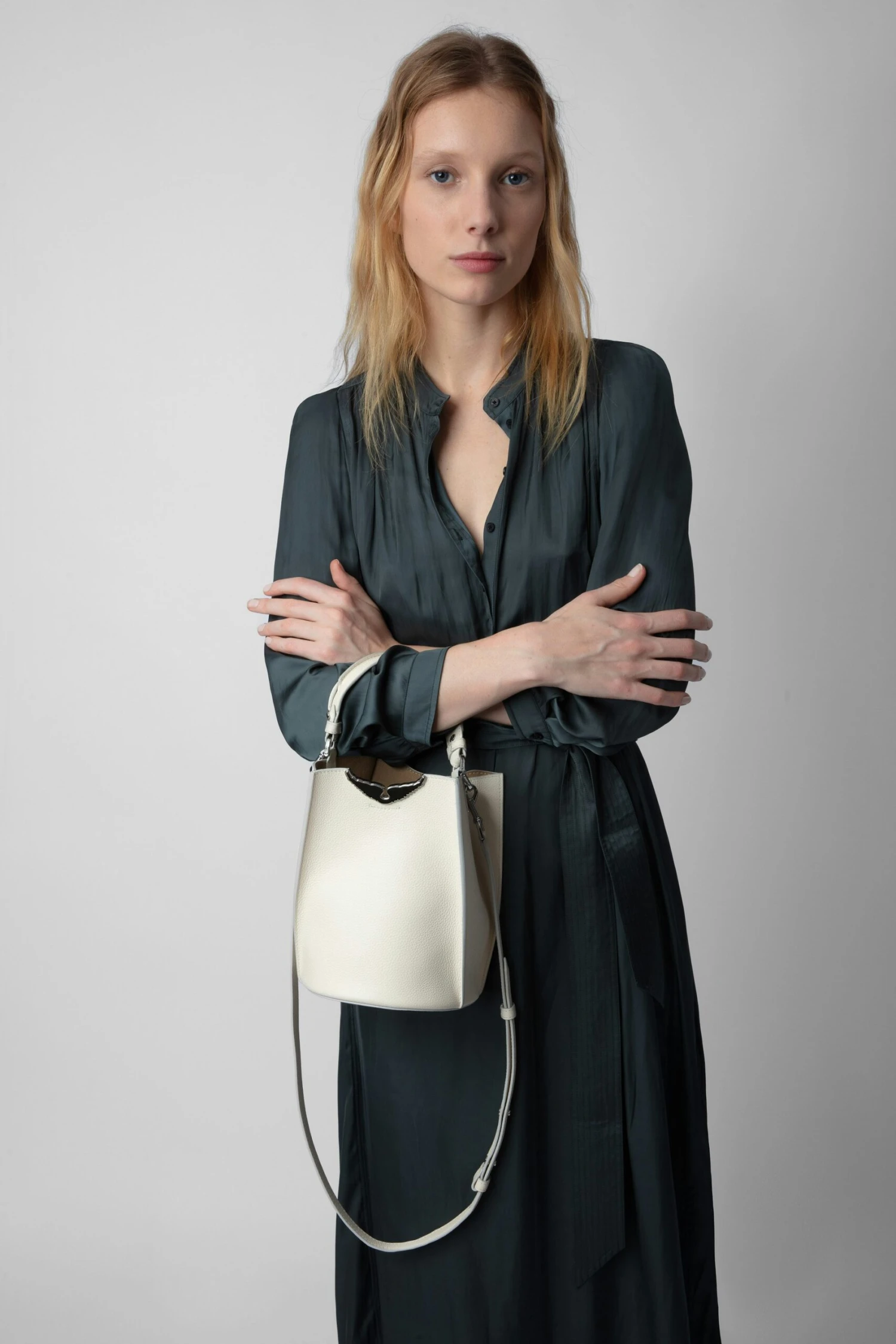 Ecru grained leather bucket bag with handle, shoulder strap and lacquered wings signature.