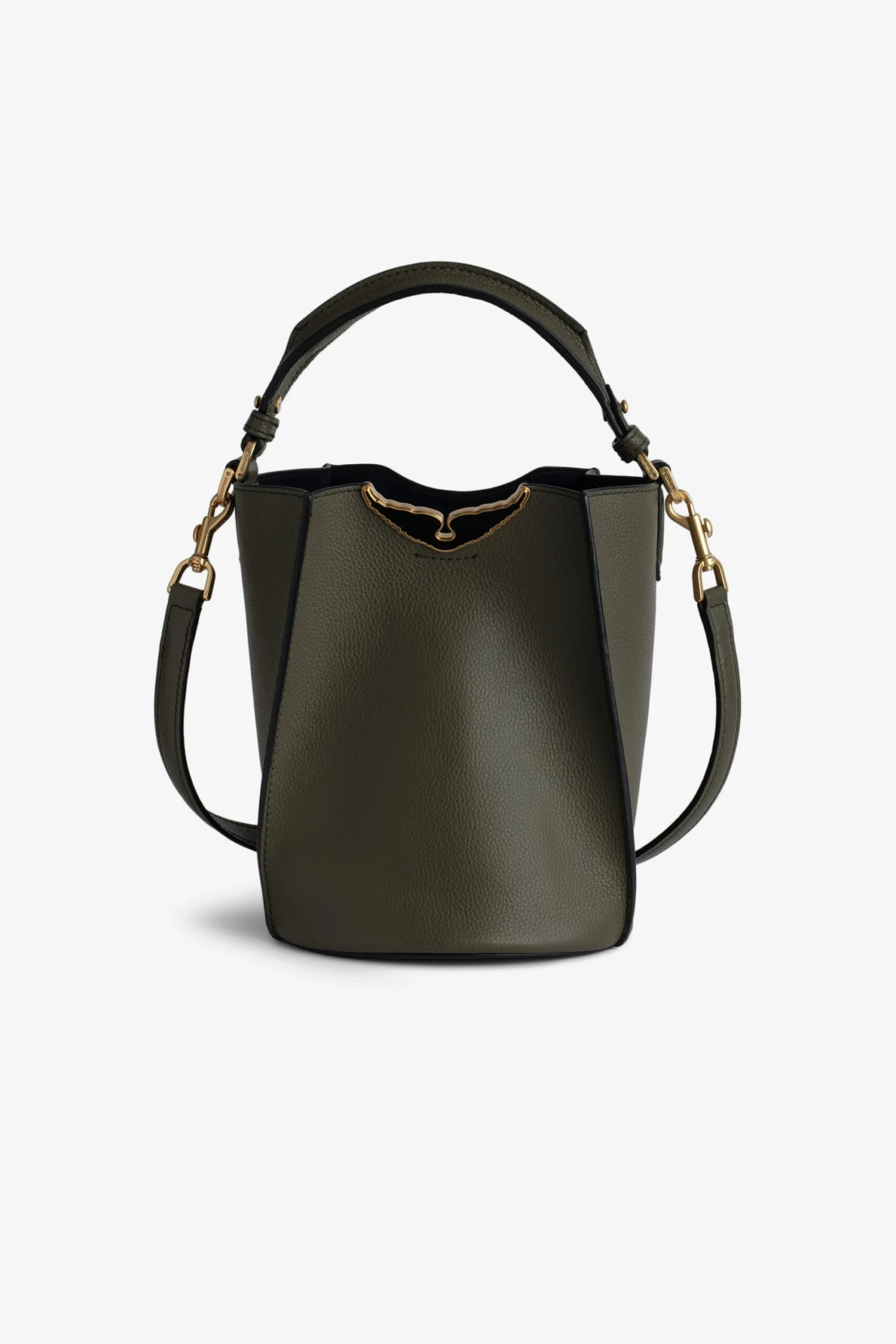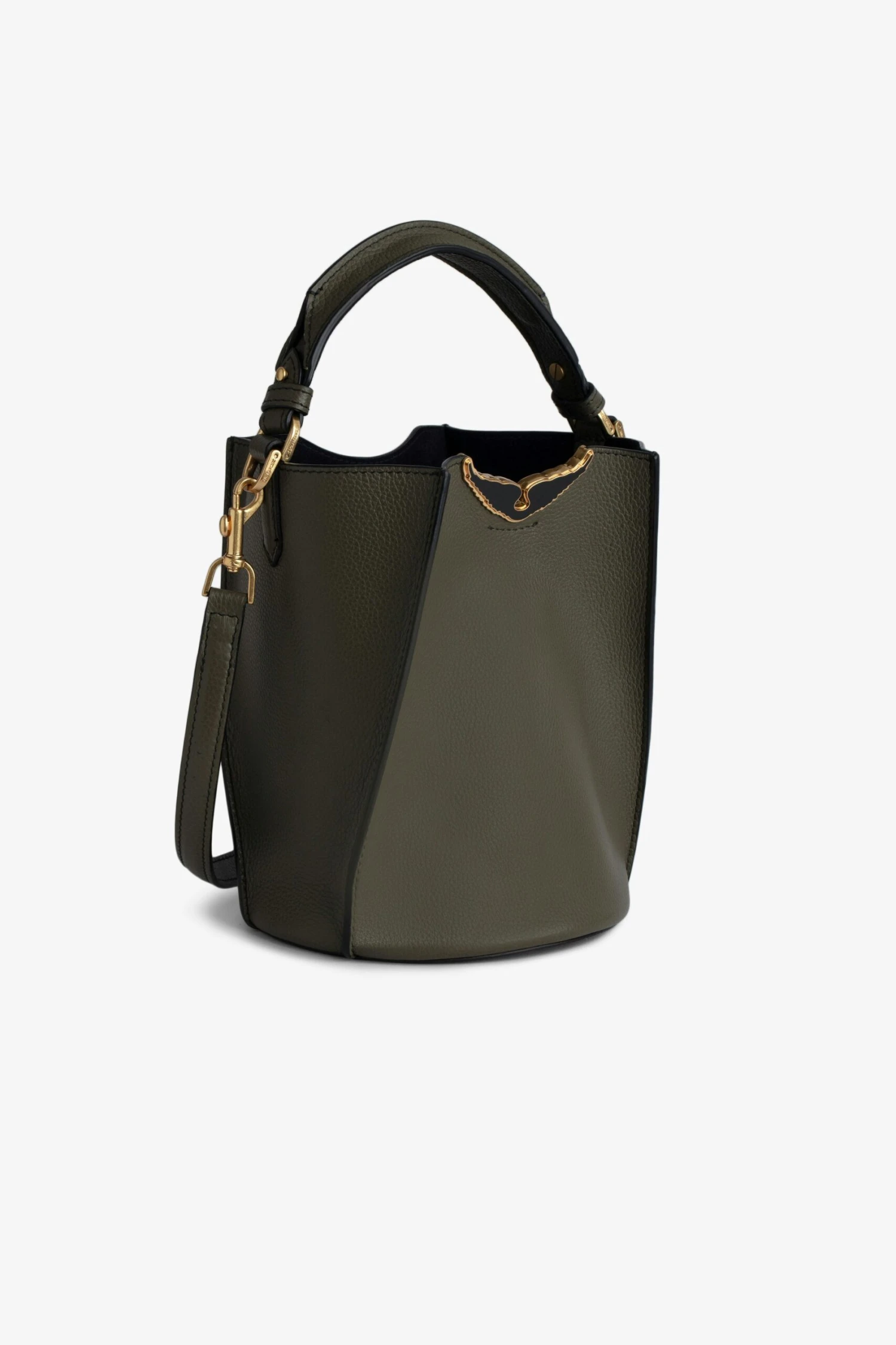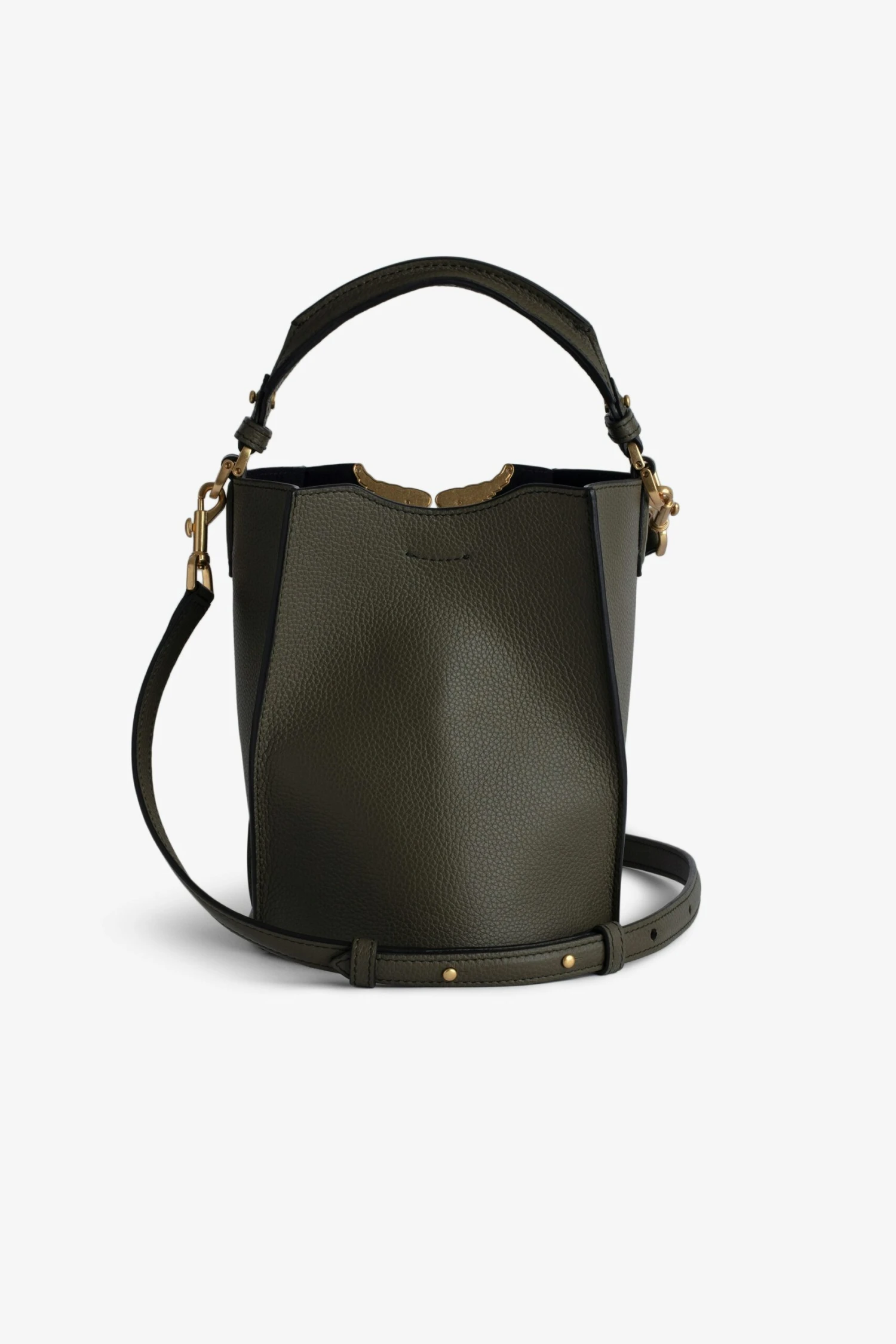 Women’s khaki grained leather bucket bag with handle and shoulder strap and lacquered wings signature.