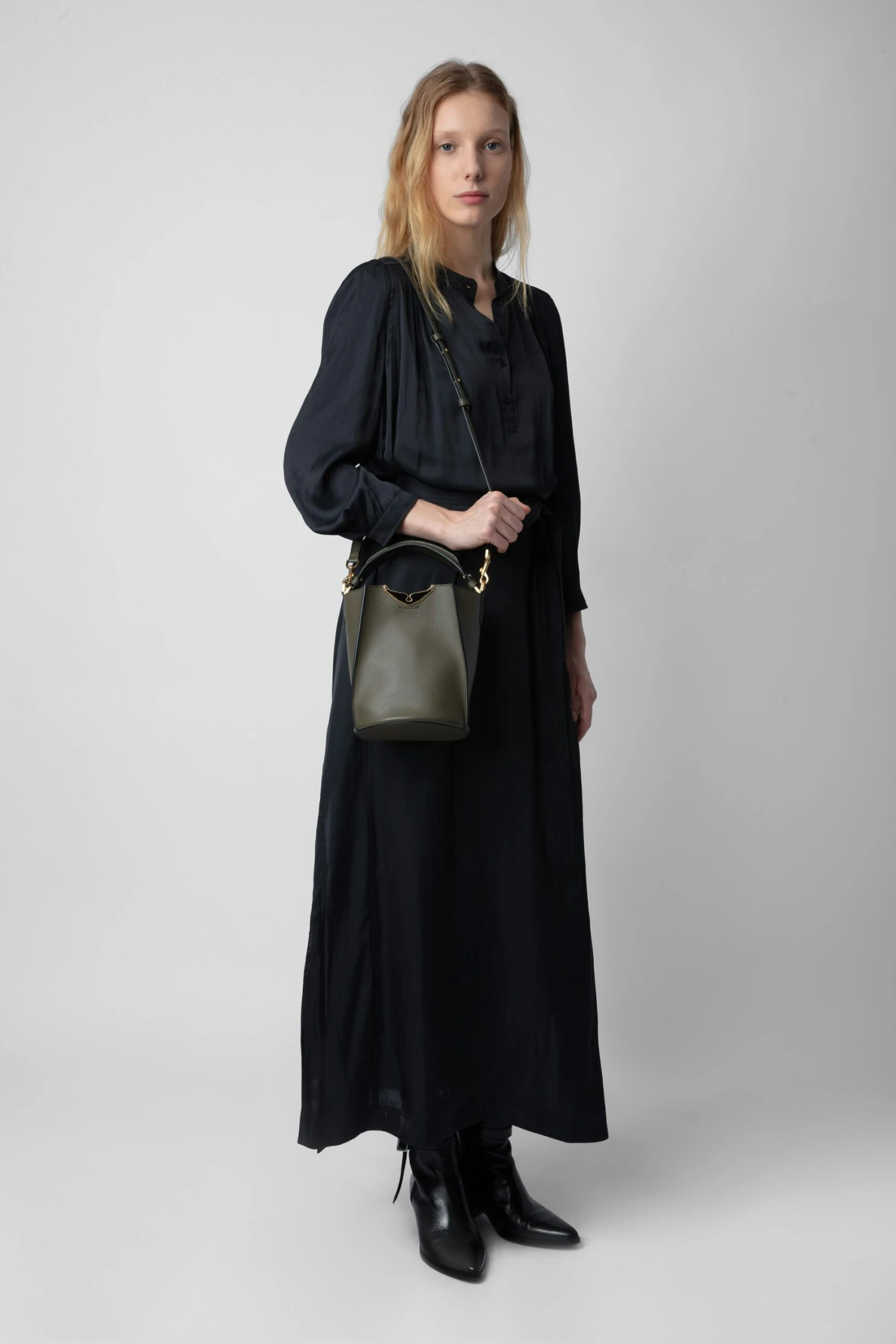 – Women’s Borderline Bucket bucket bag in Record khaki grained leather – Suede inner – Leather handle and adjustable, removable leather shoulder strap – Silver, gold and black lacquered wings – Carabiner hook inside bag – Carry by hand, over the shoulder or across the body The Leather Working Group/LWG is a membership organization comprised of brands, suppliers, leather manufacturers and other stakeholders within the leather manufacturing industry. The group has developed an auditing program which certifies leather manufacturing facilities based on their environmental compliance and performance capabilities