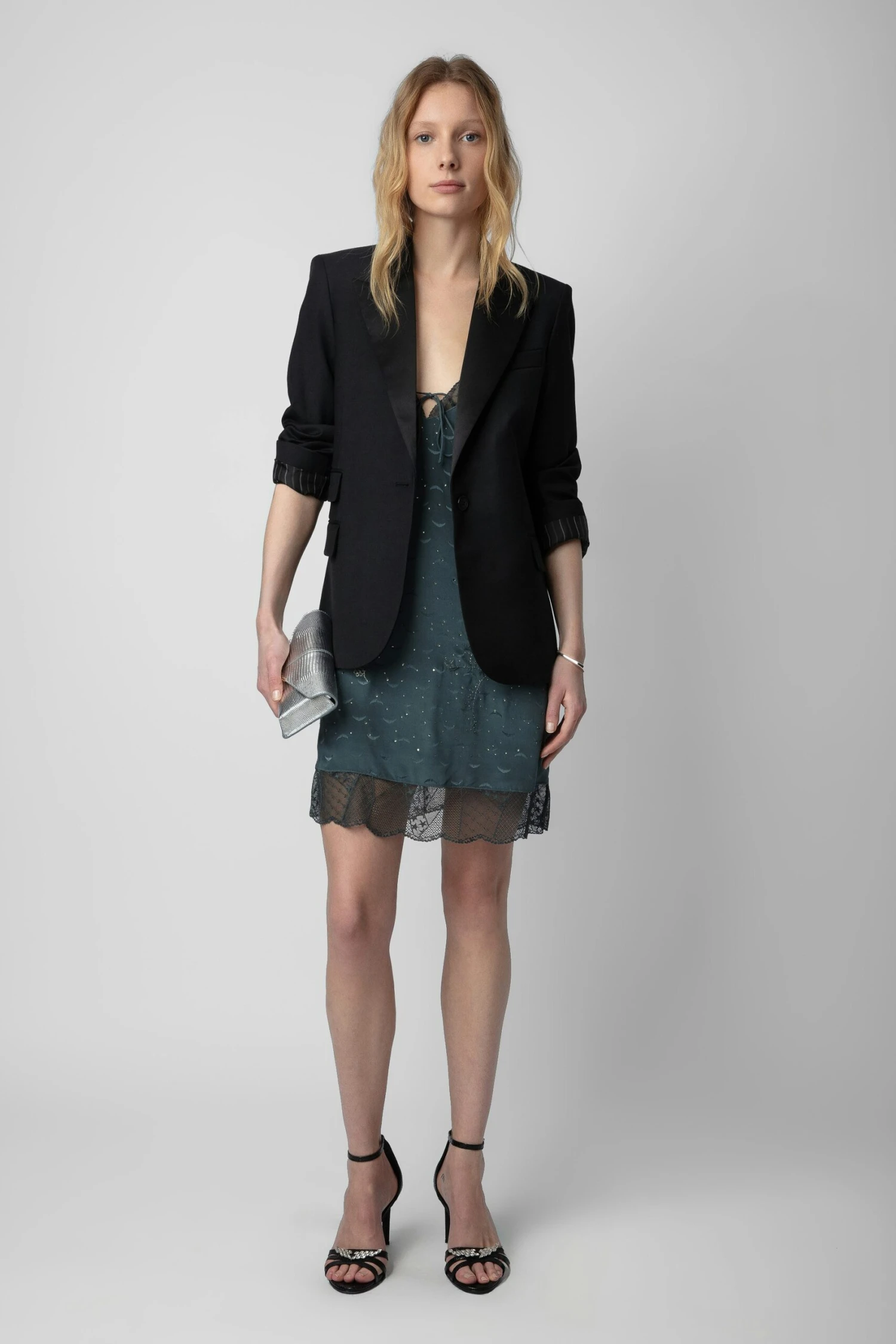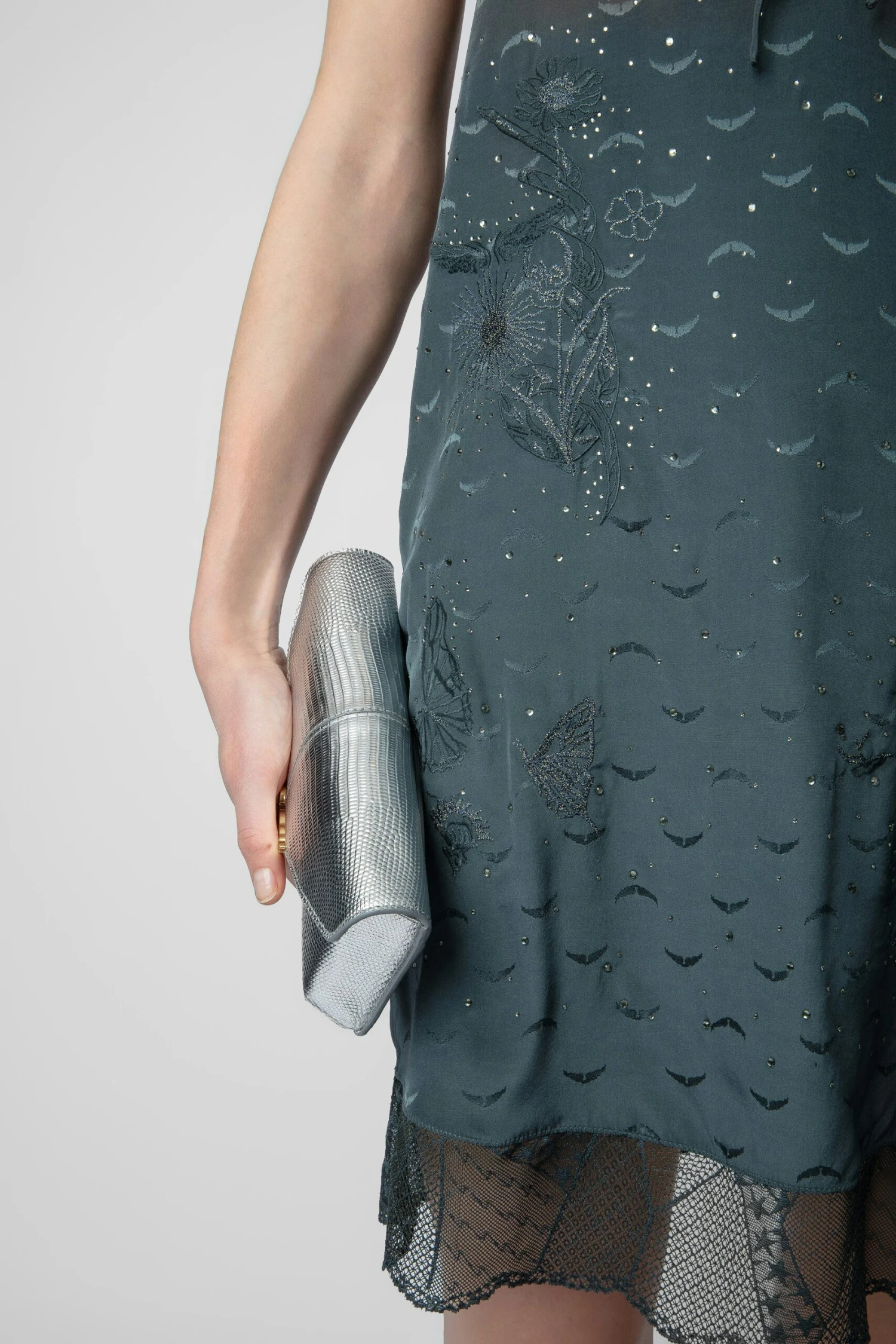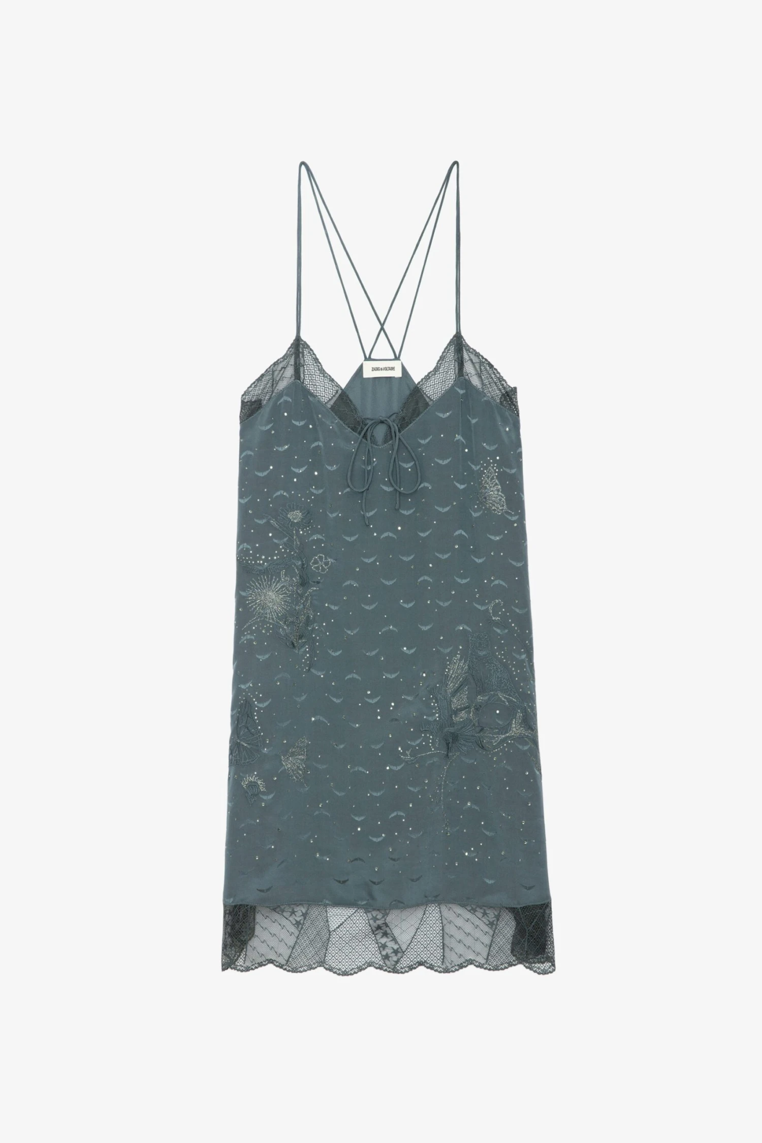 Grey silk lingerie-style mini dress with jacquard wings, diamanté, lace and ties.