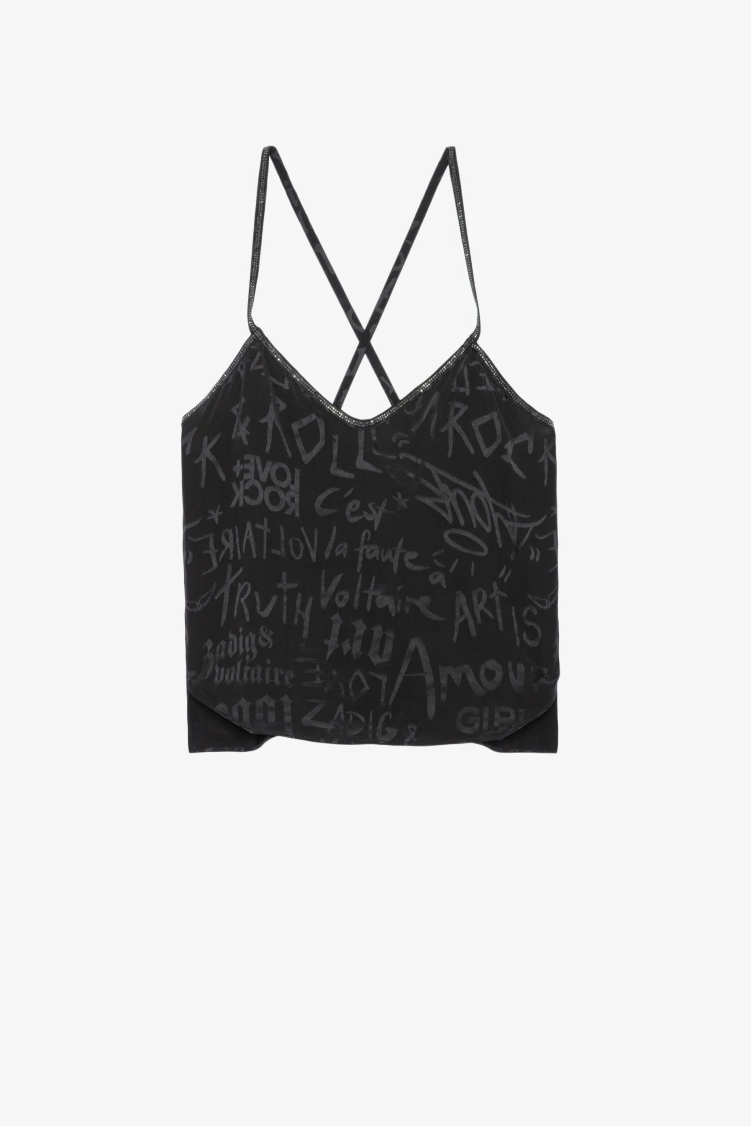 Women’s silk camisole with diamanté straps and all over graffiti motifs.
