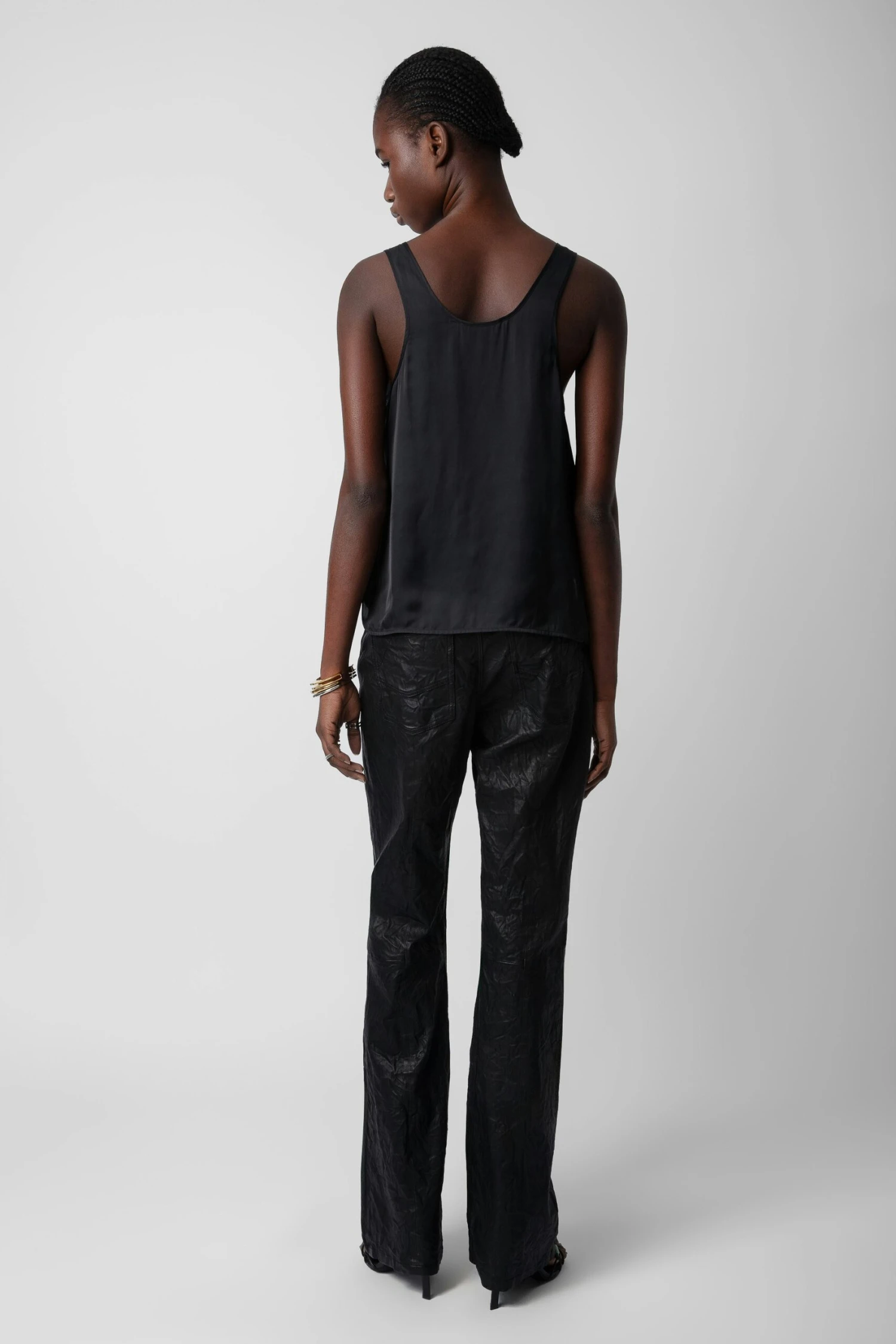 – Women’s black satin flowing top – Round neckline – Cutaway armholes **recycled fibers