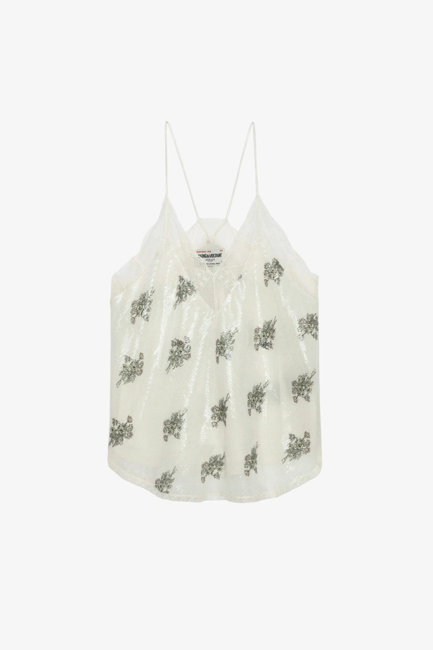 Ecru lingerie-style camisole with floral print, sequins, thin straps and lace-trimmed neckline.