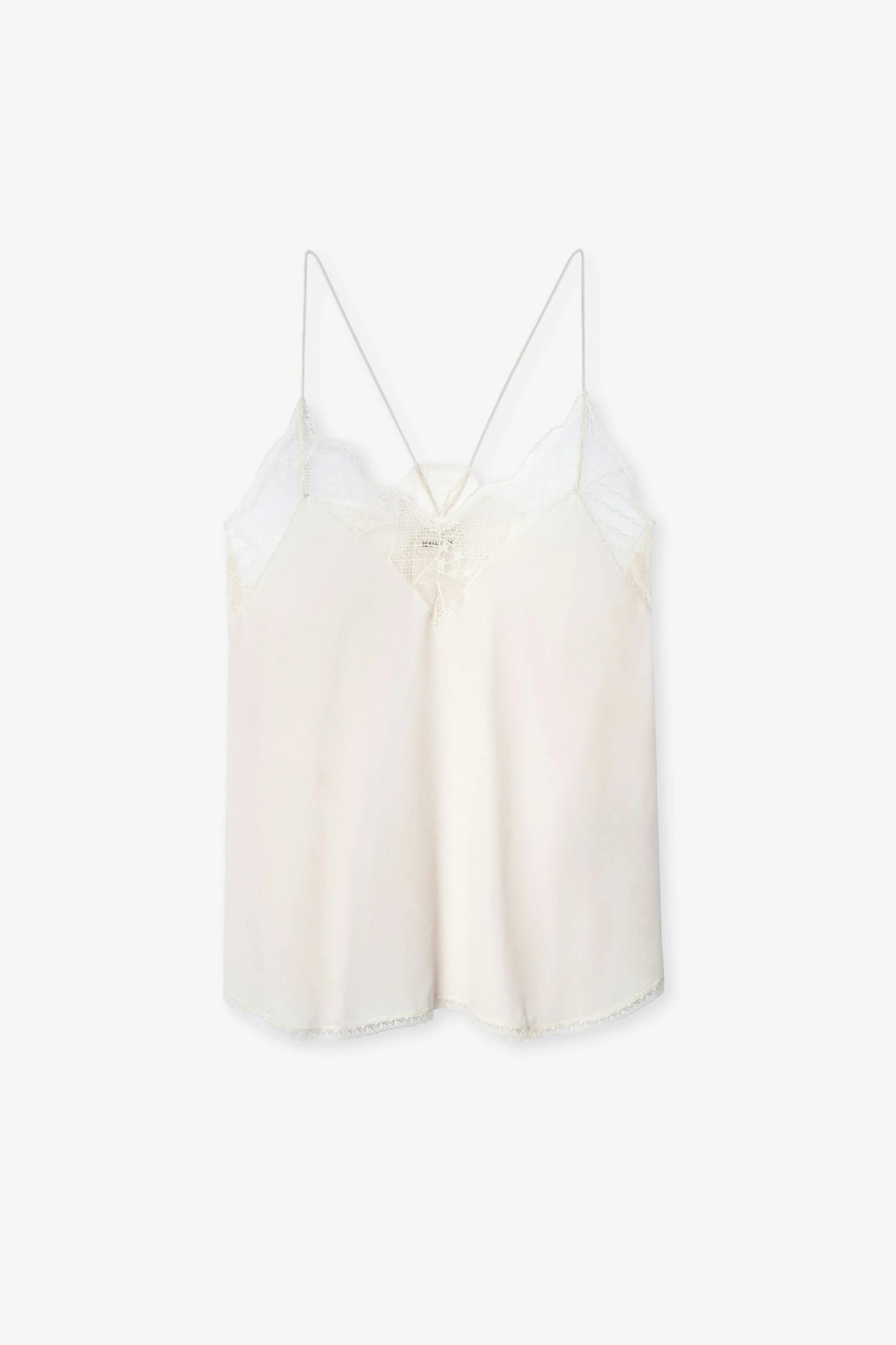 This Zadig&Voltaire must-have is reinvented every season: the signature Christy camisole can be worn under a blazer or on its own for a chic, bohemian look. – Zadig&Voltaire women’s ecru silk camisole – Straight neckline – Contrasting patterned lace – Thin strapsModel is 180 cm / 5′ 10″ and is wearing a size S