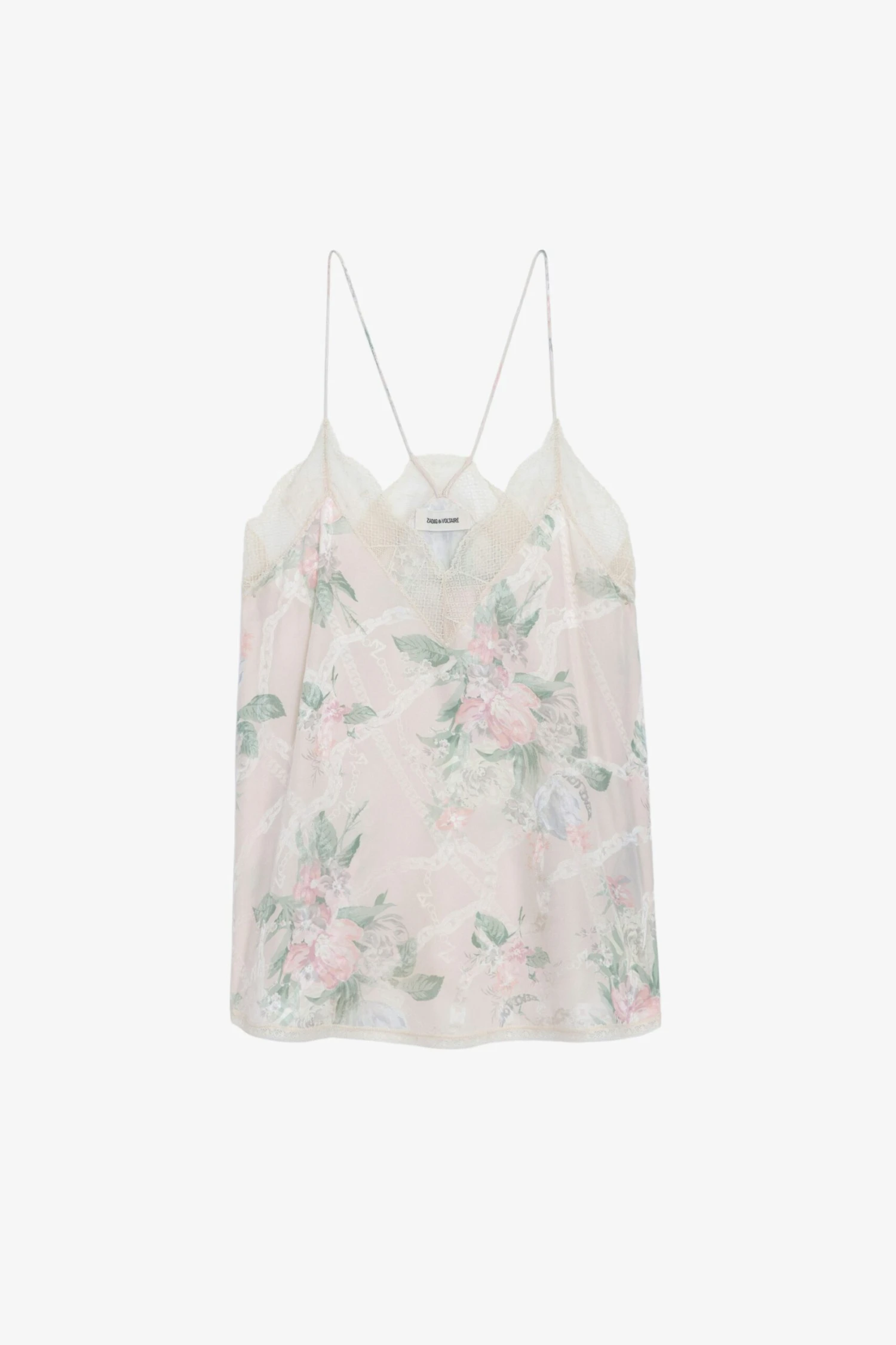 – Women’s white camisole – All over floral and chain printed silk – Lace trim – Thin non-adjustable strapsModel is 174 cm / 5′ 8″ and is wearing a size S