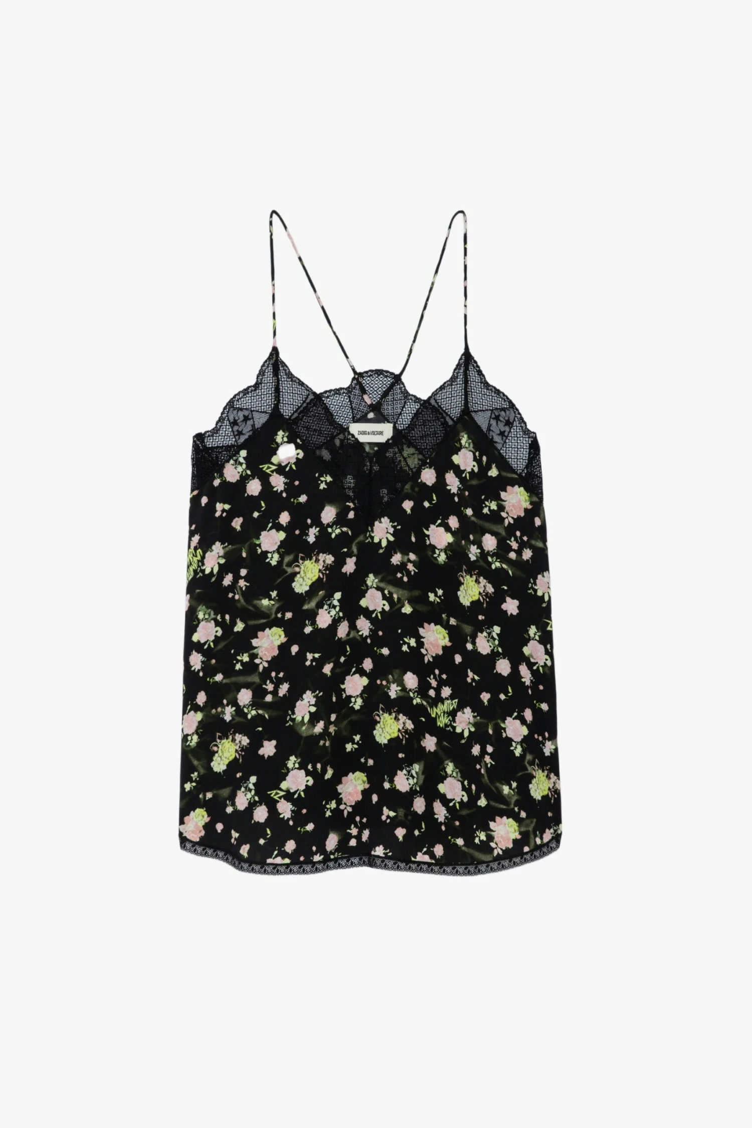 – Women’s black camisole – Floral-print silk – Lace trim – Thin non-adjustable straps Model is 174 cm / 5′ 8″ and is wearing a size S
