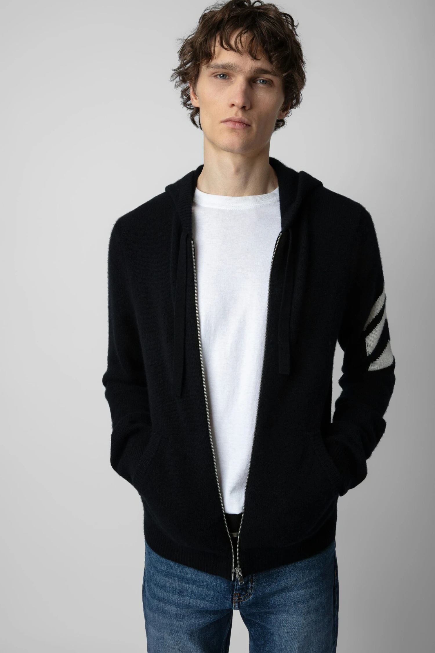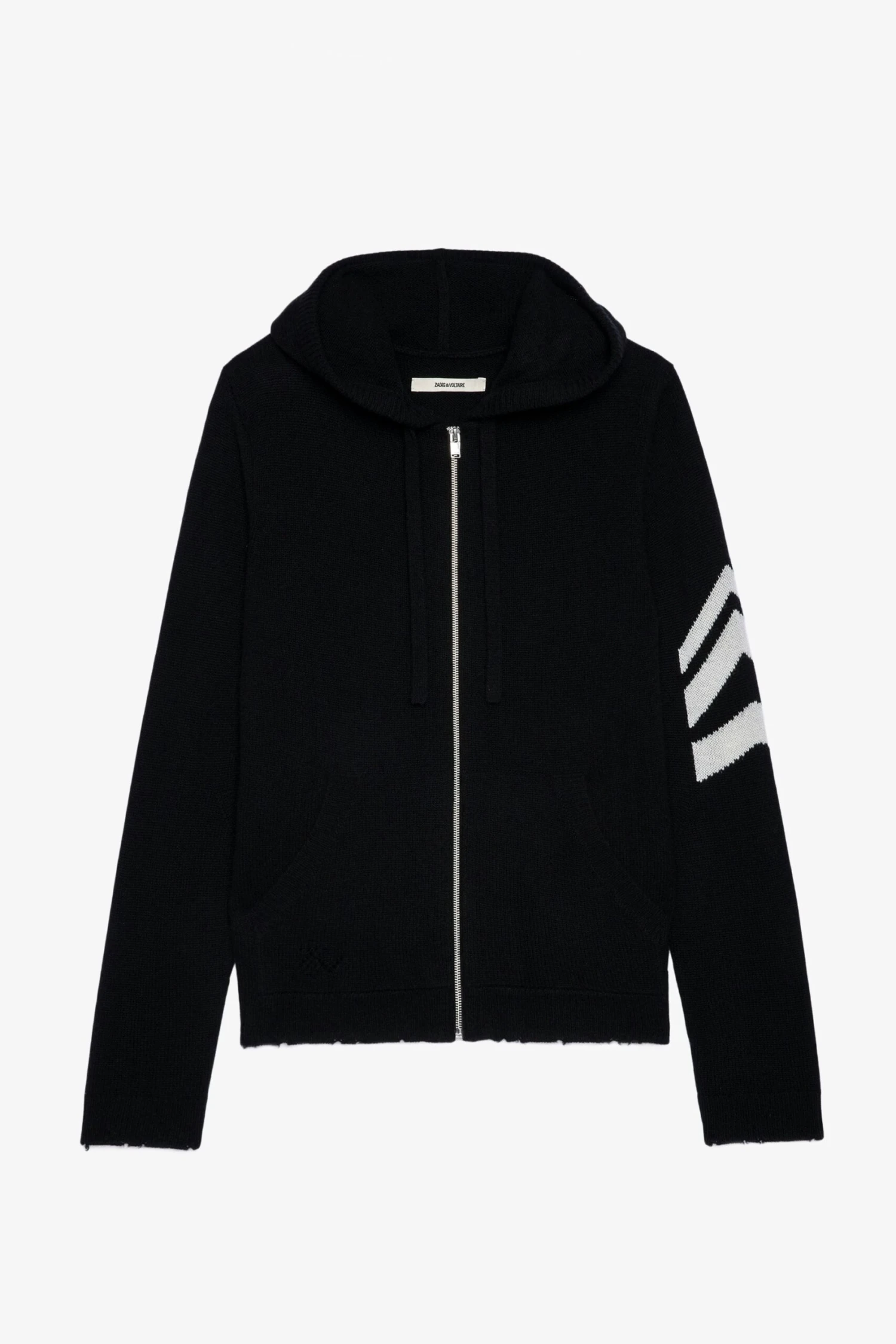 A precious cashmere knit reveals contrasting arrows on the sleeve of this cardigan. – Zadig&Voltaire men’s black cashmere cardigan – Hood – Long sleeves – Arrows on the sleeve Model is 189 cm / 6′ 2″ and is wearing a size M