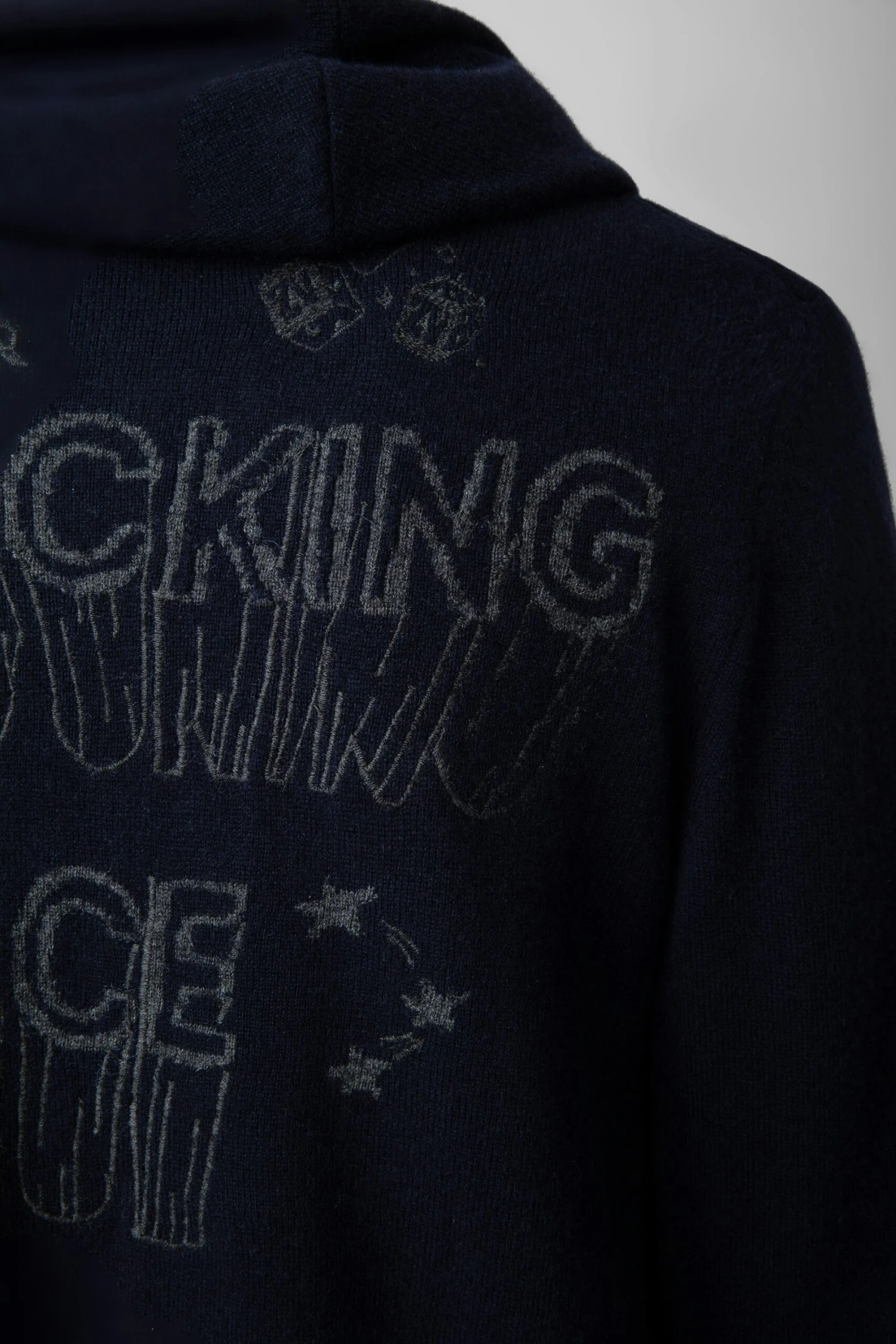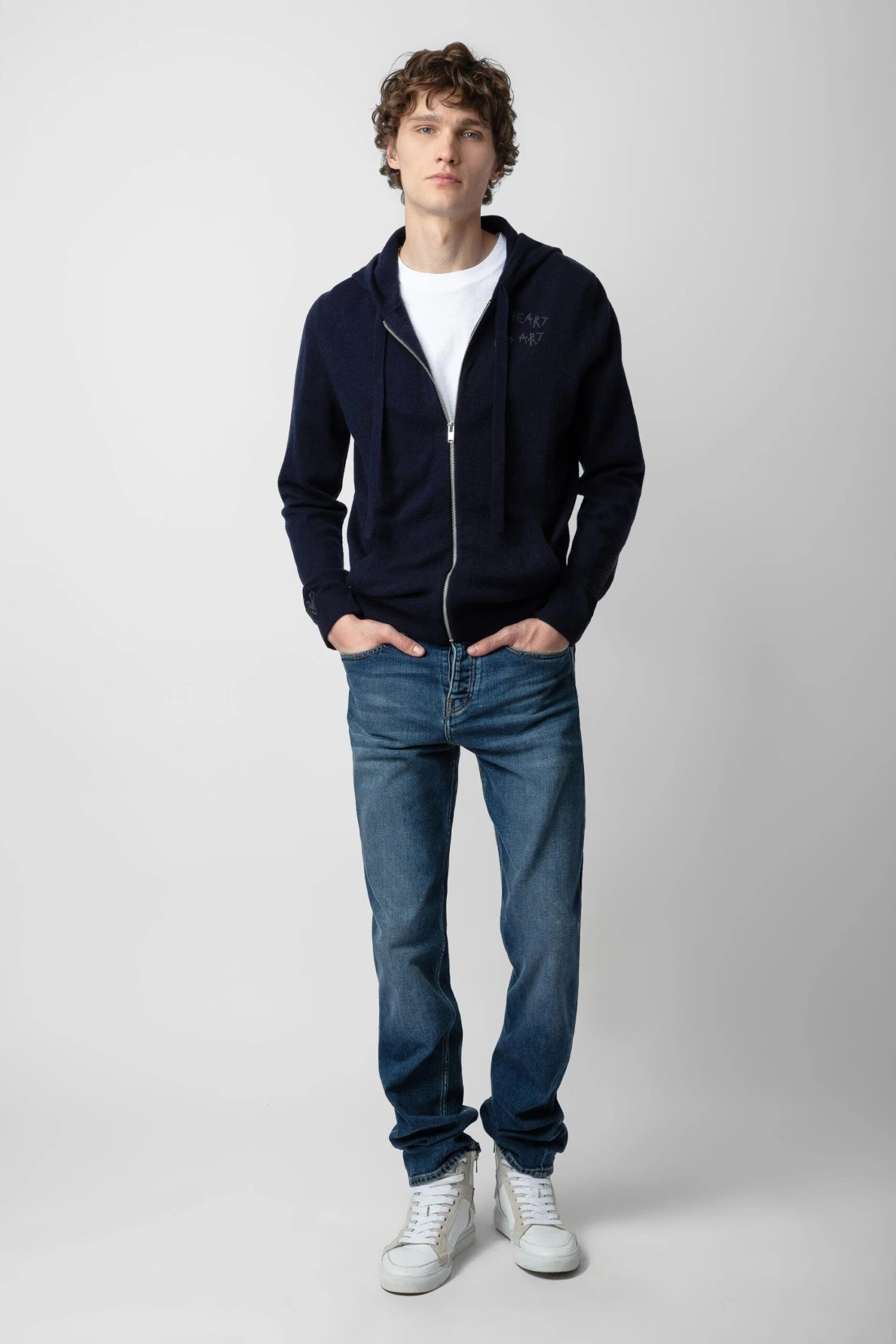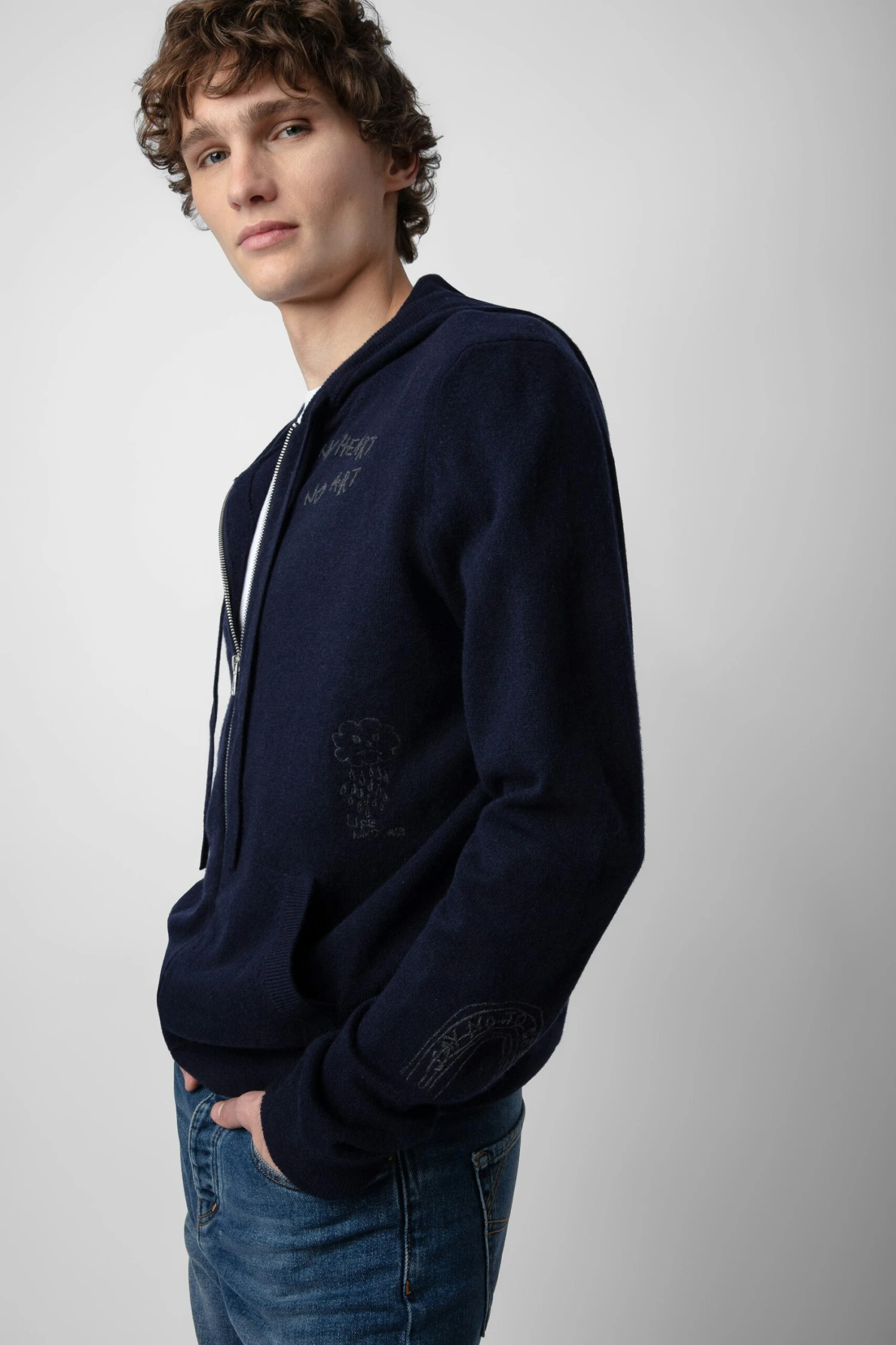 Customized details designed by Humberto Cruz, an artist and illustrator from San Diego. Influenced by pop culture, fashion and colors, he describes his work as spontaneous and quirky. – Men’s Encre navy blue wool and cashmere cardigan – Drawstring hood and zip fastening – Long sleeves and ribbed trim – Two front pockets – Graffiti motifs and “Be Fucking Nice” and “No Heart No Art” slogans Model is 187 cm / 6′ 1″ and is wearing a size M*Contains 70% RWS certified woolThe Responsible Wool Standard (RWS) guarantees animal welfare and respect for pastures. It also ensures end-to-end traceability of the wool through the supply chain