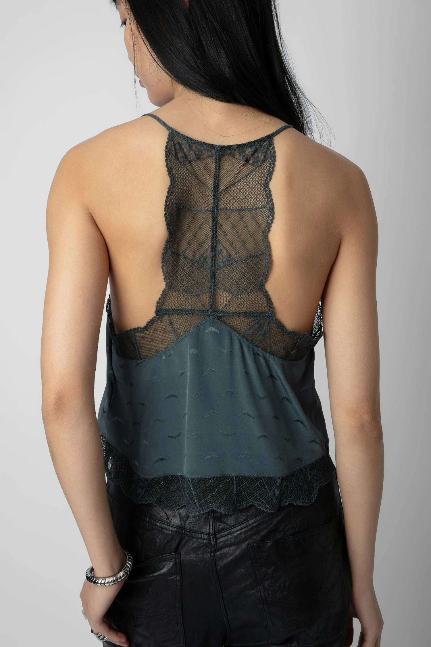 Grey silk cropped lingerie-style camisole with jacquard wings.