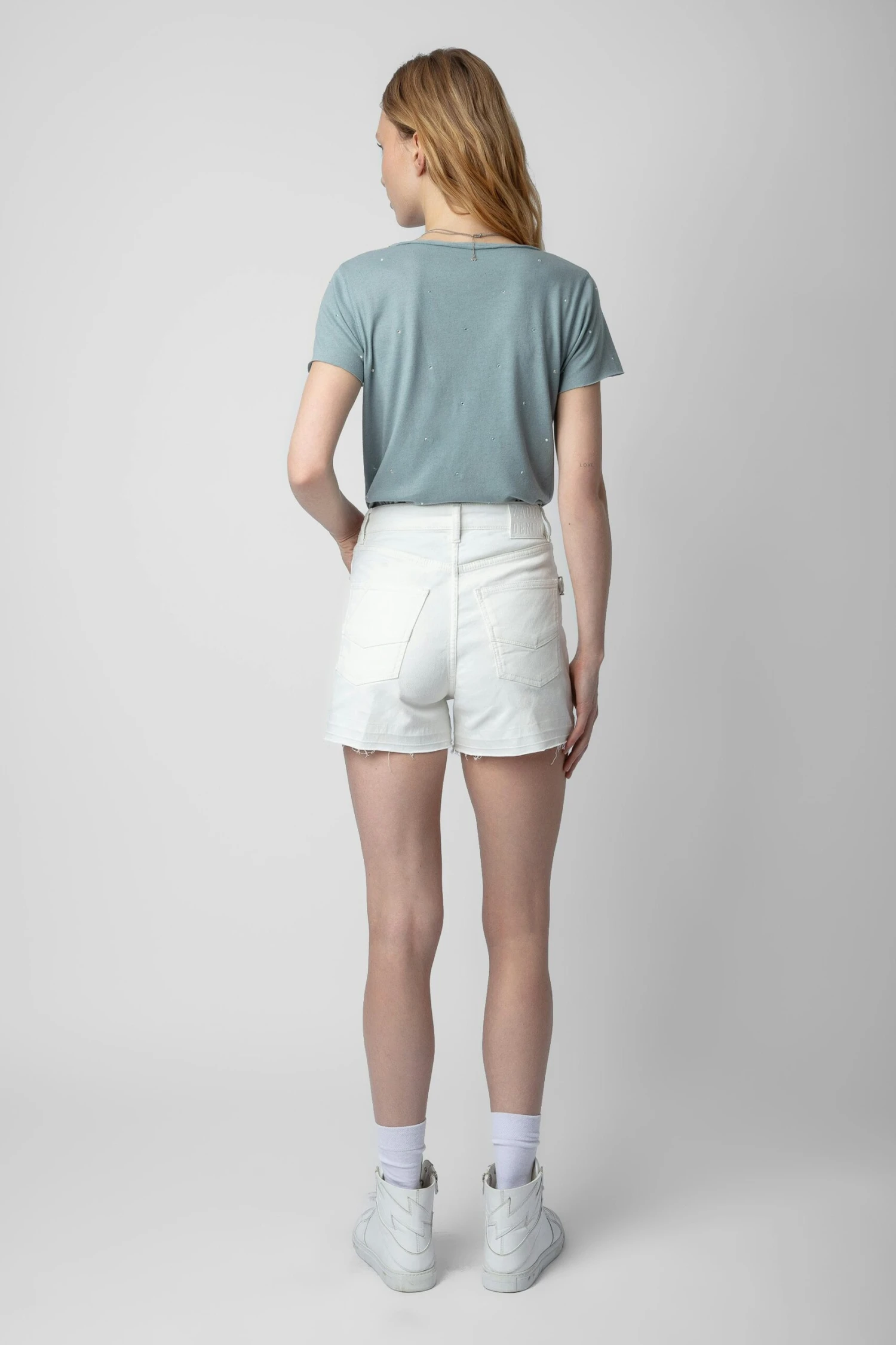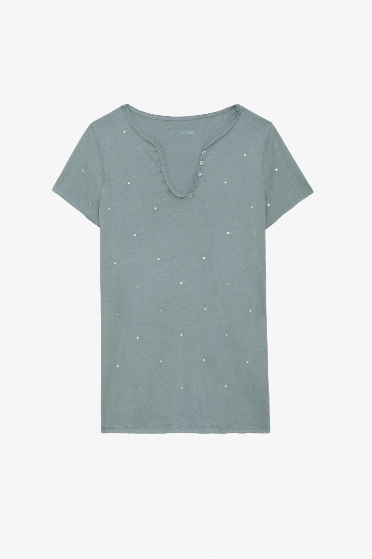 Light blue cotton short-sleeved Henley T-shirt with diamanté.