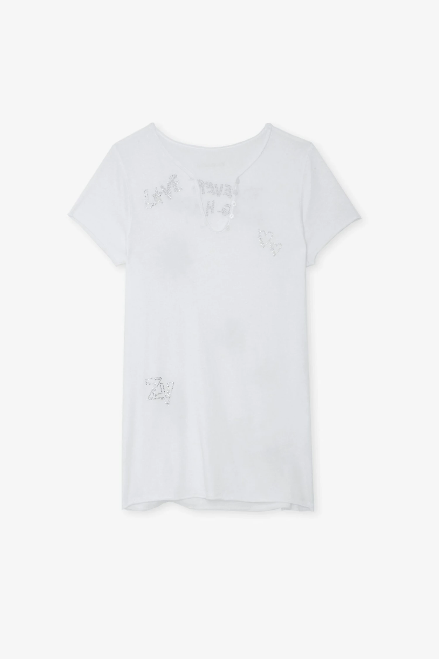 White cotton Henley T-shirt with short sleeves and diamanté-embellished motifs.