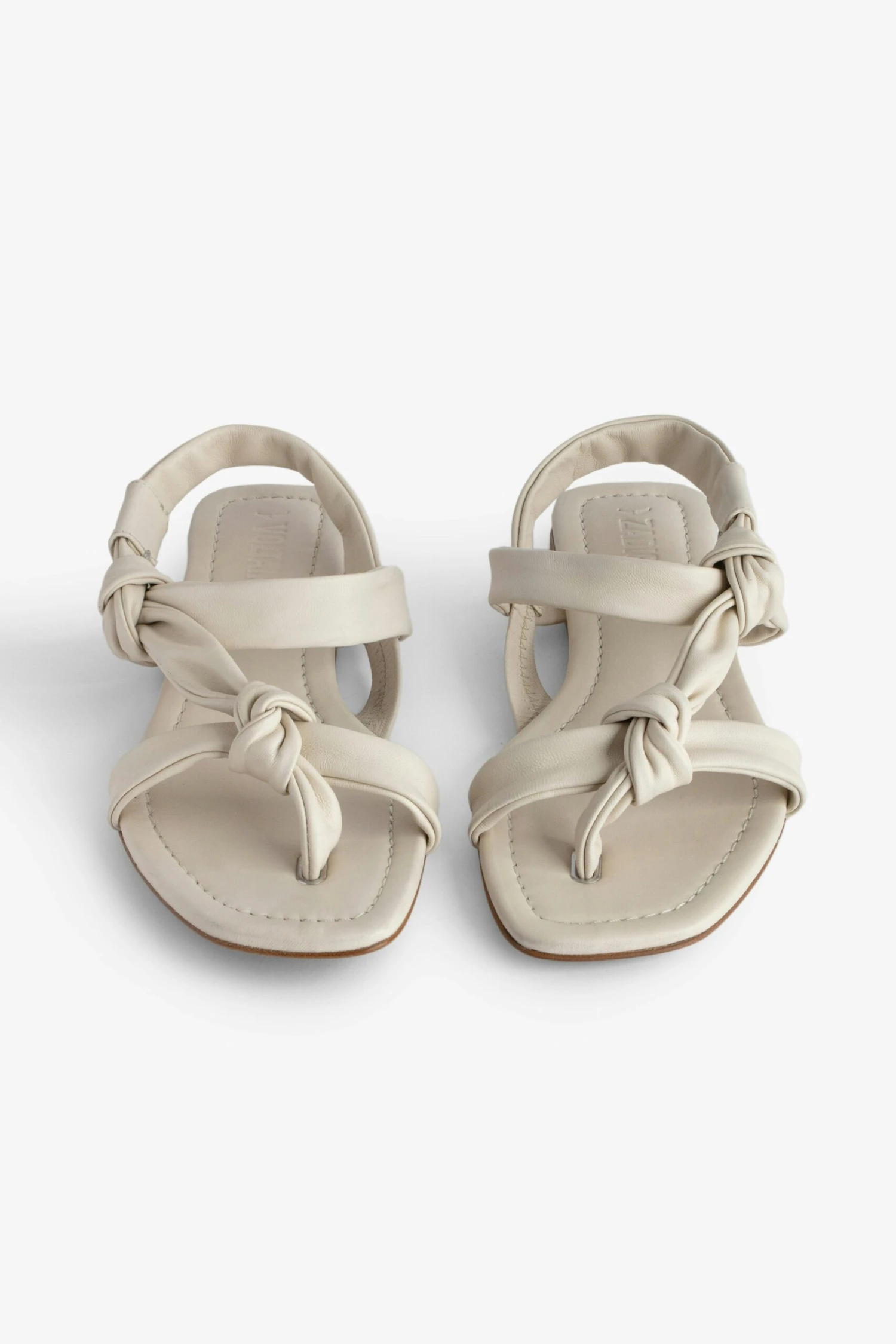 -Women’s white flat leather sandals r – Knotted leather details throughout – Wing motifs on sidesThe Leather Working Group/LWG is a membership organization comprised of brands, suppliers, leather manufacturers and other stakeholders within the leather manufacturing industry. The group has developed an auditing program which certifies leather manufacturing facilities based on their environmental compliance and performance capabilities