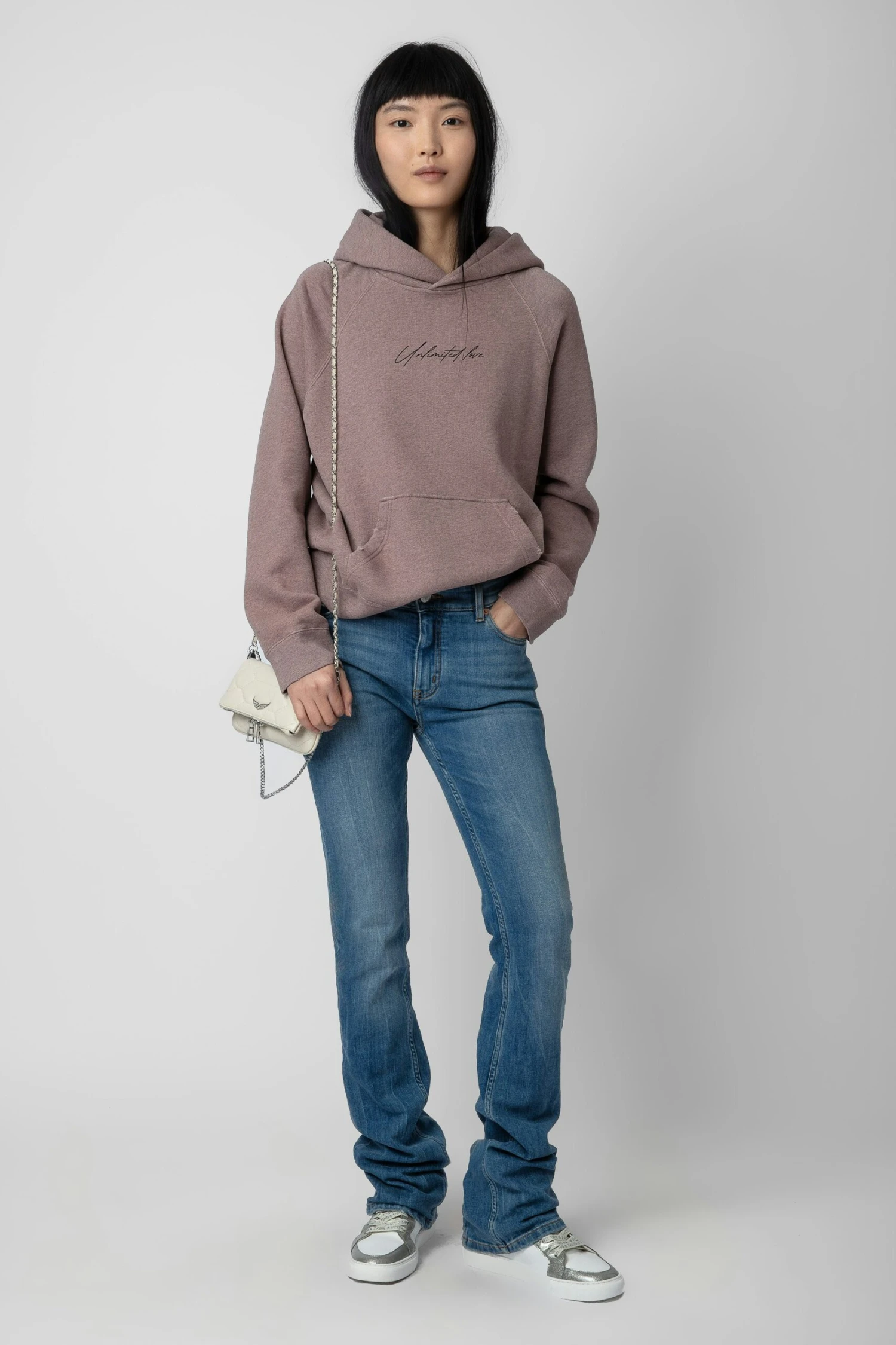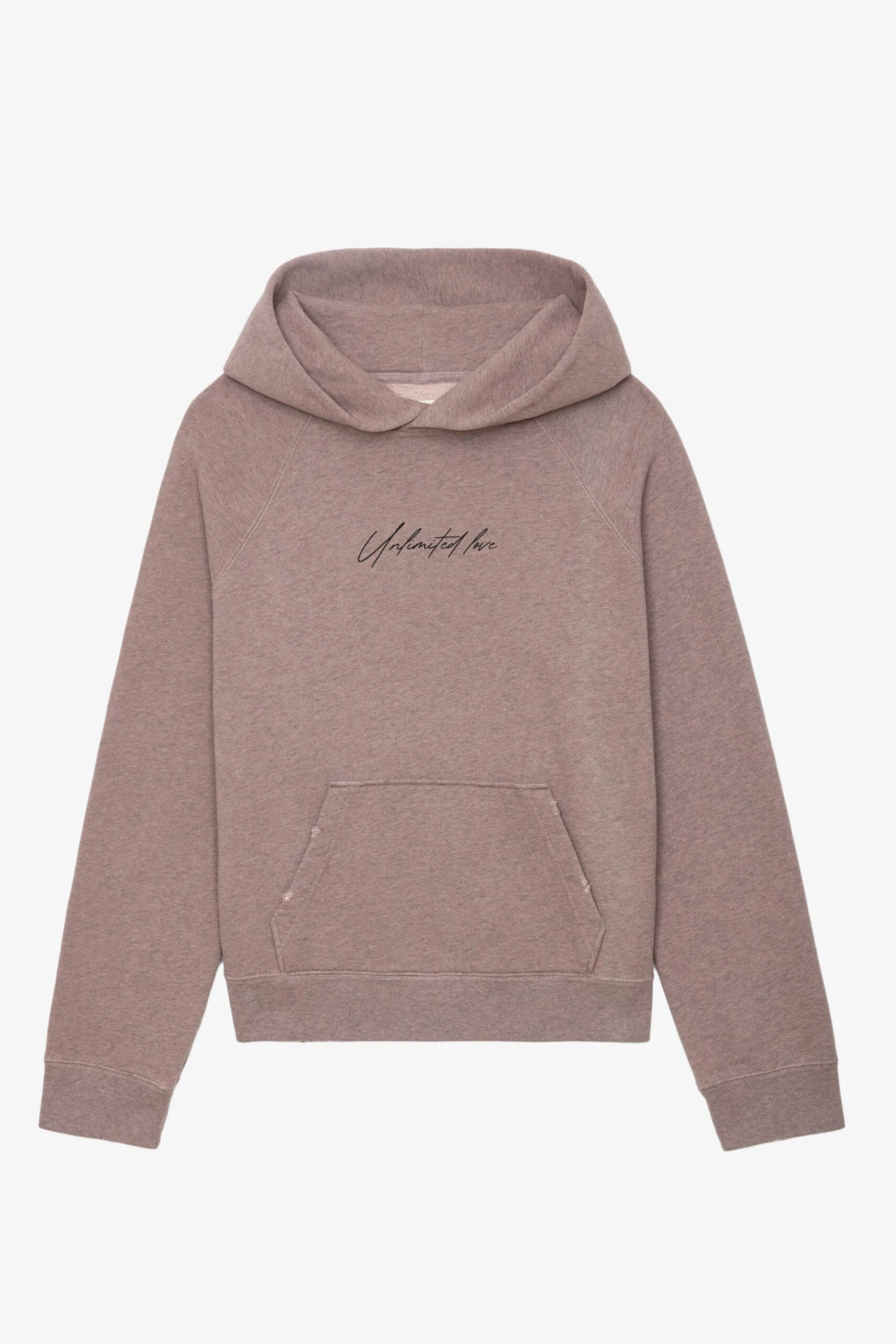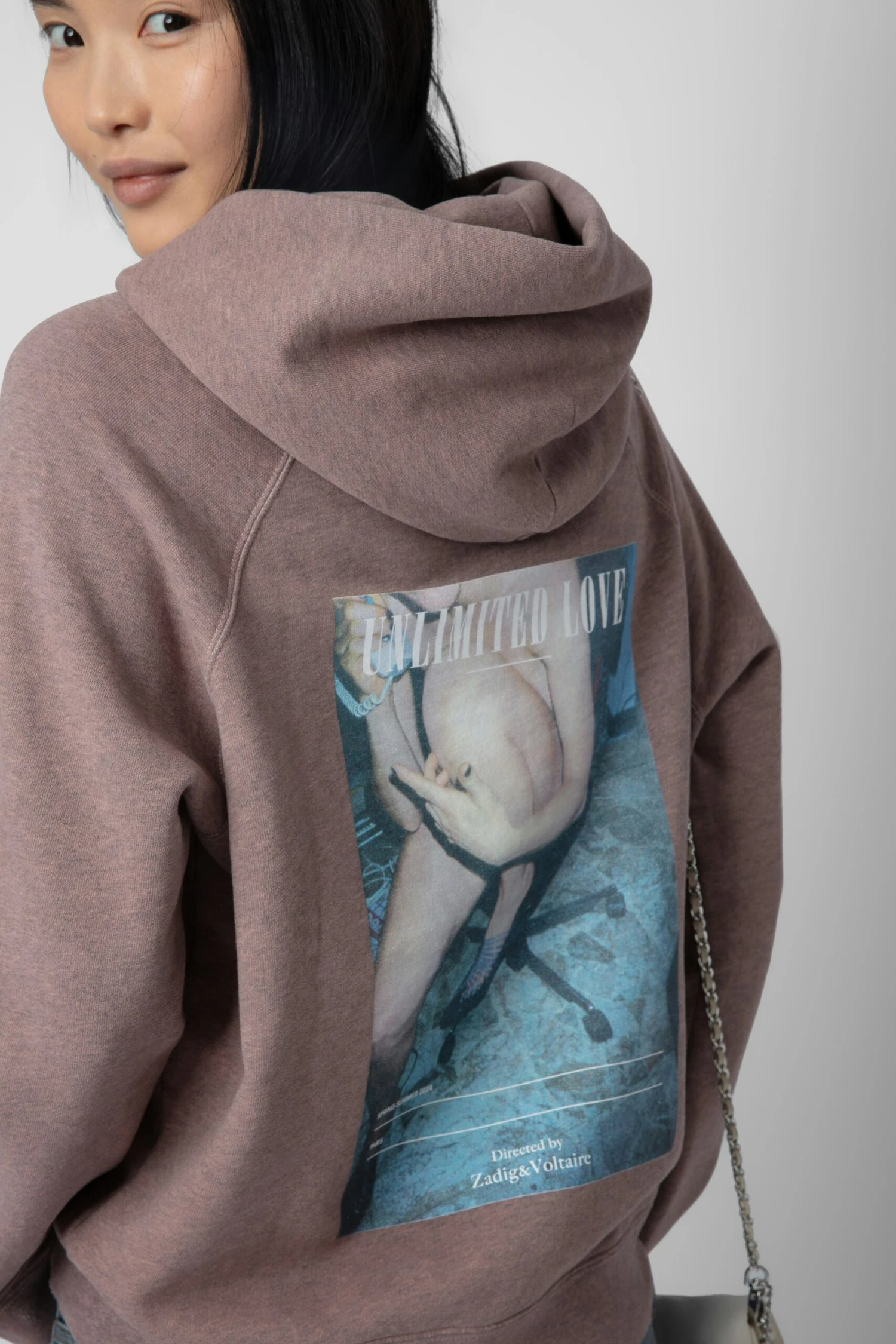 – Women’s pink sweatshirt hoodie – Small logo on front – Photo print on back – Elasticed cuffs on sleeves and bottom. Model is 174 cm / 5′ 8″ and is wearing a size S**Fibers from organic farming **recycled fibers