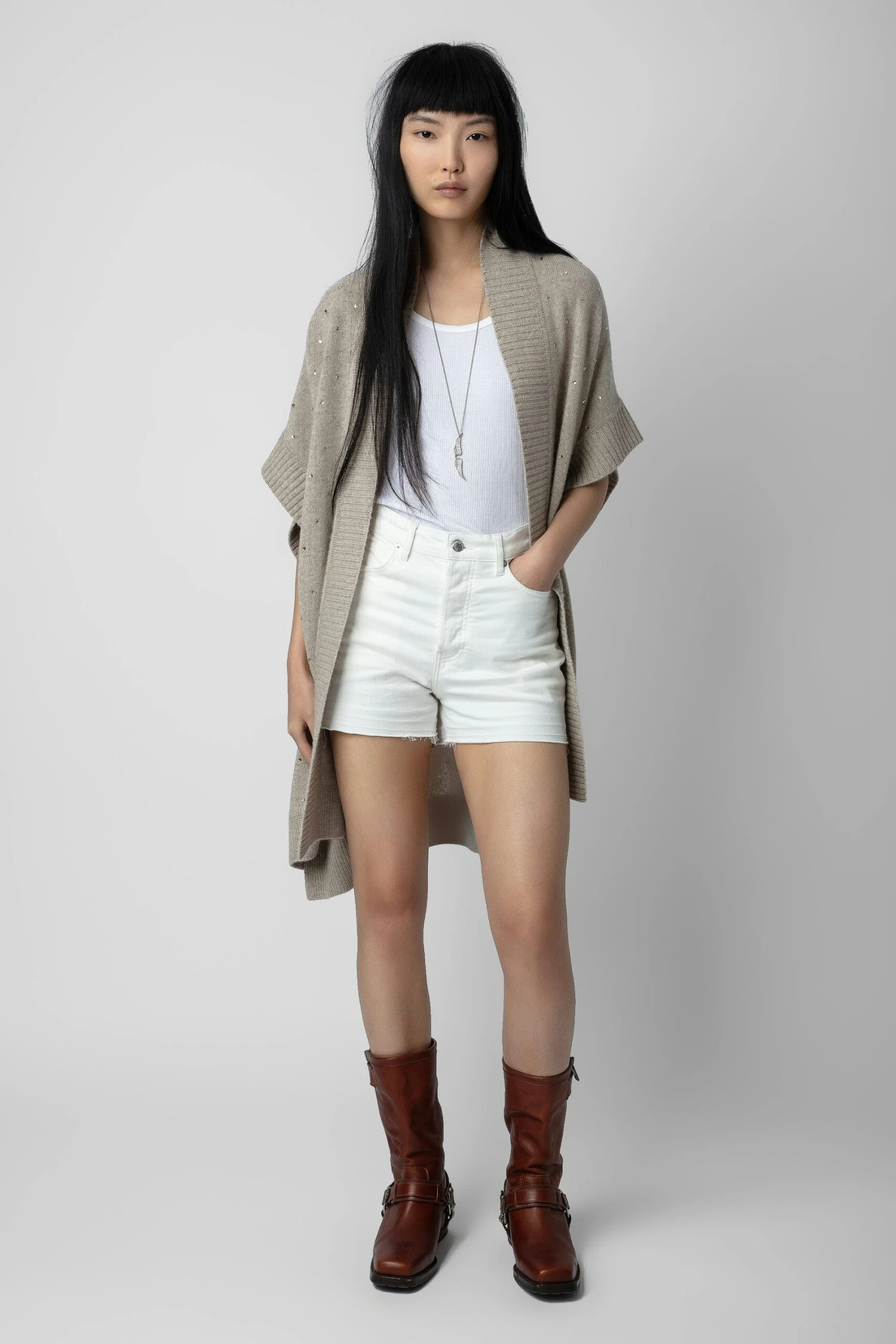 Beige cashmere midi cardicoat with short sleeves and gold diamanté.