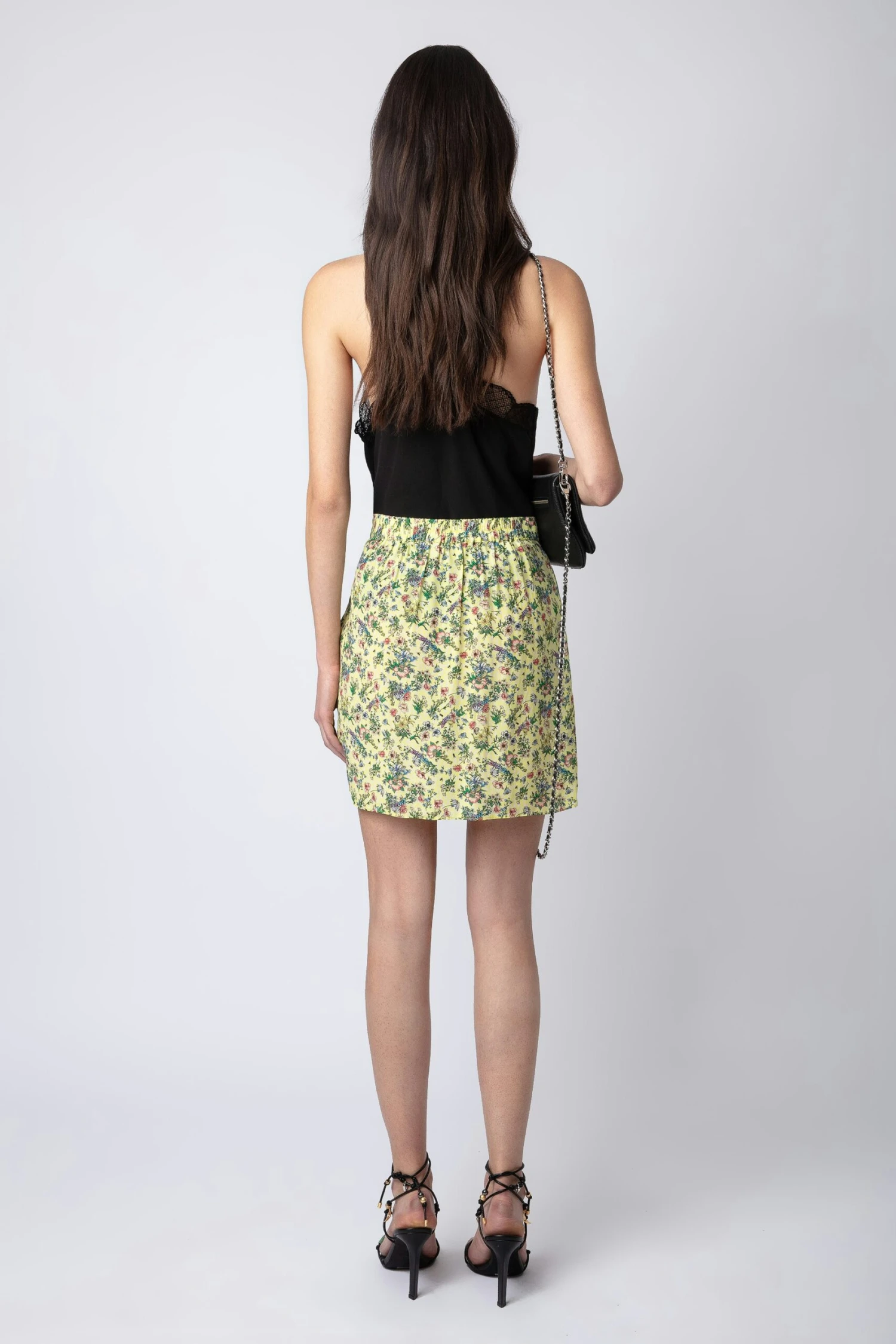 – Women’s yellow floral mini skirt – Side zipper closureModel is 174 cm / 5′ 8″ and is wearing a size S