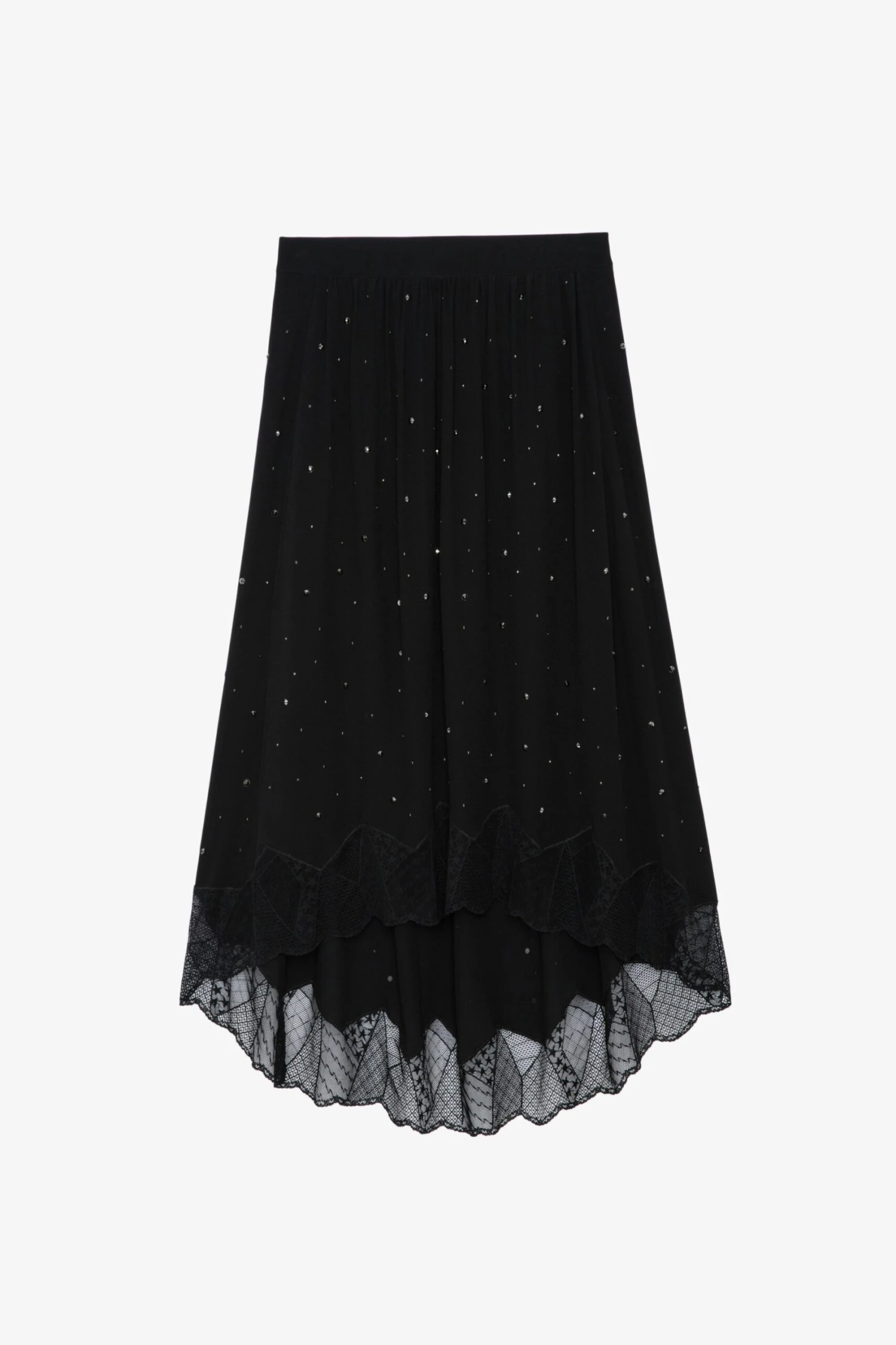 An iconic Zadig&Voltaire style, the Joslin skirt takes pride of place in the most rock‘n’roll wardrobes. With its airy material and lace trim, it promises a light, bohemian look. This season it is revamped with glittering rhinestones all over. – Zadig&Voltaire women’s black skirt – Mid-length – Rhinestone-embellishment – High-low hemline – Contrasting lace edges – Made in China – Product code: WWSK00337_NOIR