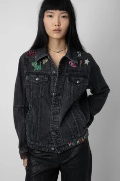 – Women’s grey denim oversized jacket – Multicolored embroidered motifs, overstitching and raw edges – 2 flap patch pockets on the chest and 2 side pockets – Button closure, tightening tab and “Zadig Denim” leather jacron on the back – Long sleeves and buttoned cuffs Model is 177 cm / 5′ 9″ and is wearing a size S**Fibers from organic farming