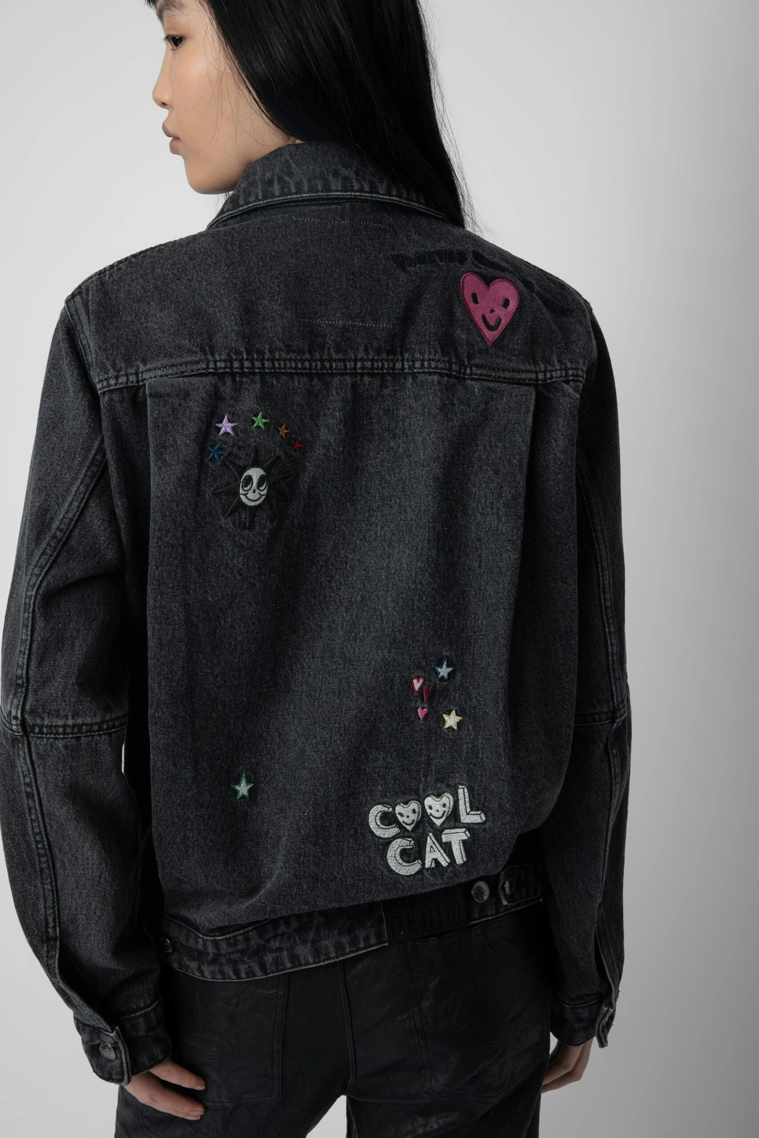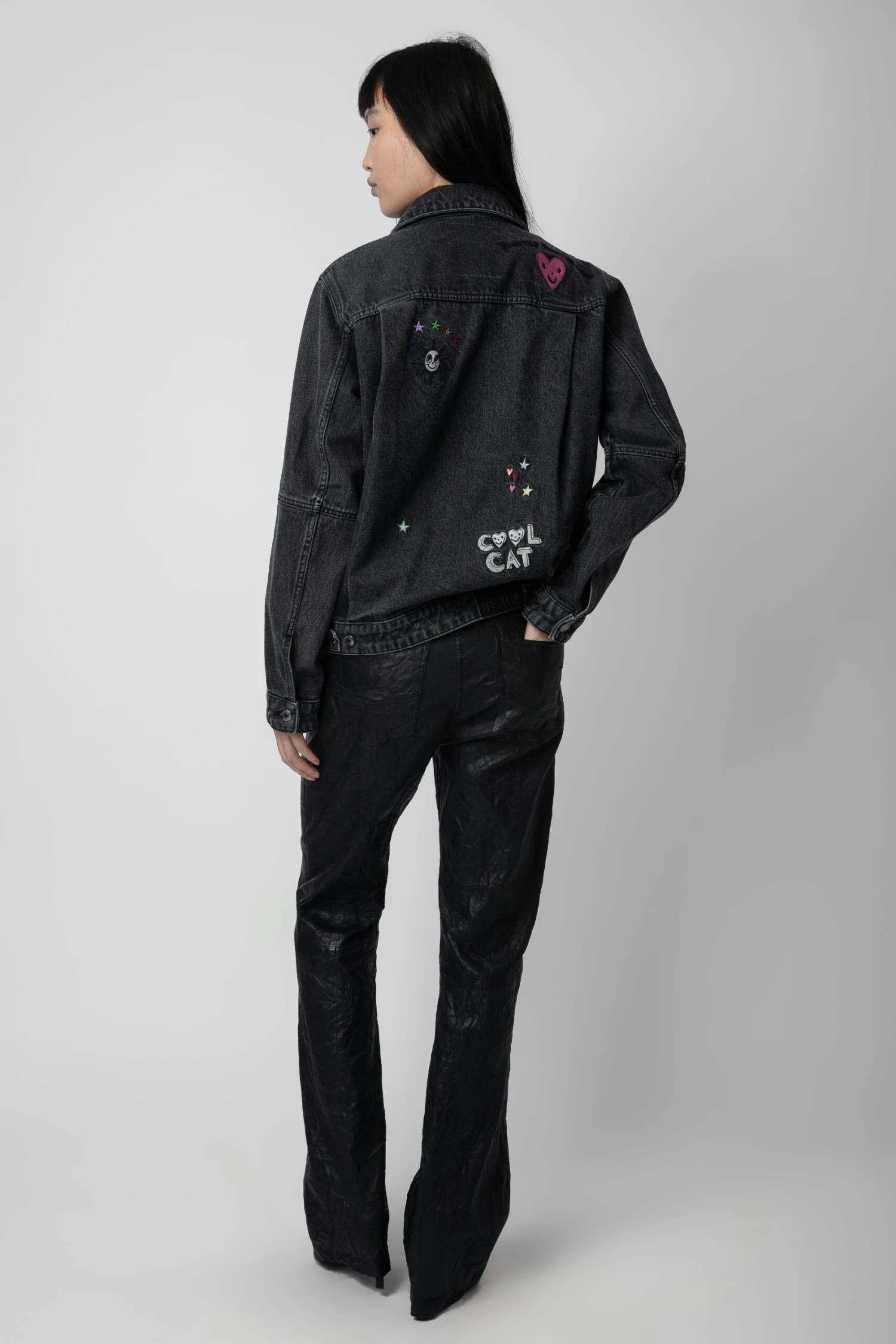 Grey denim oversized jacket with embroidered motifs and overstitching.