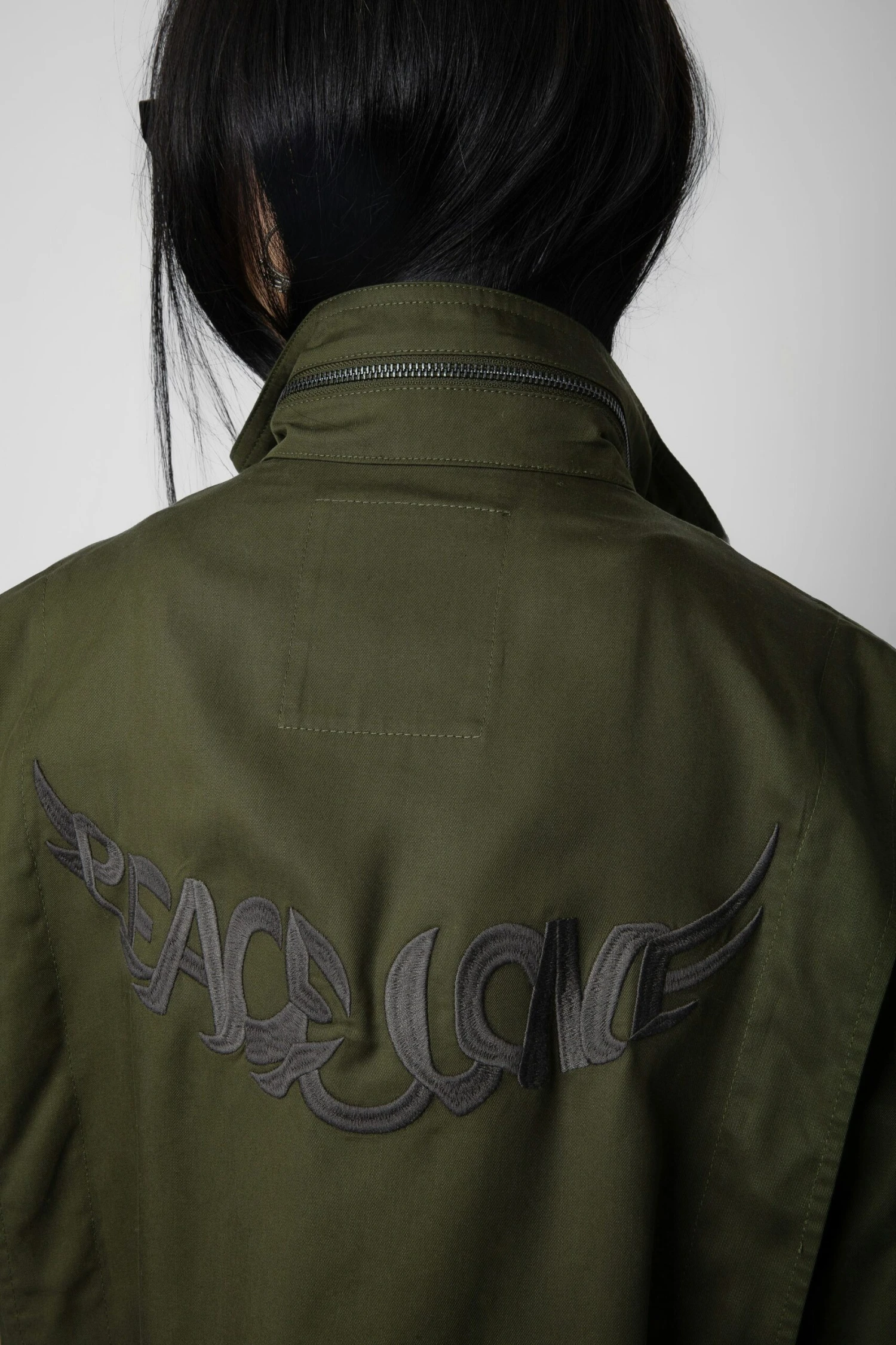 – Women’s khaki military style jacket – Two side slit pockets – Two chest flap pockets with button closure – Zipper and button closure down front – High collar with snap button closure and zipper – Contrast stitching on shoulder Model is 174 cm / 5′ 8″ and is wearing a size S