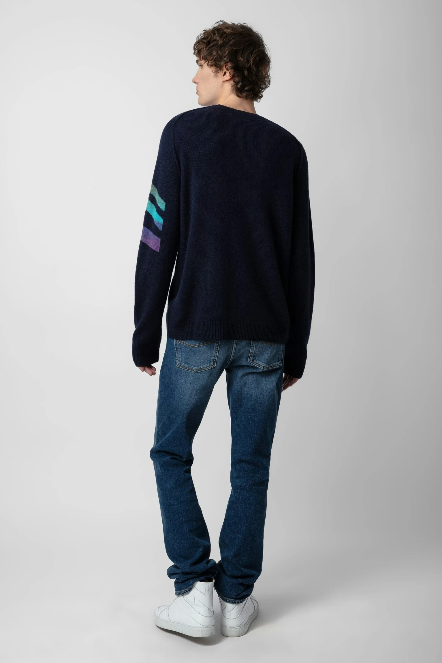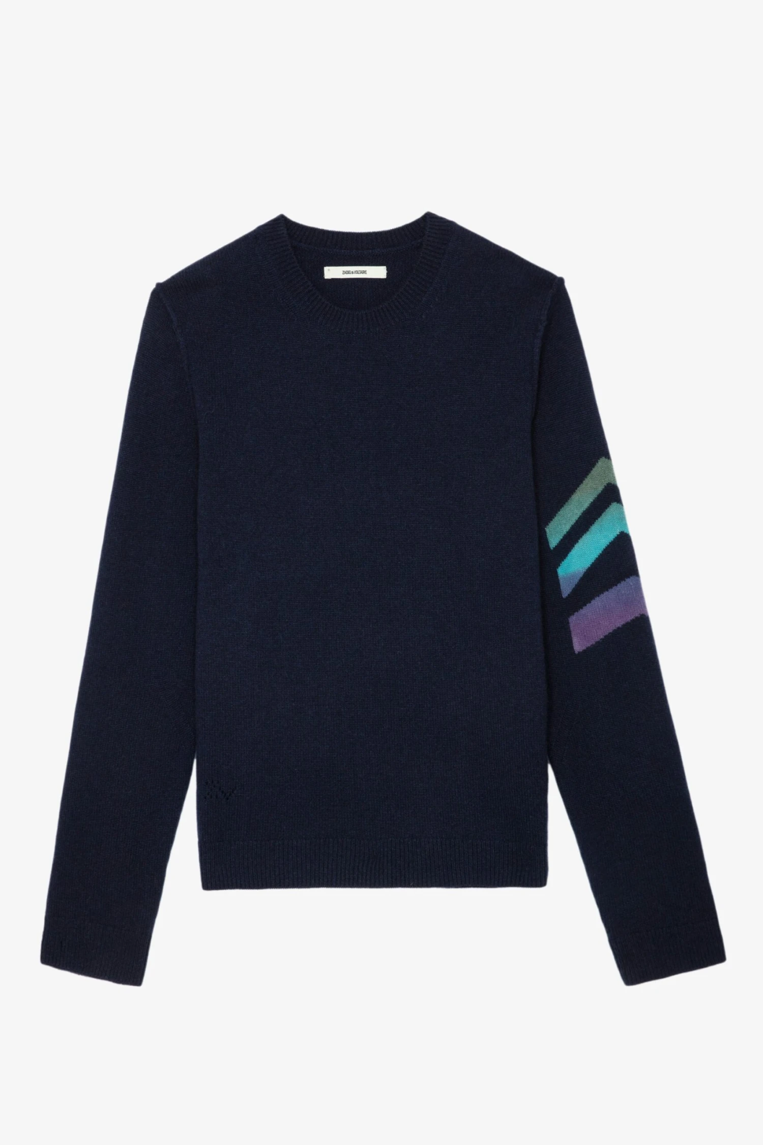 Navy blue cashmere round-neck jumper with tie-dye arrows on the left sleeve.
