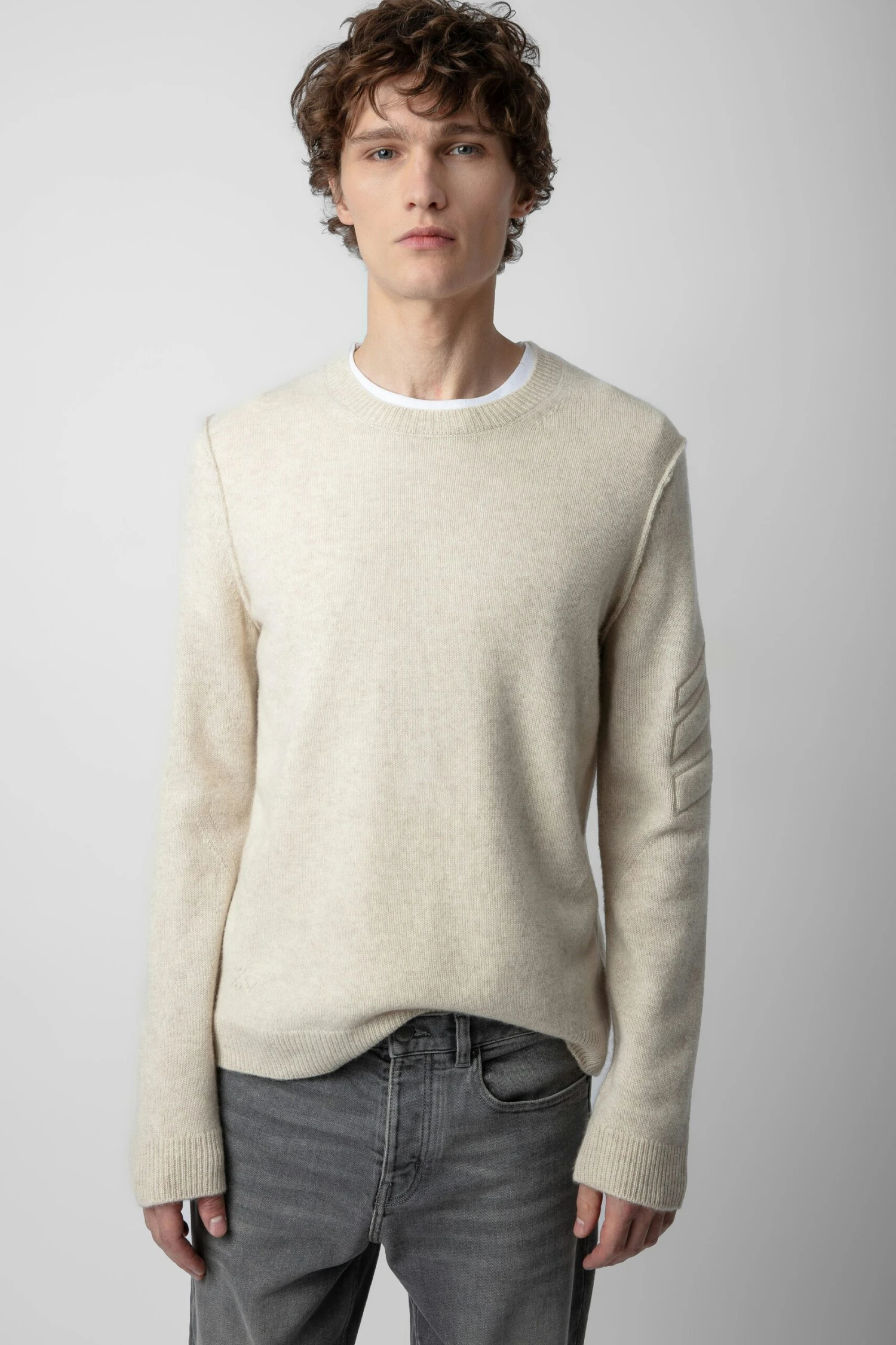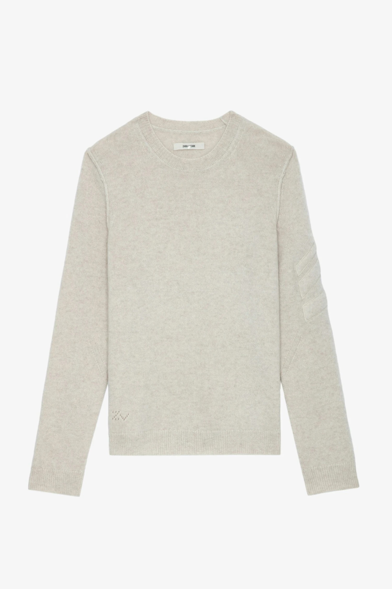 Ecru cashmere round-neck sweater with arrows on the left sleeve.