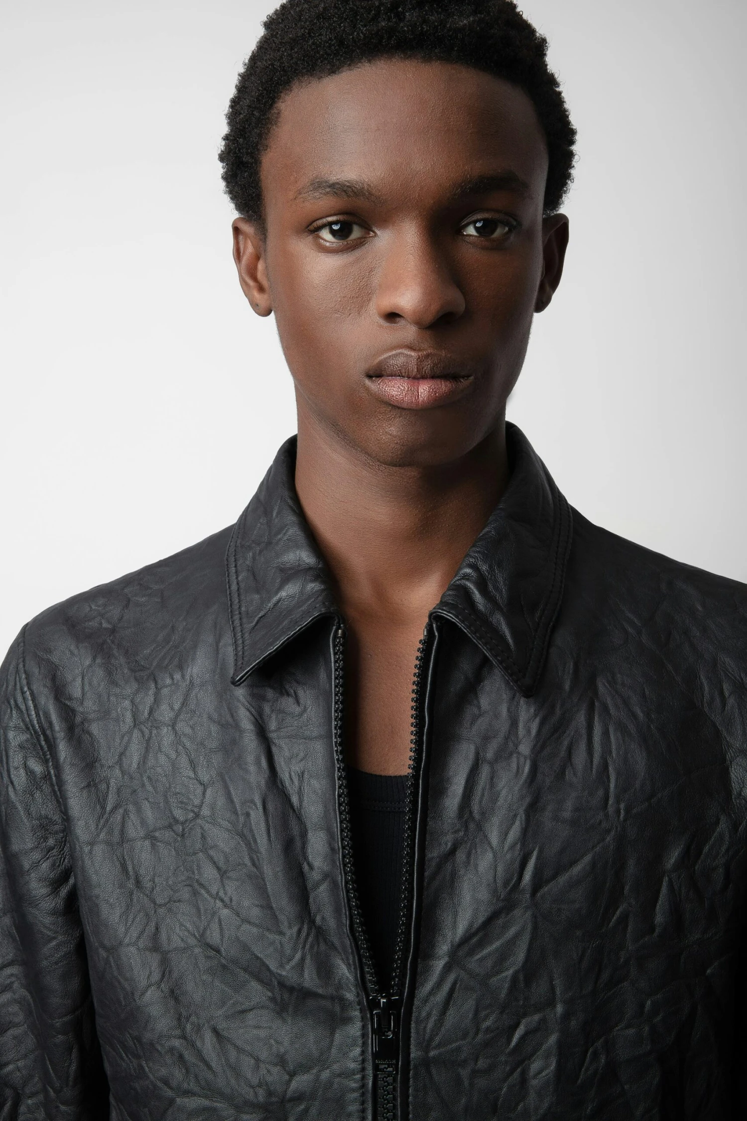 Straight-cut black crinkled leather jacket with long sleeves and zip fastening.
