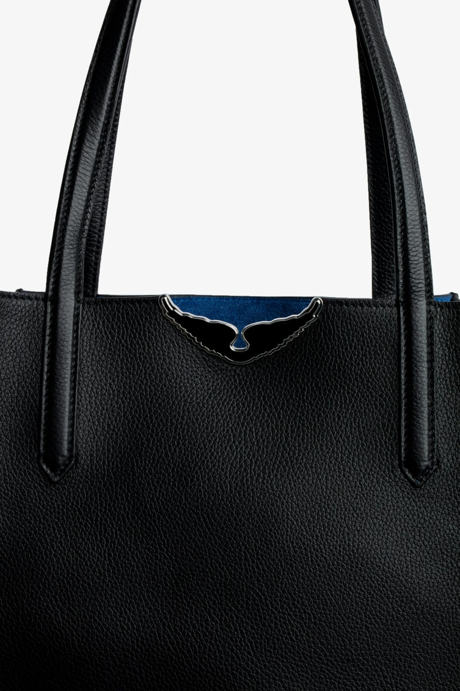 Women’s tote bag in black grained leather and blue suede with black lacquered wings