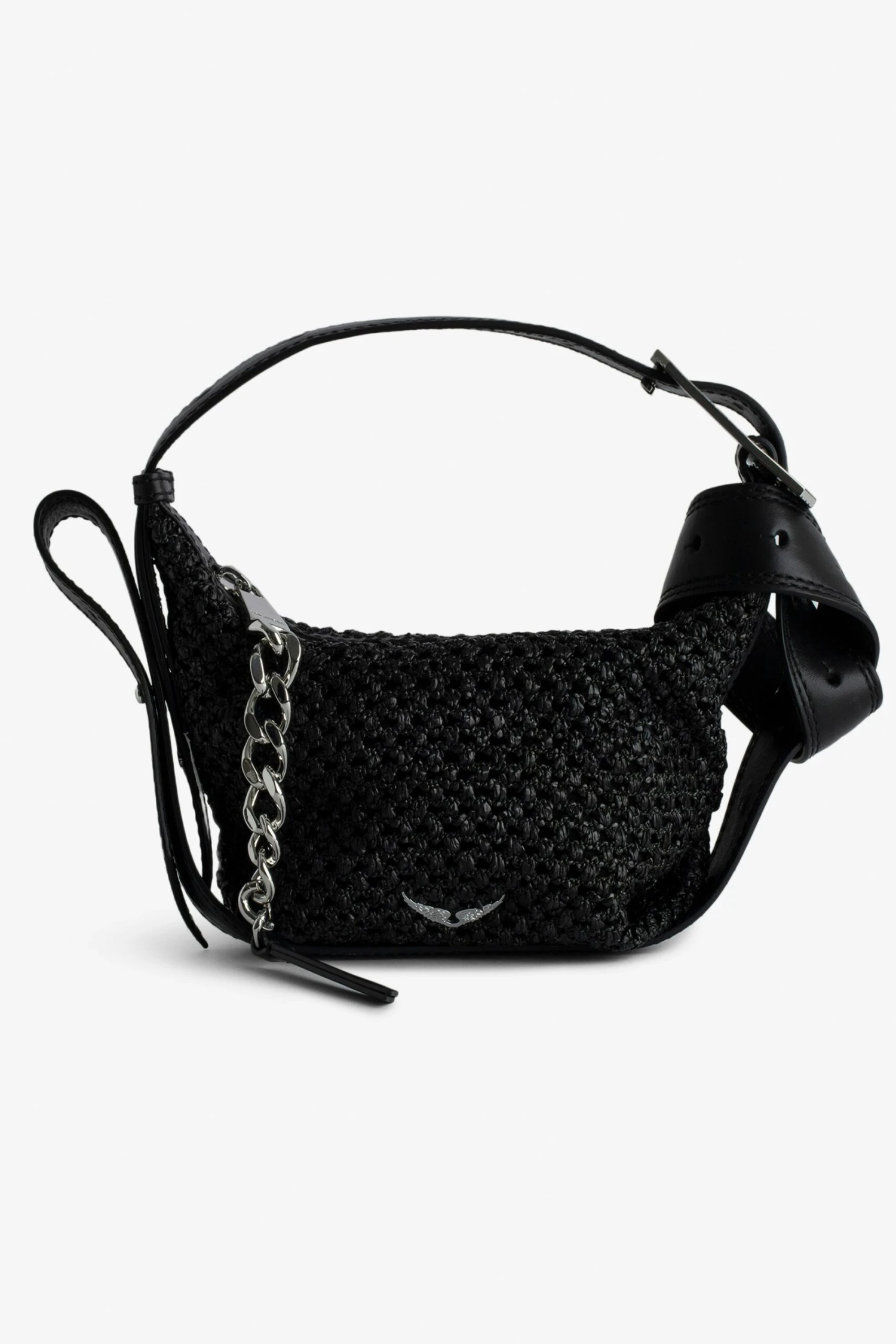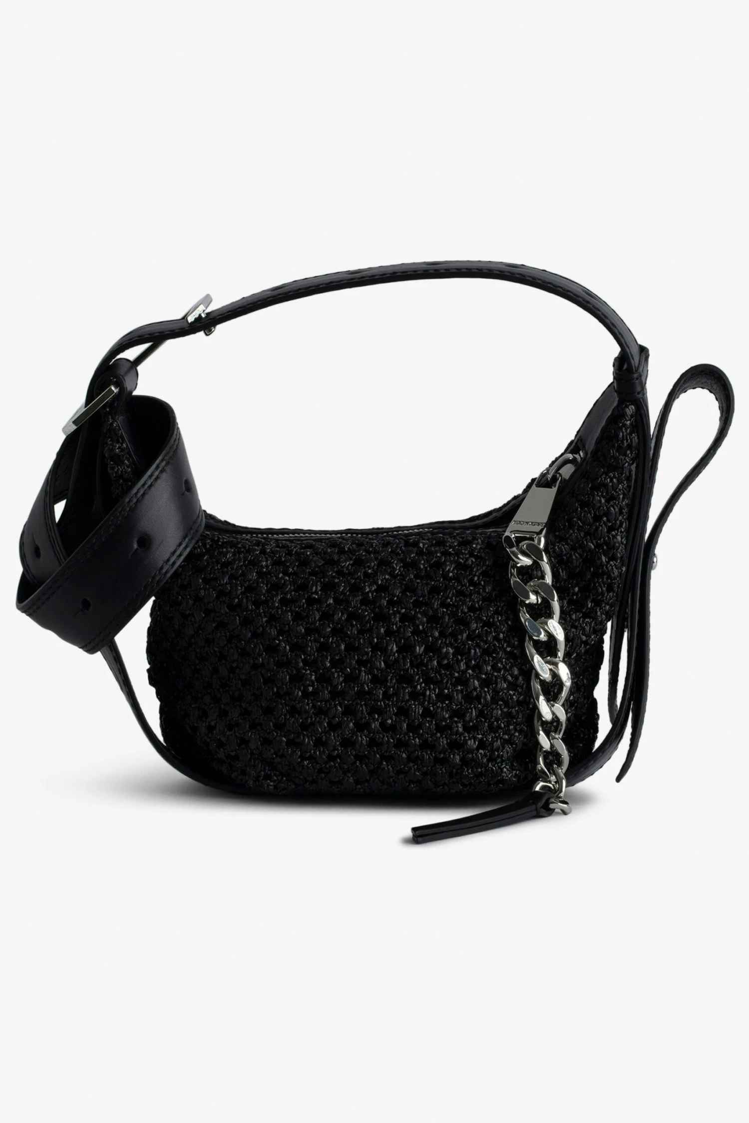 Small black basket-style bag with leather shoulder strap and metallic C buckle.