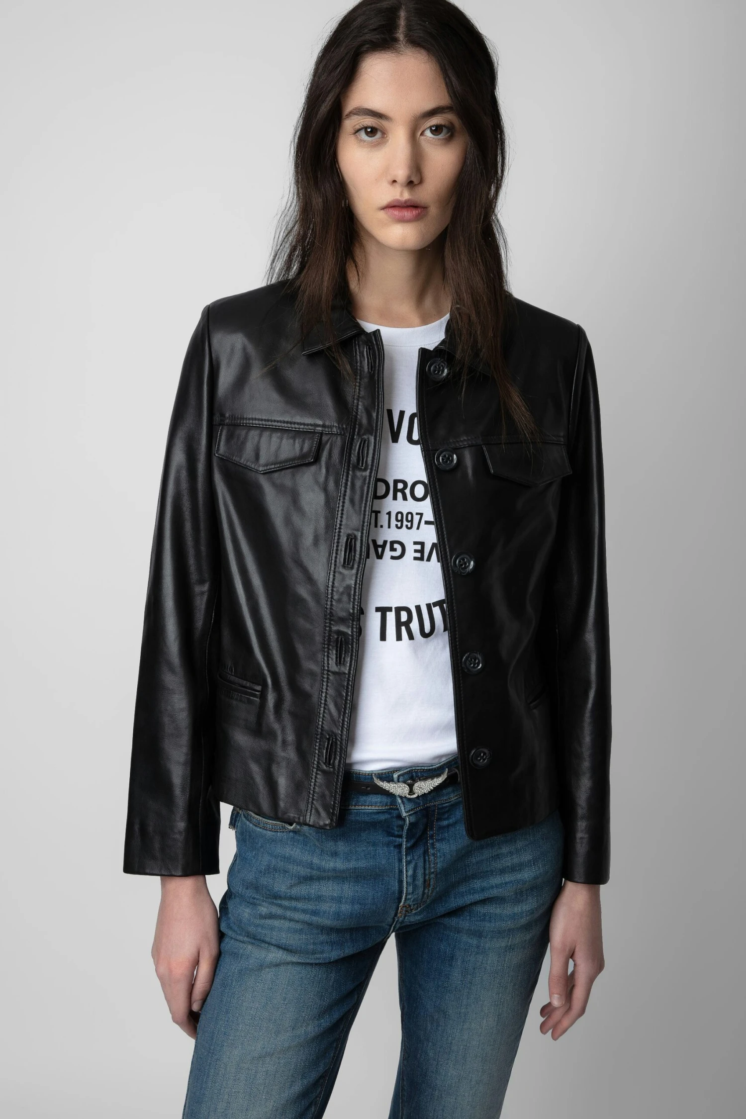Our iconic Liam jacket in black leather is a look-defining piece that will structure your silhouette with style. – Zadig&Voltaire Women’s black leather jacket – Shirt collar – Button closure – 2 patch pockets on the chest – 2 welt side pocketsModel is 178 cm / 5′ 10″ and is wearing a size S