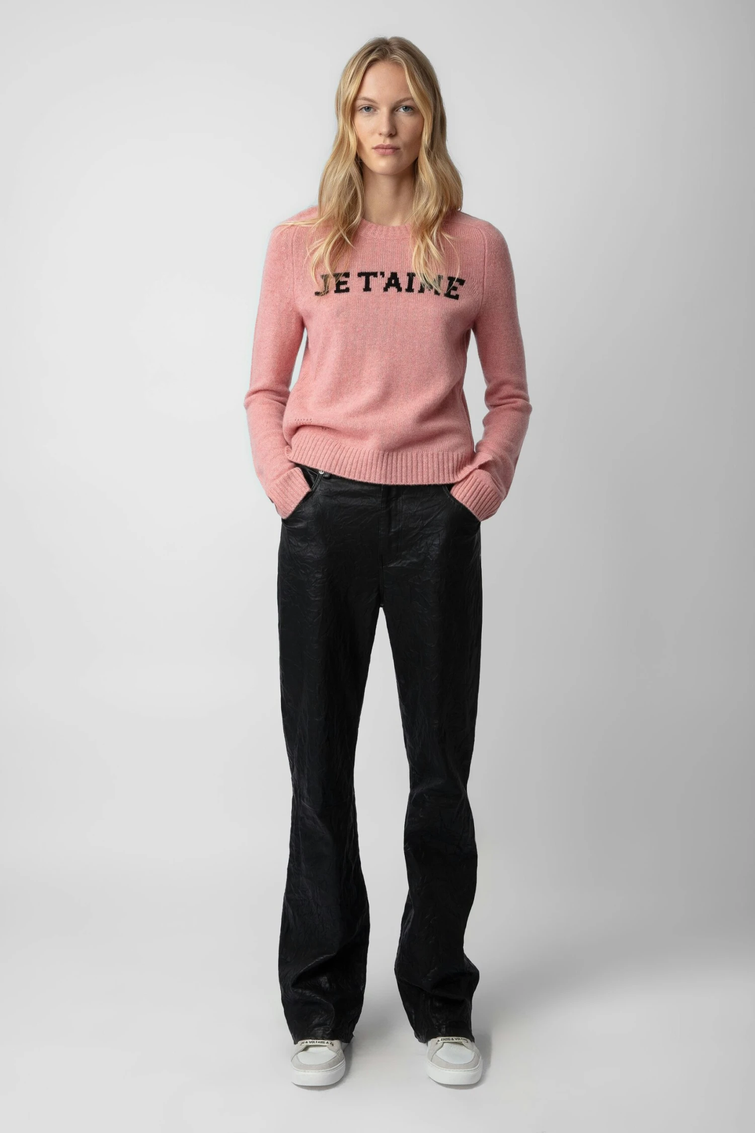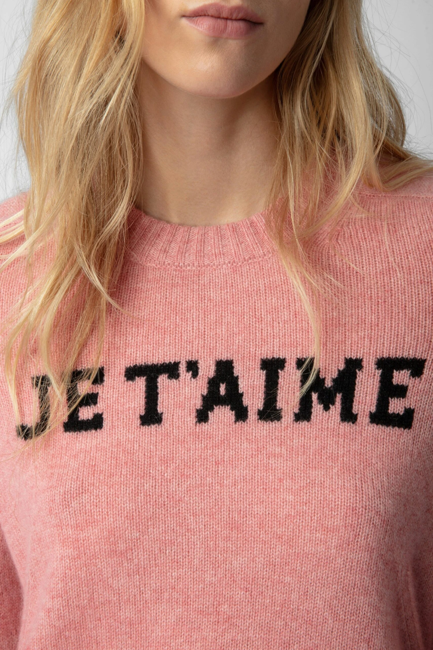Women’s pink cashmere sweater with “Je T’aime” slogan on front.