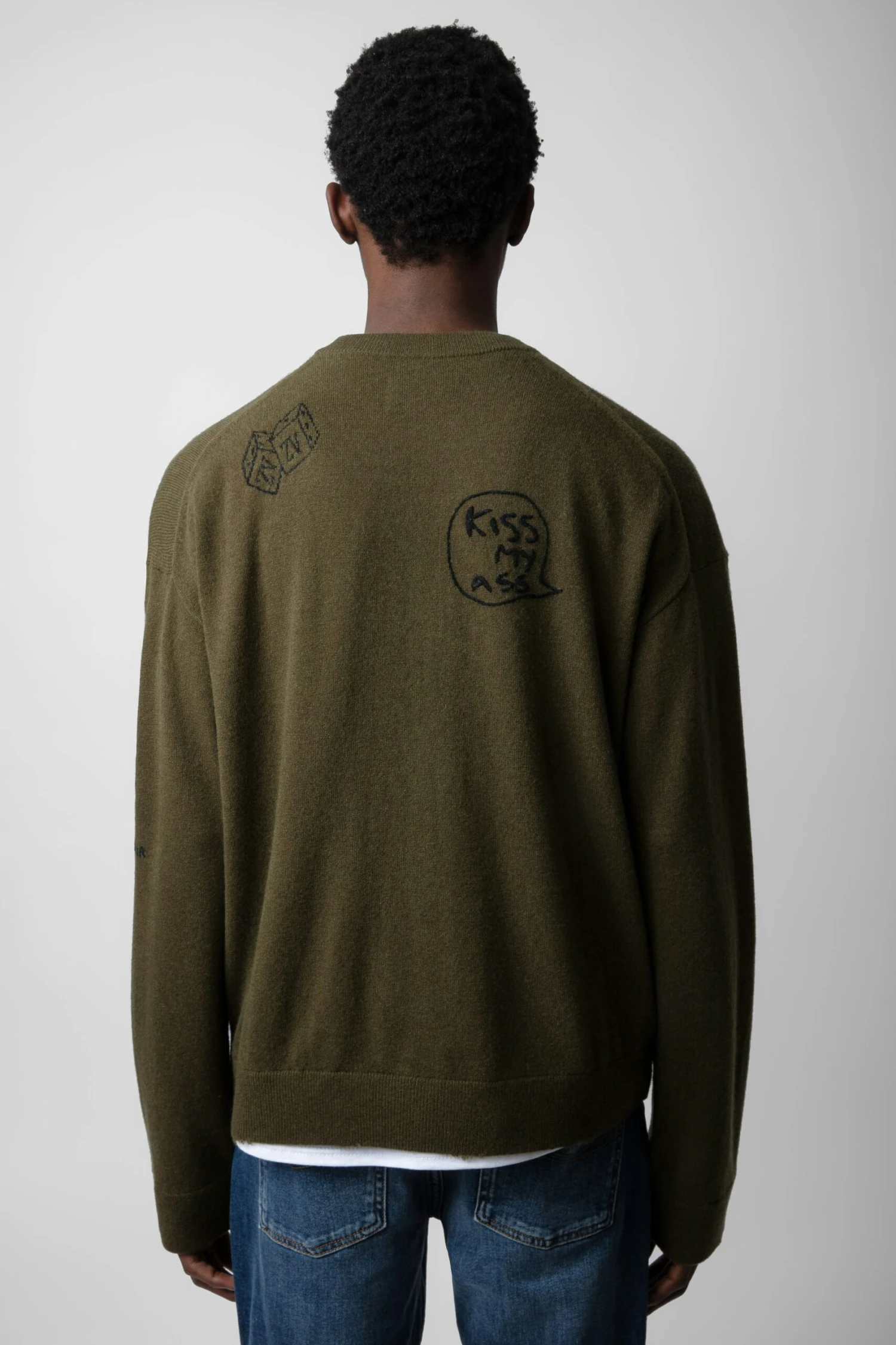 The Marko jumper is part of the UNISEX collection. A free-spirited wardrobe by Zadig&Voltaire, the UNISEX collection represents the fusion of feminine and masculine features. Customized details designed by Humberto Cruz, an artist and illustrator from San Diego. Influenced by pop culture, fashion and colors, he describes his work as spontaneous and quirky. – Unisex Used Khaki wool and cashmere jumper – Graffiti motifs and contrasting “Be Fucking Nice” and “Kiss My Ass” slogans – Round neckline – Long sleeves and ribbed trim *Contains 70% RWS certified woolThe Responsible Wool Standard (RWS) guarantees animal welfare and respect for pastures. It also ensures end-to-end traceability of the wool through the supply chain
