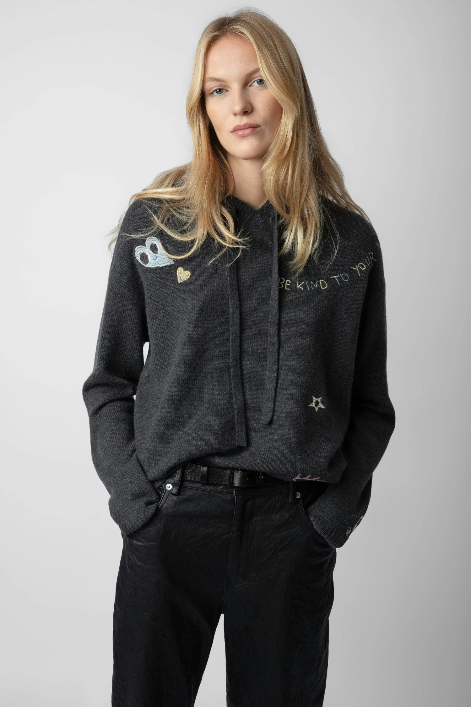 Customized details designed by Humberto Cruz, an artist and illustrator from San Diego. Influenced by pop culture, fashion and colors, he describes his work as spontaneous and quirky. – Women’s Slate khaki grey cashmere jumper – Drawstring hood – Long sleeves and ribbed trim – Contrasting slogans Model is 180 cm / 5′ 10″ and is wearing a size S The cashmere for this product is produced according to The Good Cashmere Standard® by AbTF. The standard ensures the welfare of the cashmere goats, protects natural resources and supports the local farmers that produce it.