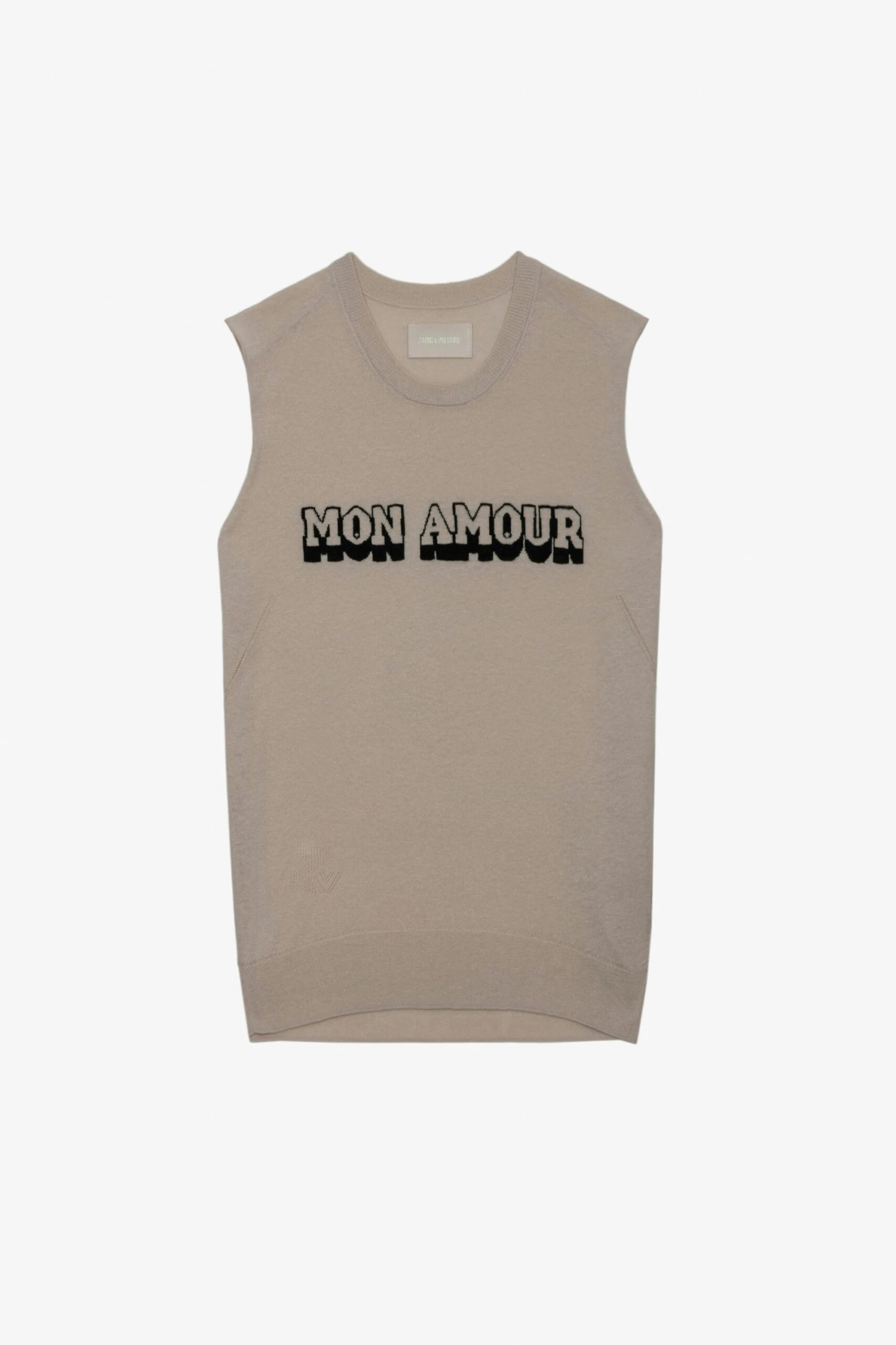 Light pink linen sleeveless top with intarsia jacquard “Mon Amour” slogan.
