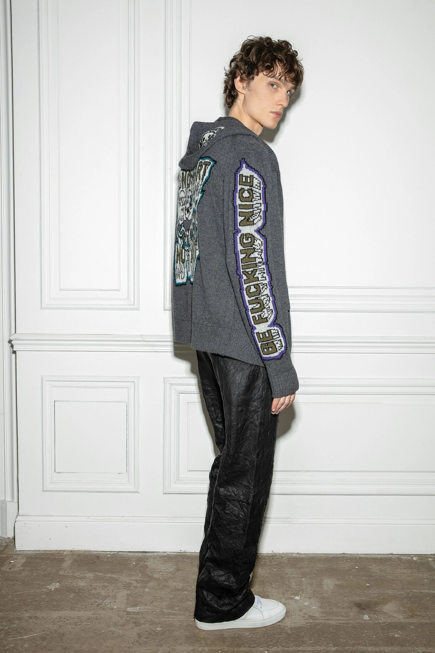 Customized details designed by Humberto Cruz, an artist and illustrator from San Diego. Influenced by pop culture, fashion and colors, he describes his work as spontaneous and quirky. – Men’s anthracite wool and cashmere cardigan – Drawstring hood – Long sleeves and ribbed trim – Zip fastening and 2 side pockets – Graffiti motifs and “Be Fucking Nice” and “No Heart No Art” slogans Model is 187 cm / 6′ 1″ and is wearing a size M/L*Contains 70% RWS certified woolThe Responsible Wool Standard (RWS) guarantees animal welfare and respect for pastures. It also ensures end-to-end traceability of the wool through the supply chain