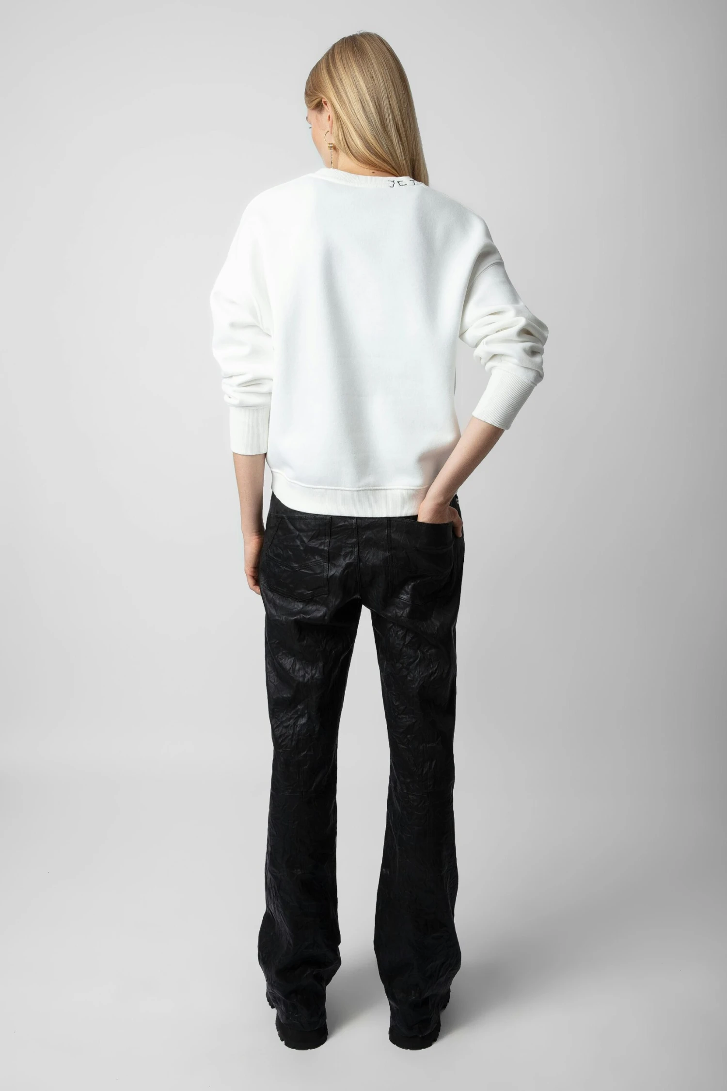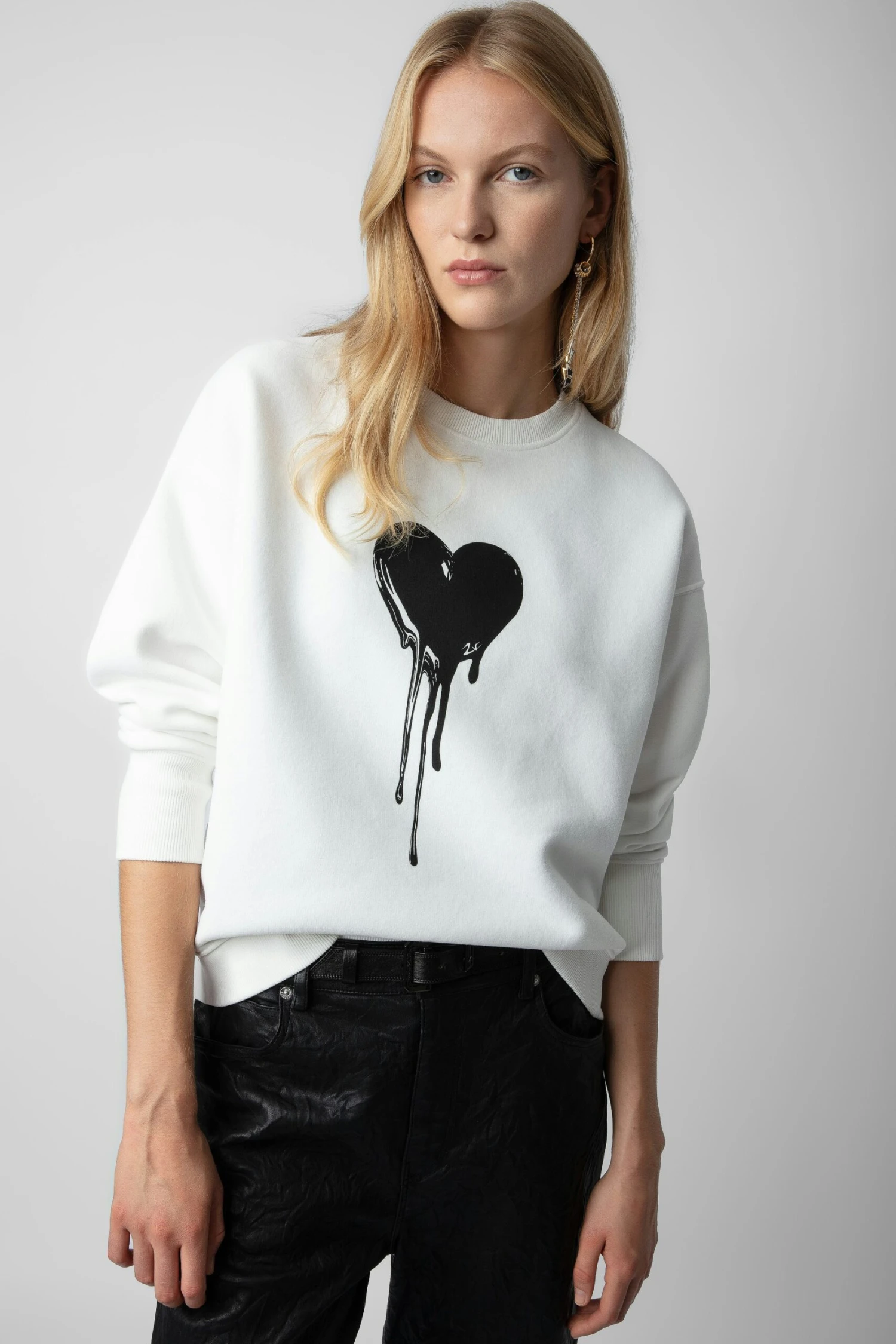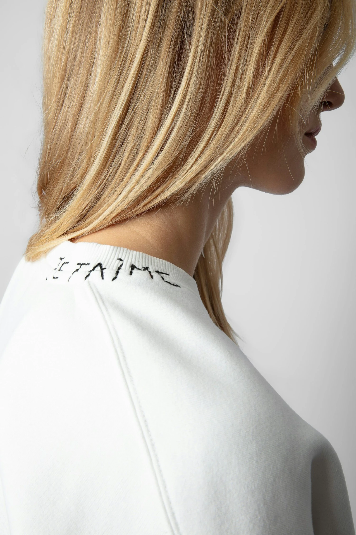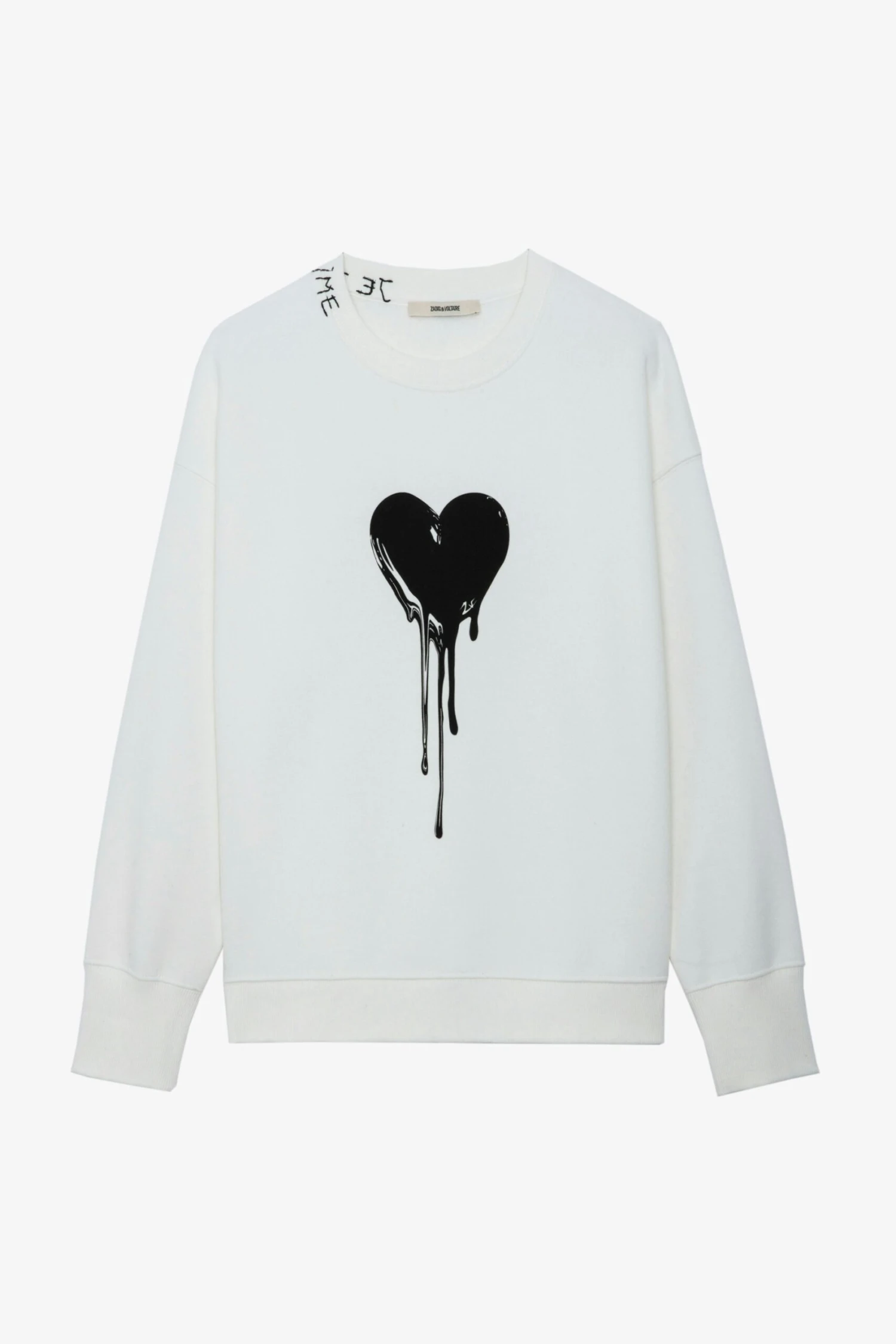Ecru long-sleeved sweatshirt with melting heart motif and slogan embroidery on the collar.