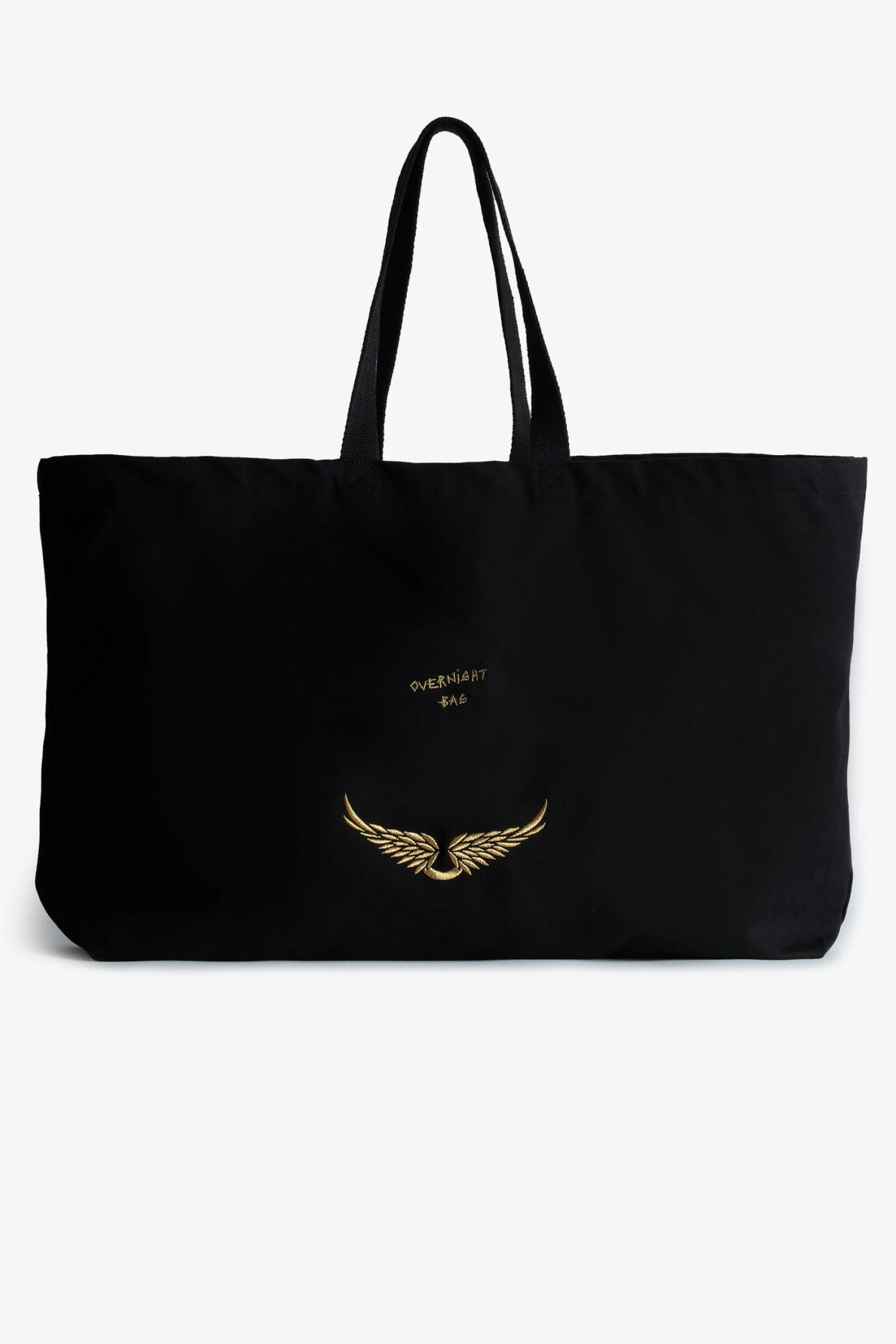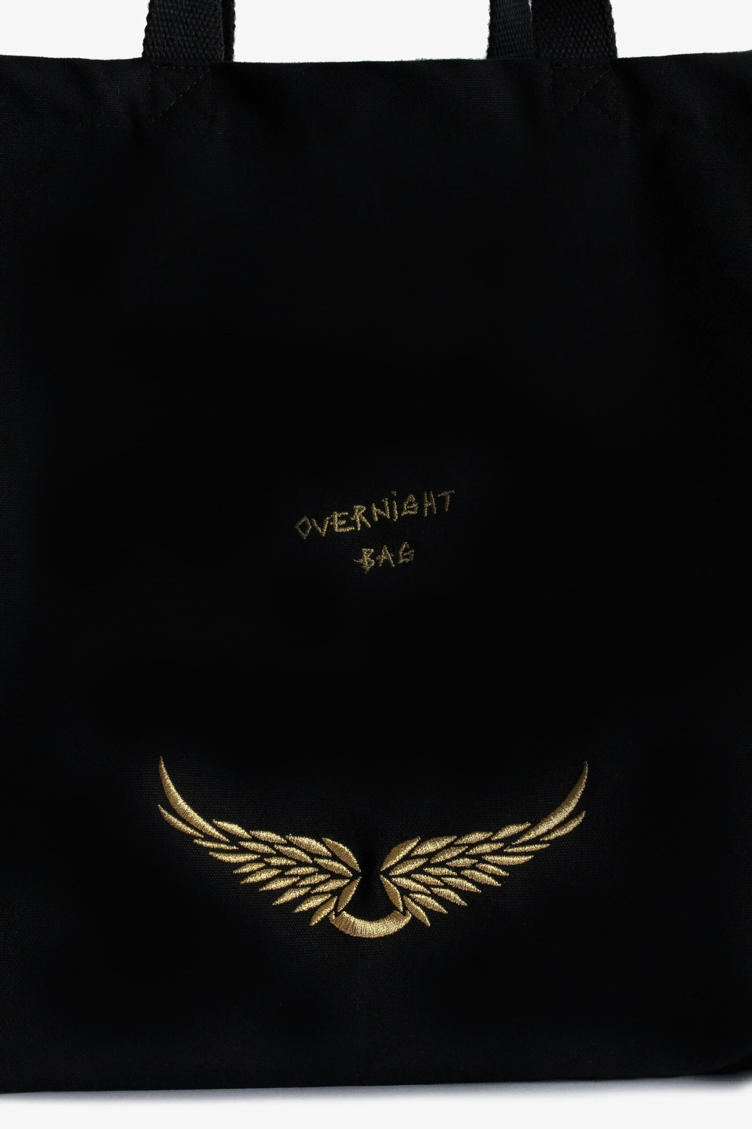 ‘The Overnight Tote Bag is part of the VOLTAIRE VICE capsule. Zadig&Voltaire is experimenting with a new creative space, where freedom is the watchword. The brand is adding its signature to everyday objects that are both practical and decorative, where design is as important as purpose. – Black organic cotton tote bag – Tone-on-tone Zadig&Voltaire signature, gold wings motif and “Overnight Bag” slogan – Handles, carry by hand or over the shoulder