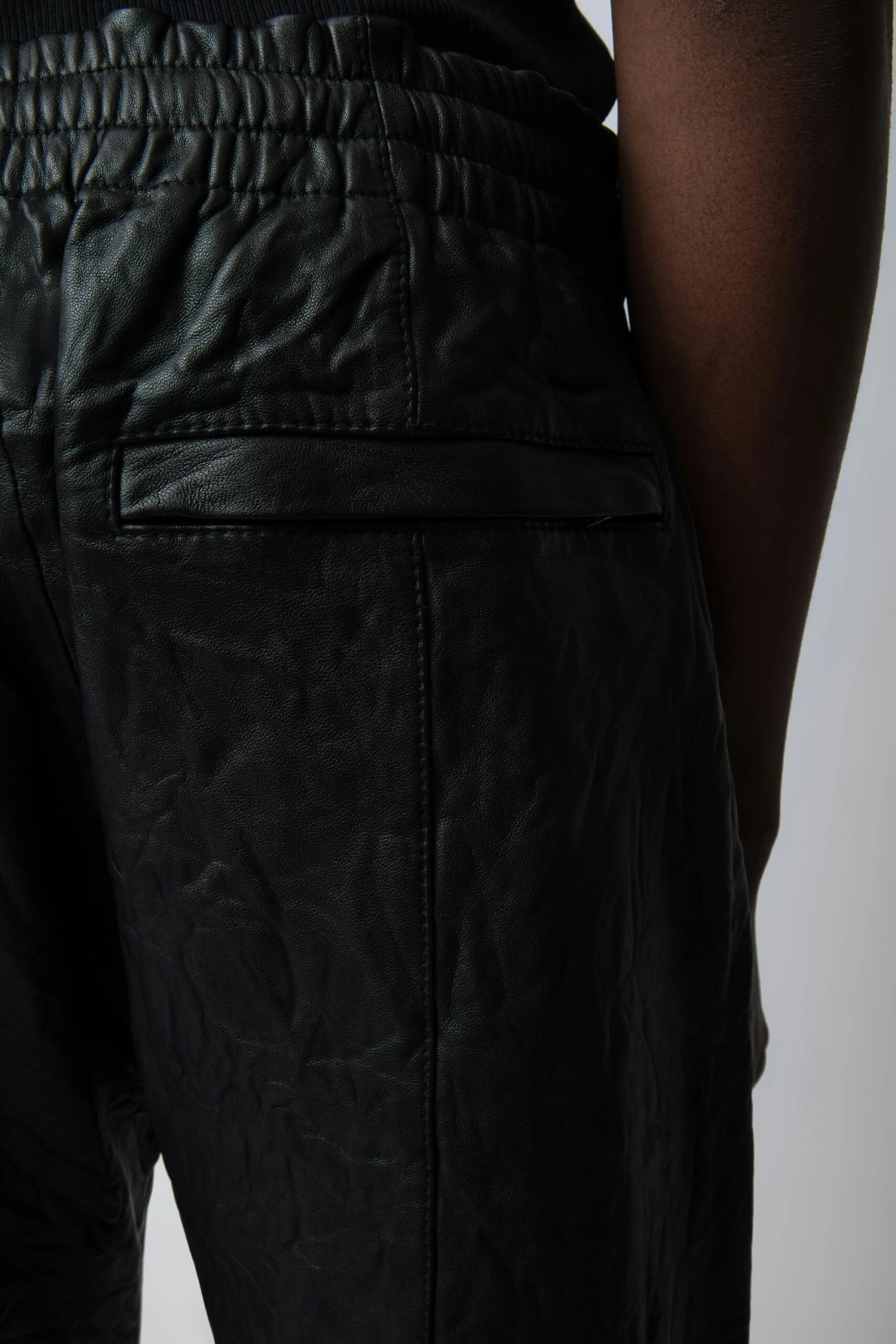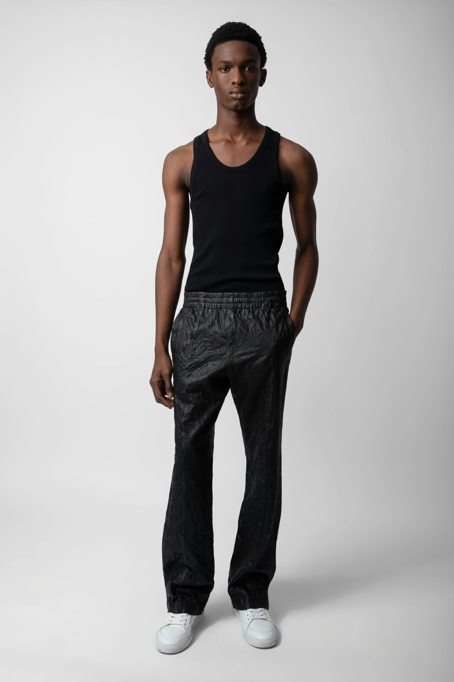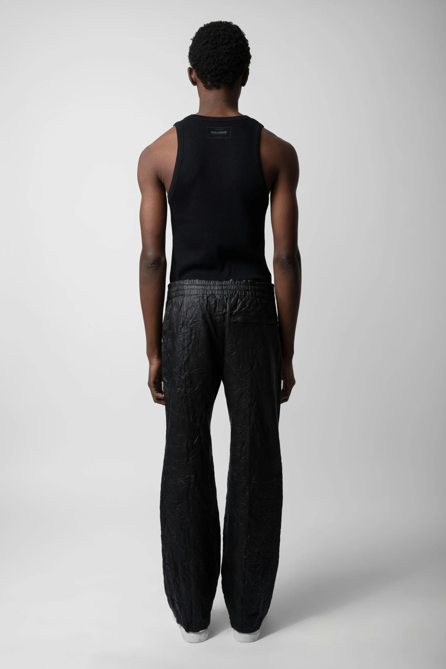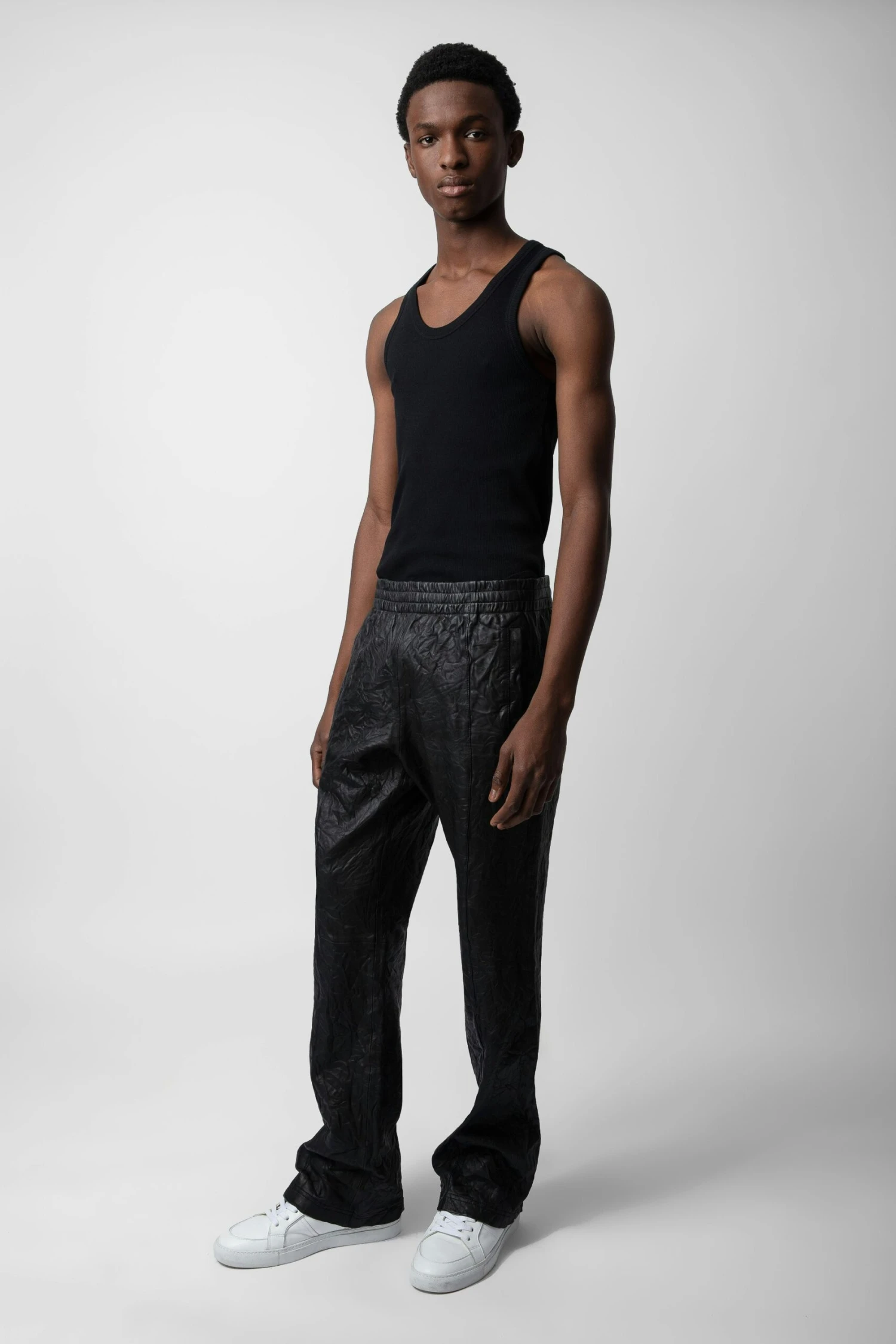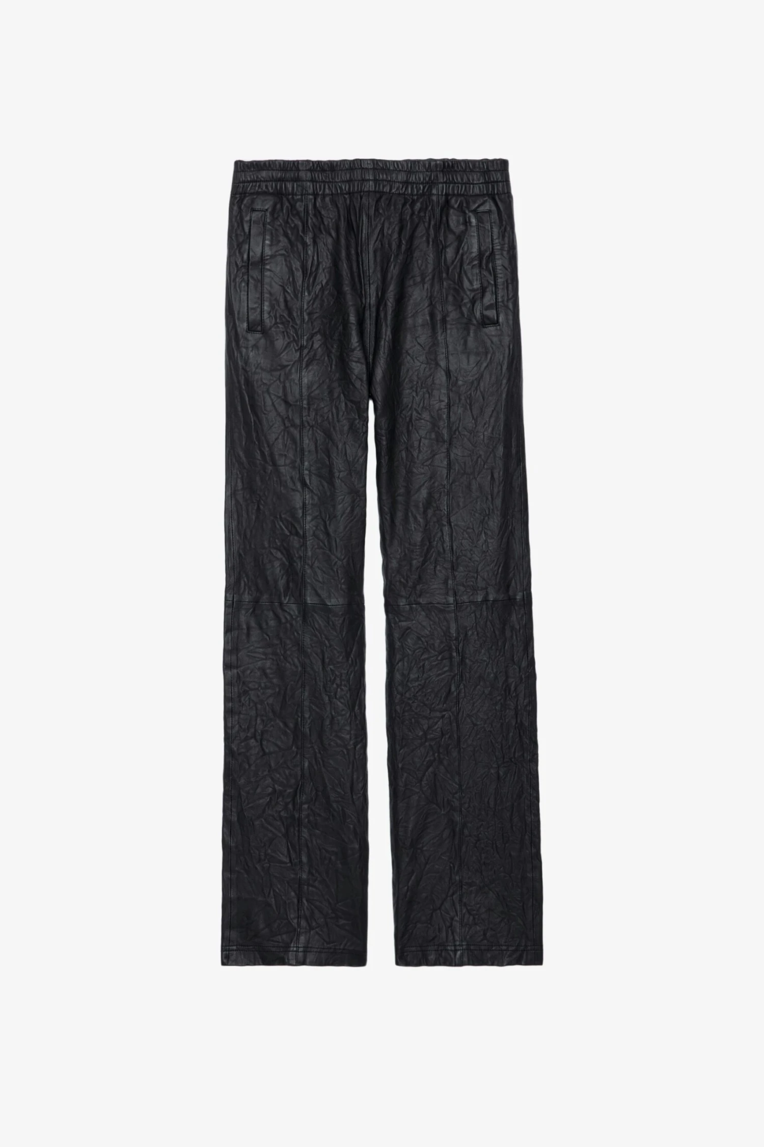 The Pacha trousers are part of the UNISEX collection. A free-spirited wardrobe by Zadig&Voltaire, the UNISEX collection represents the fusion of feminine and masculine features. – Unisex black crinkled leather trousers – Flared hem – Elasticated waistband – Pleat in middle of leg – 2 side pockets and 1 zip pocket on the back Model is 188 cm / 6′ 2″ and is wearing a size MThe Leather Working Group/LWG is a membership organization comprised of brands, suppliers, leather manufacturers and other stakeholders within the leather manufacturing industry. The group has developed an auditing program which certifies leather manufacturing facilities based on their environmental compliance and performance capabilities