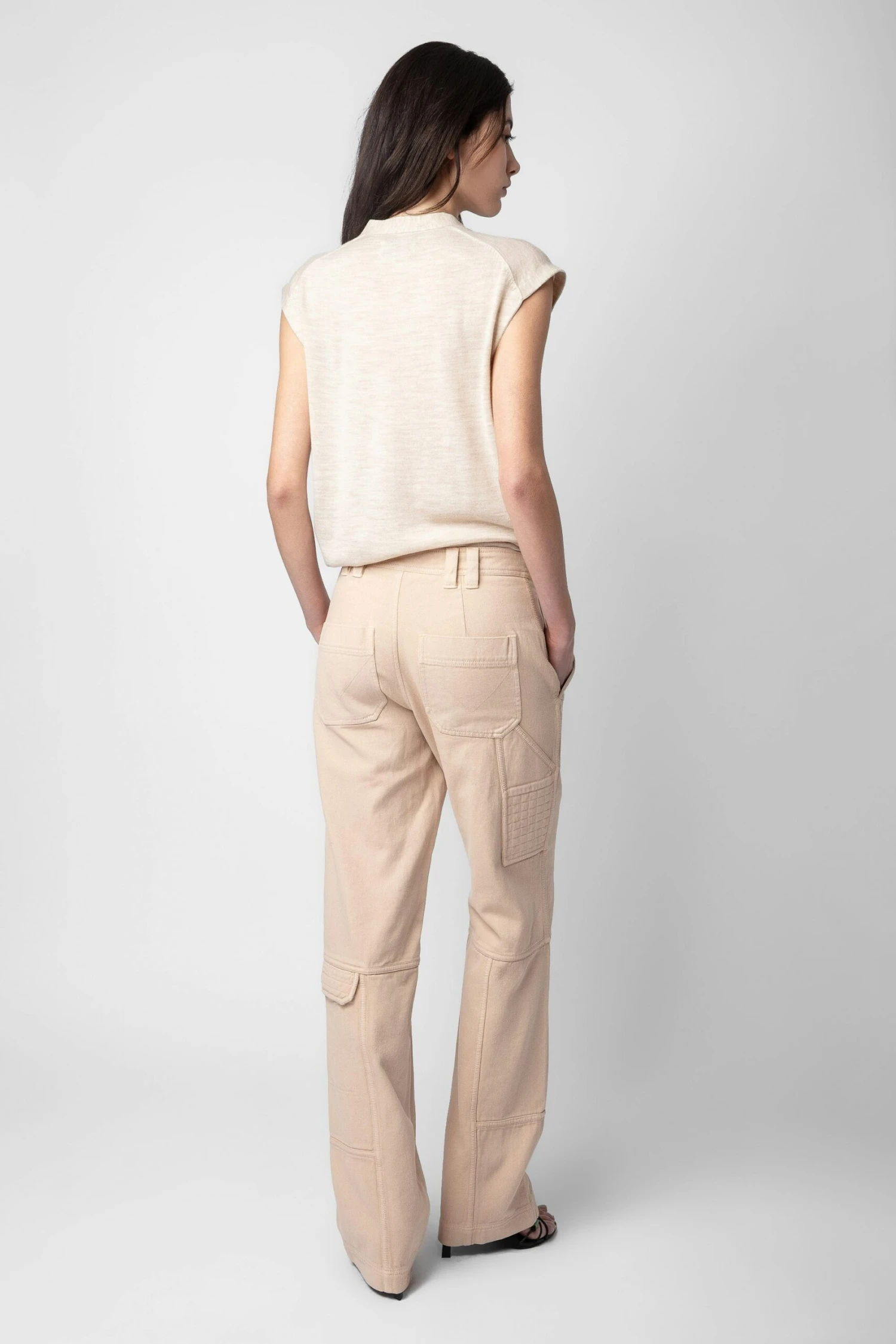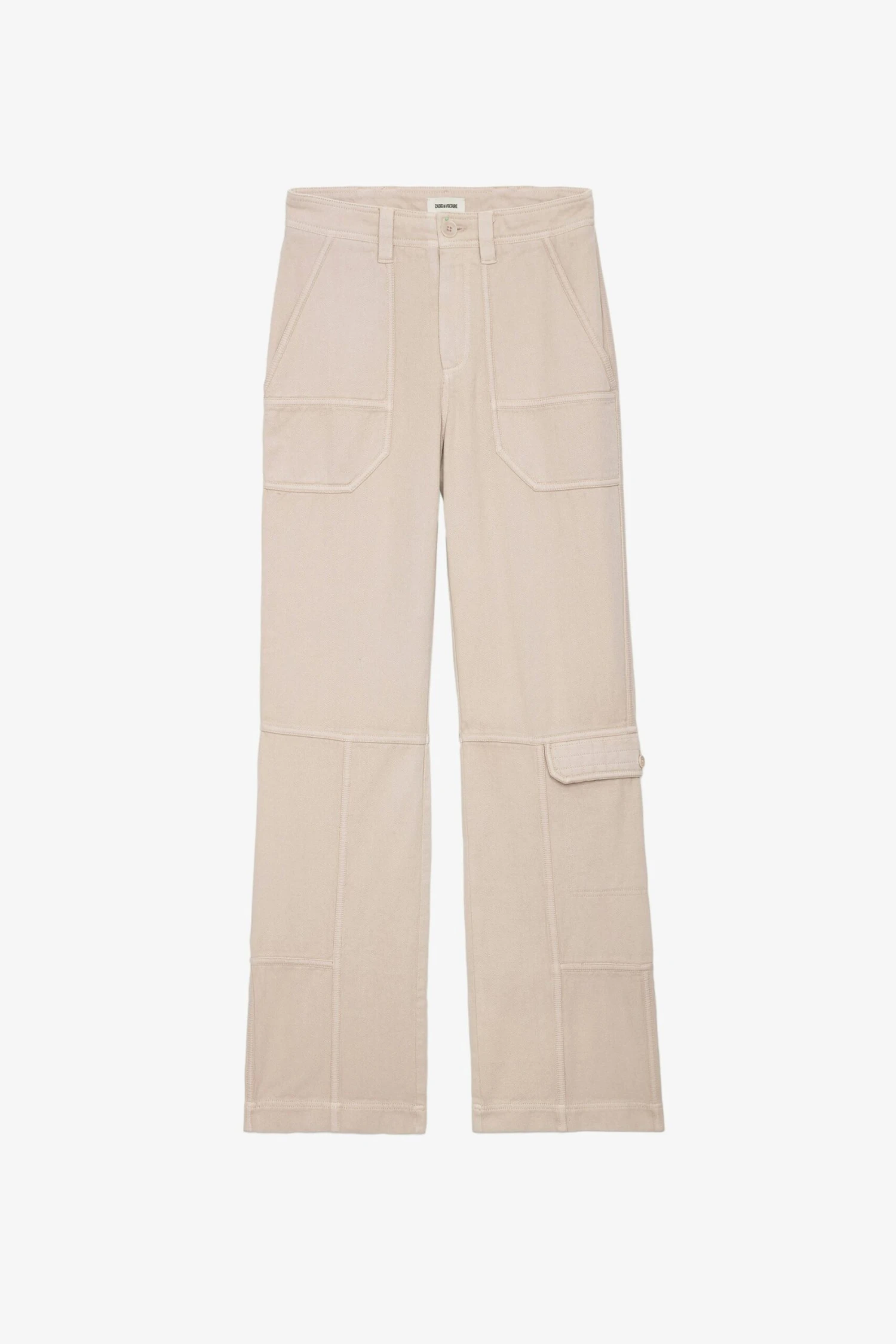 – Women’s Sugar beige cotton twill pants – High rise – Textured panels, contrasting details and piping – 2 side pockets, flap pocket, 2 patch pockets on the back – Zip and button fly and belt loops – Wide leg at hem Model is 178 cm / 5′ 10″ and is wearing a size S**Fibers from organic farming